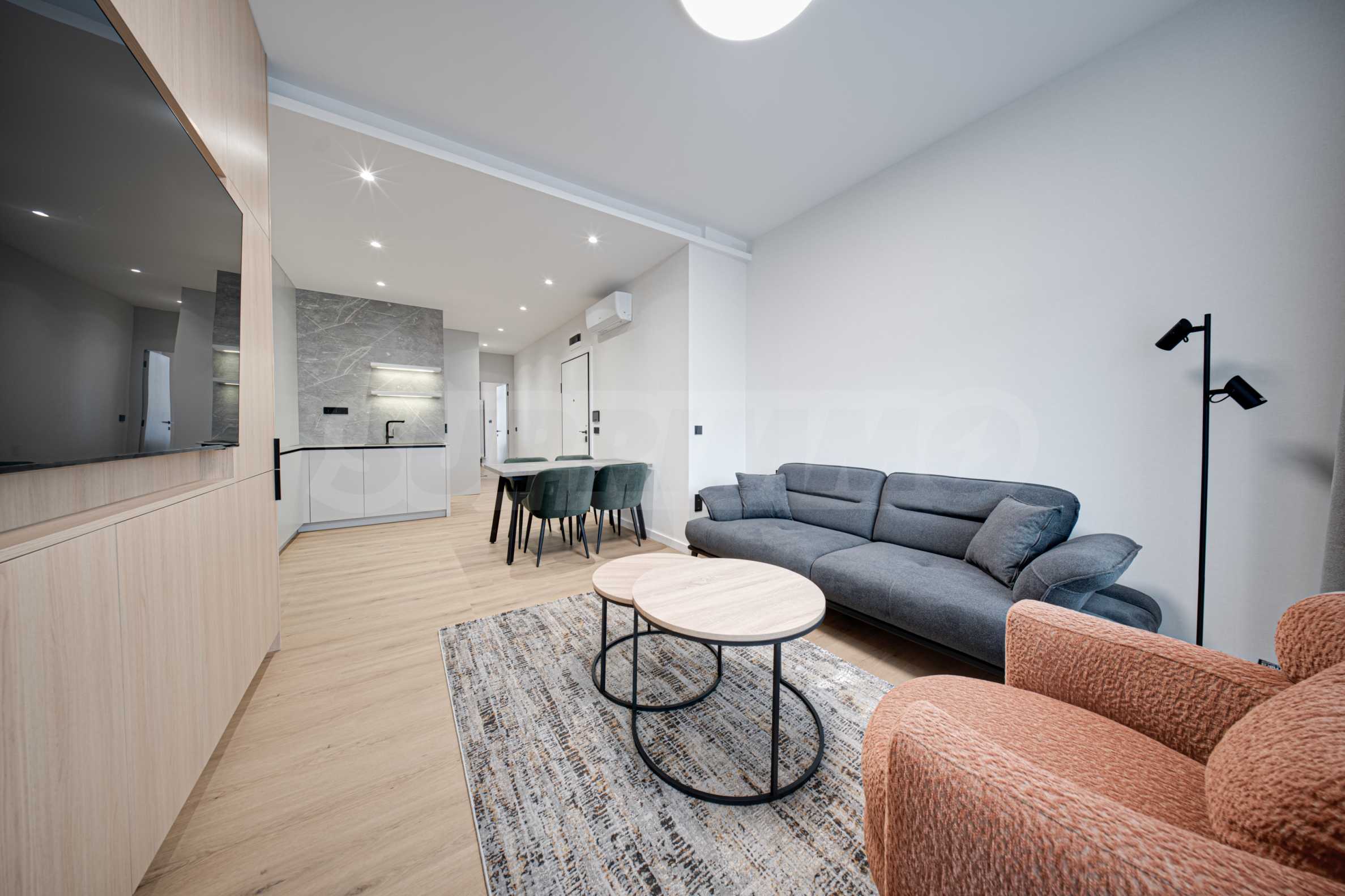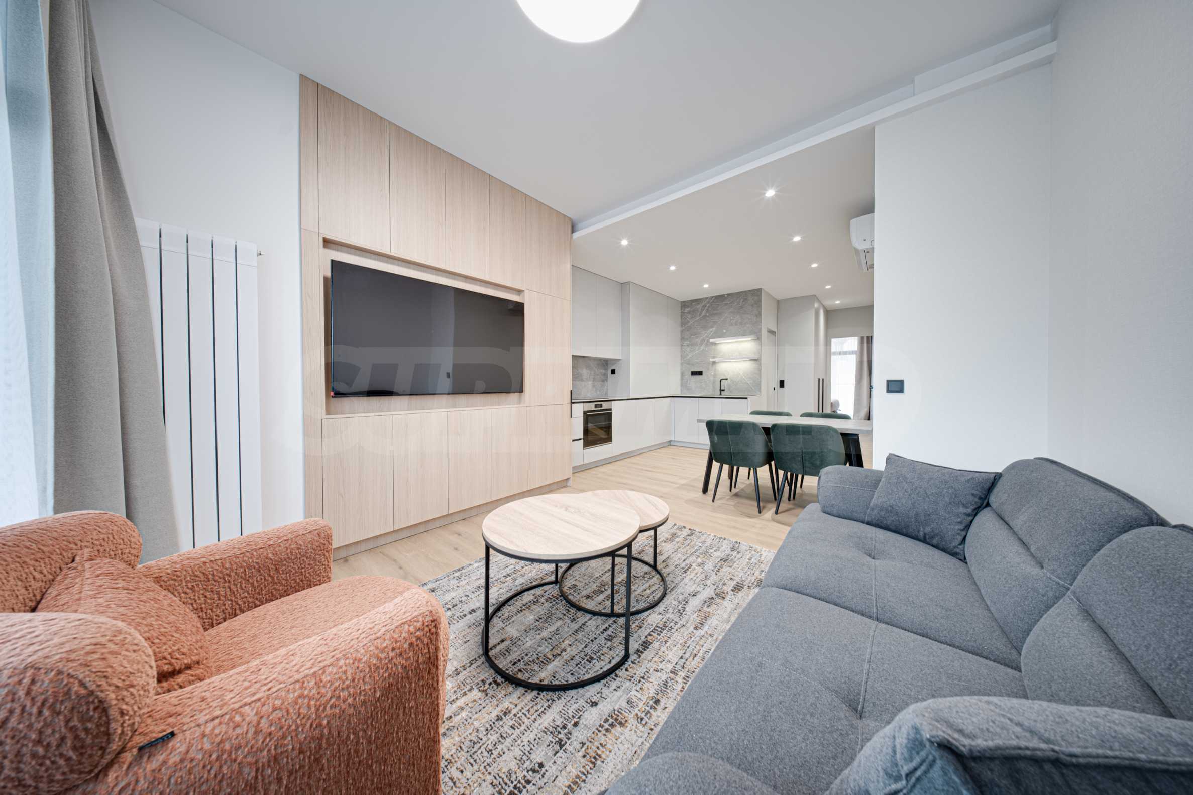 Светъл хол с диван, секция, ЛЕД телевизор, трапезарна част с маса и столове, и излаз на остъклен балкон;