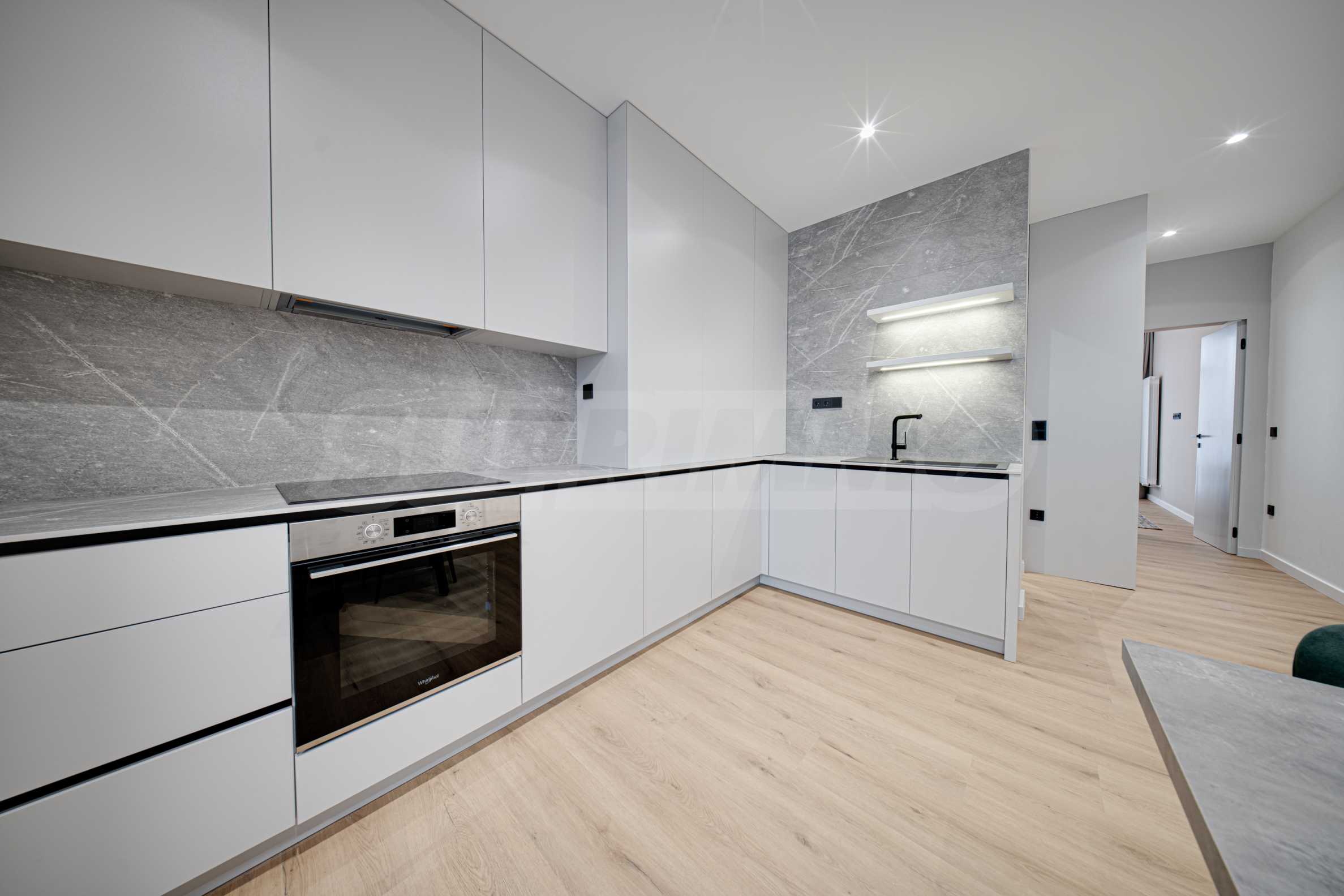 Кухненски бокс с вградени ел. уреди: керамични котлони, фурна, голяма съдомиялна, хладилник с фризер, пералня със сушилня и абсорбатор;