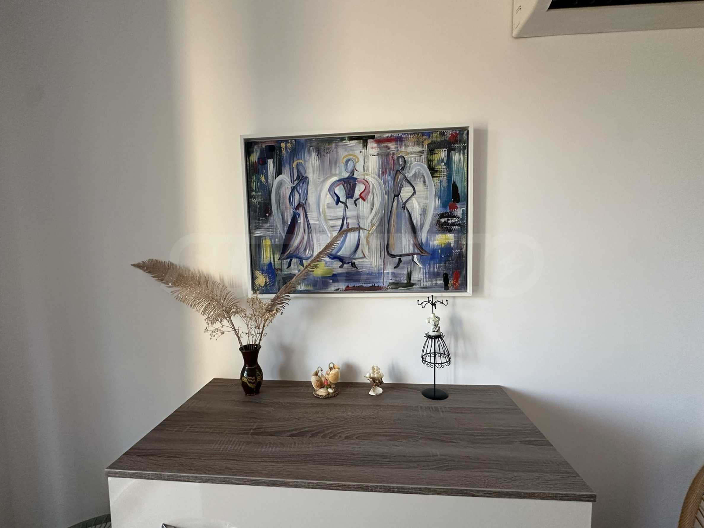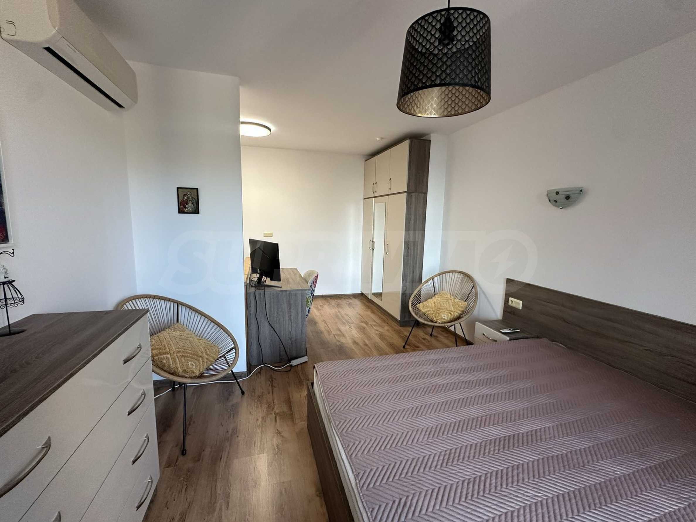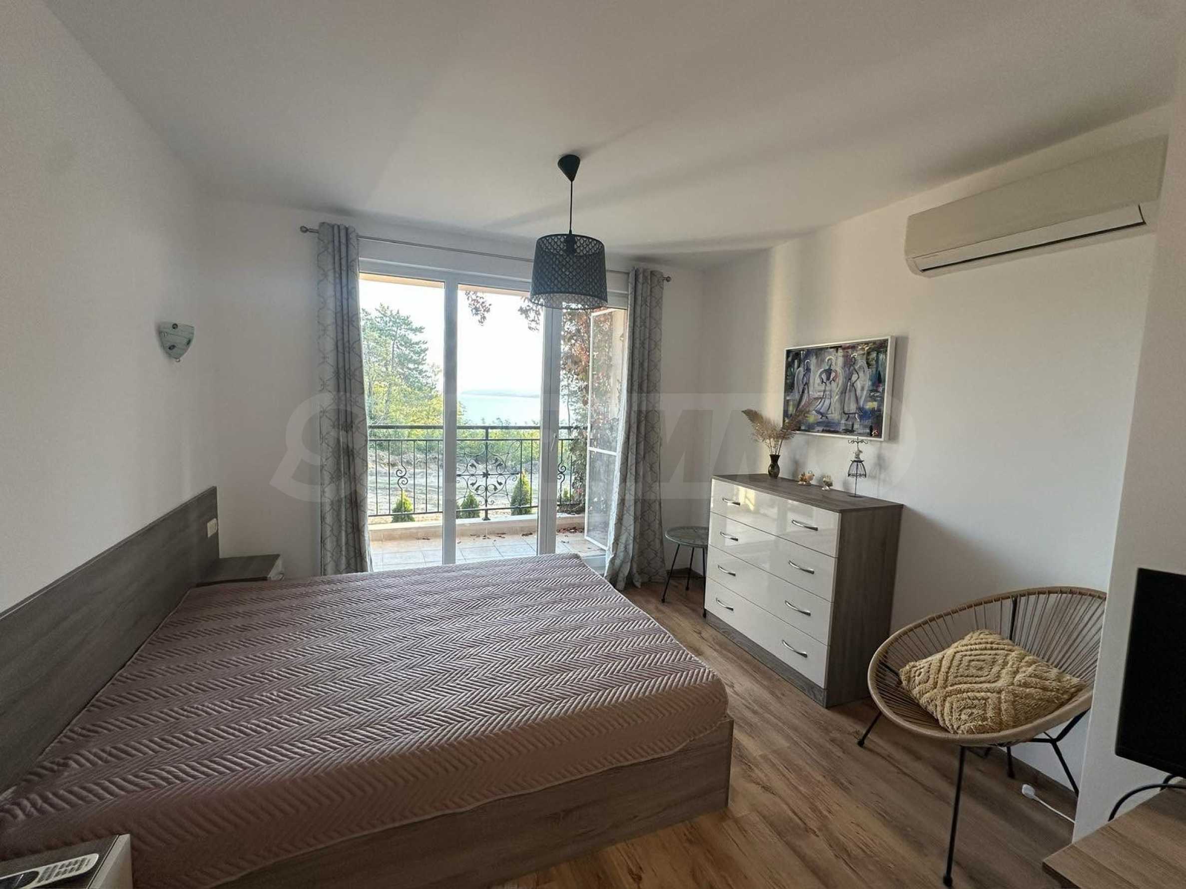 Апартаментът е напълно обзаведен и оборудван с внимание към детайла и всичко необходимо за живеене като мебели и ел. уреди. Предлага уют, комфорт и невероятна морска панорама.