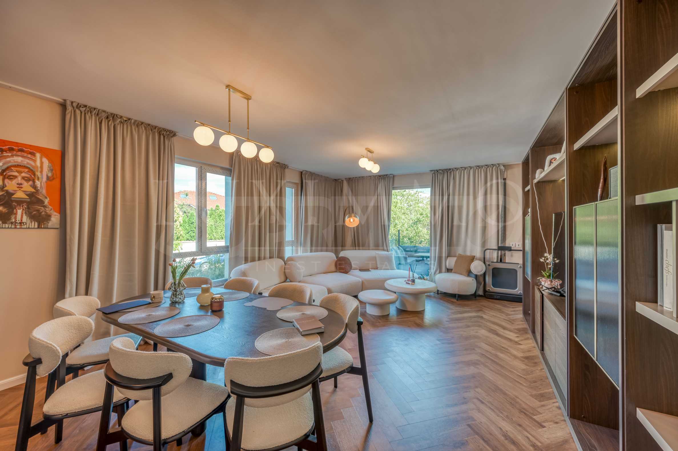 Апартаментът е разположен на 1-ви етаж от общо 4, с площ от 147 кв.м., и впечатлява с простор, светлина и висок клас довършителни работи.