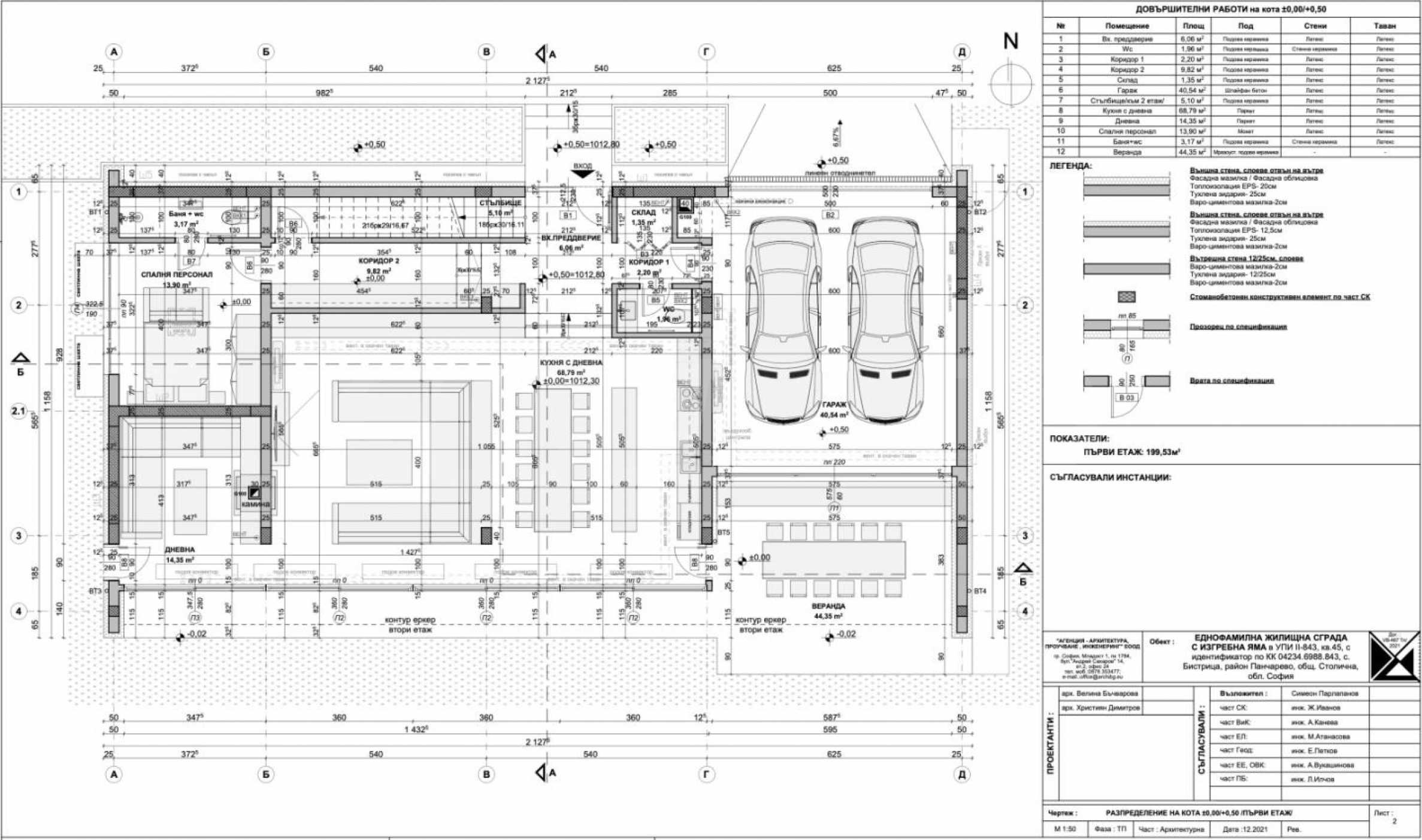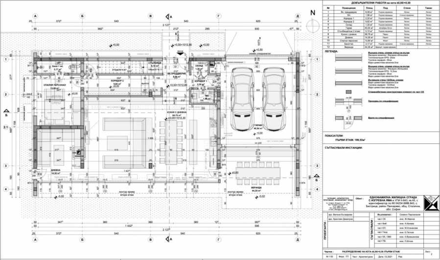 2-ри етаж: входно антре, дневна с трапезария и кухненски бокс, стая, зимна градина, тоалетна за гости, спалня с баня и тоалетна, двоен гараж;