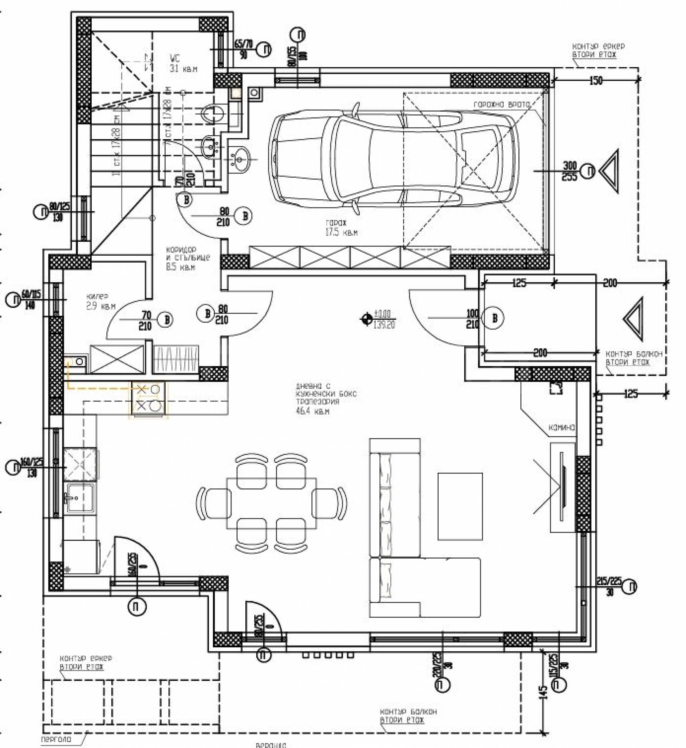 Къщата с РЗП 341 кв.м разполага с двор с площ от 557 кв.м и има следното разпределение: