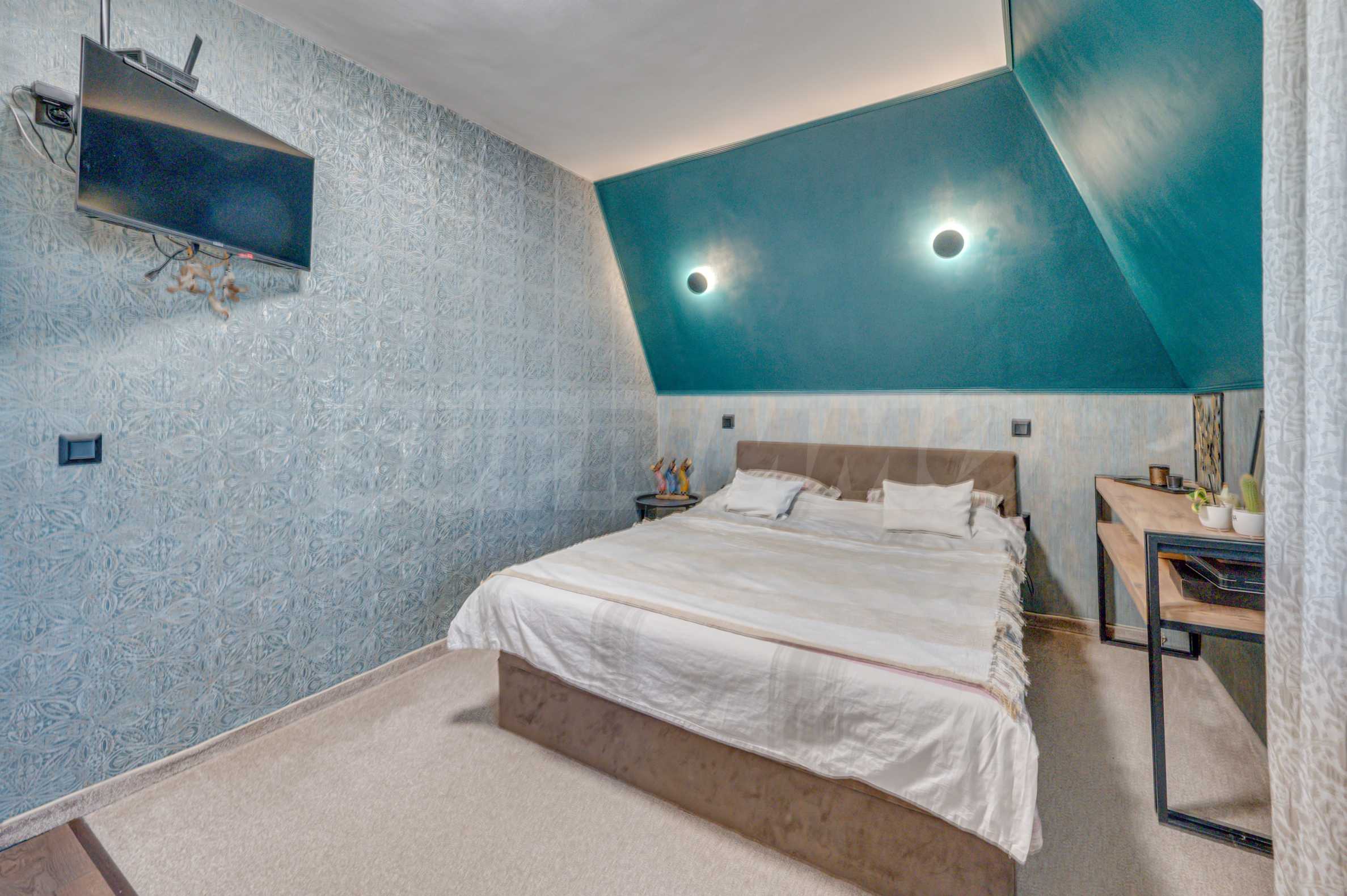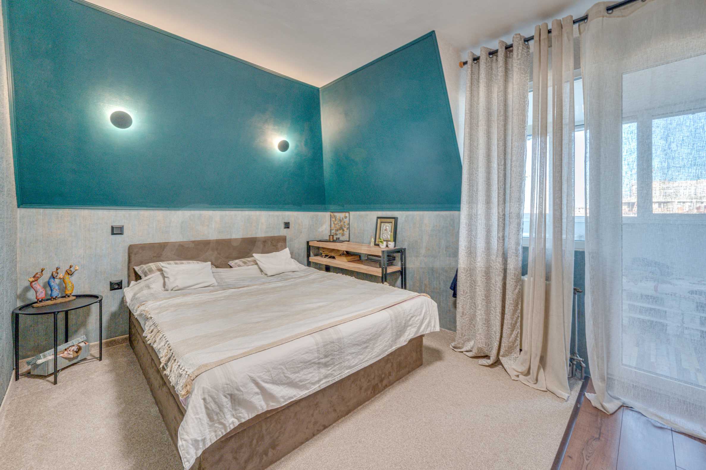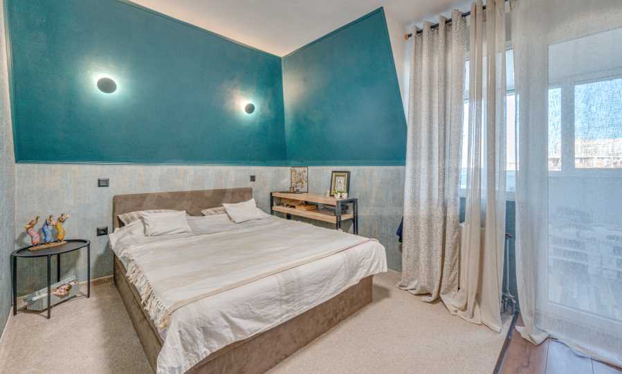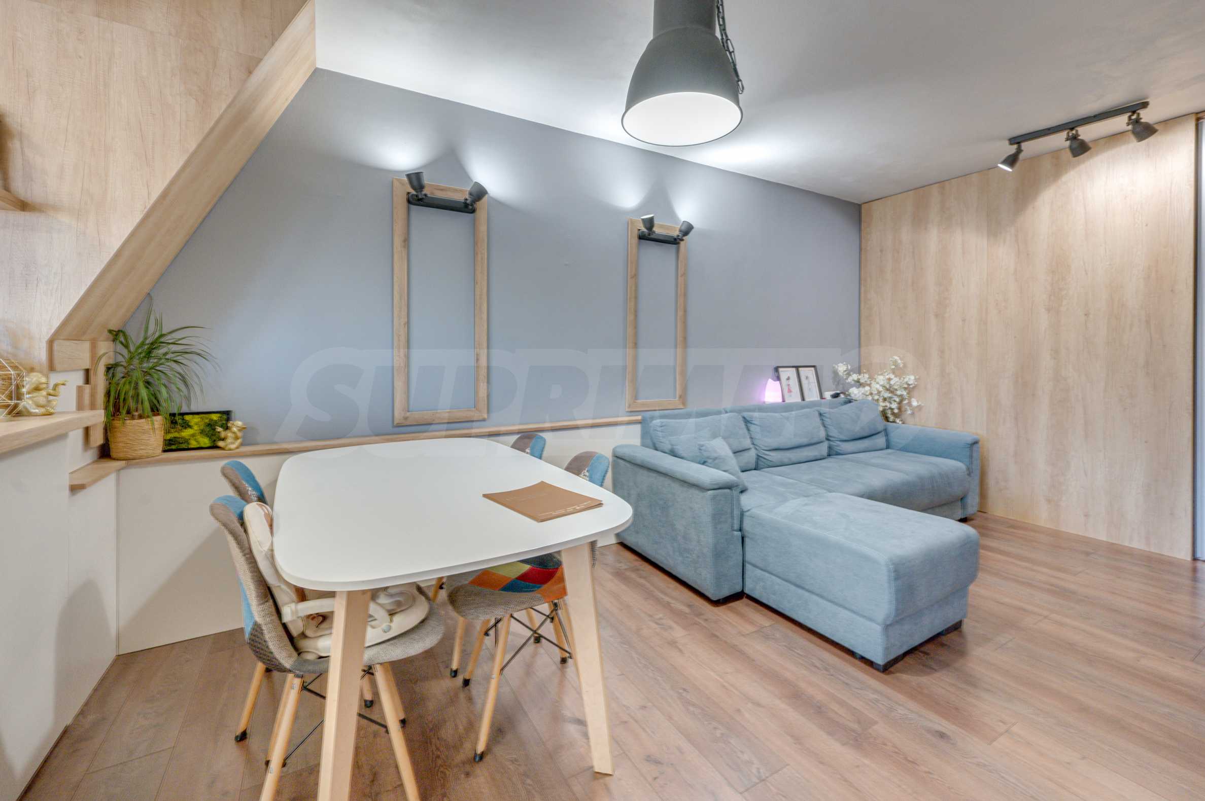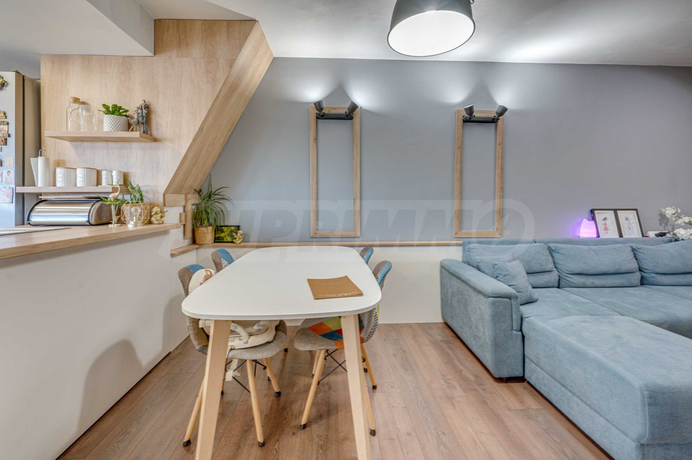 Жилището се намира на последен, пети етаж в поддържана тухлена сграда без асансьор и разкрива панорамна гледка, обгръщаща целия апартамент. Напълно обзаведен и оборудван, готов за нанасяне. Включени са всички мебели и електроуреди.