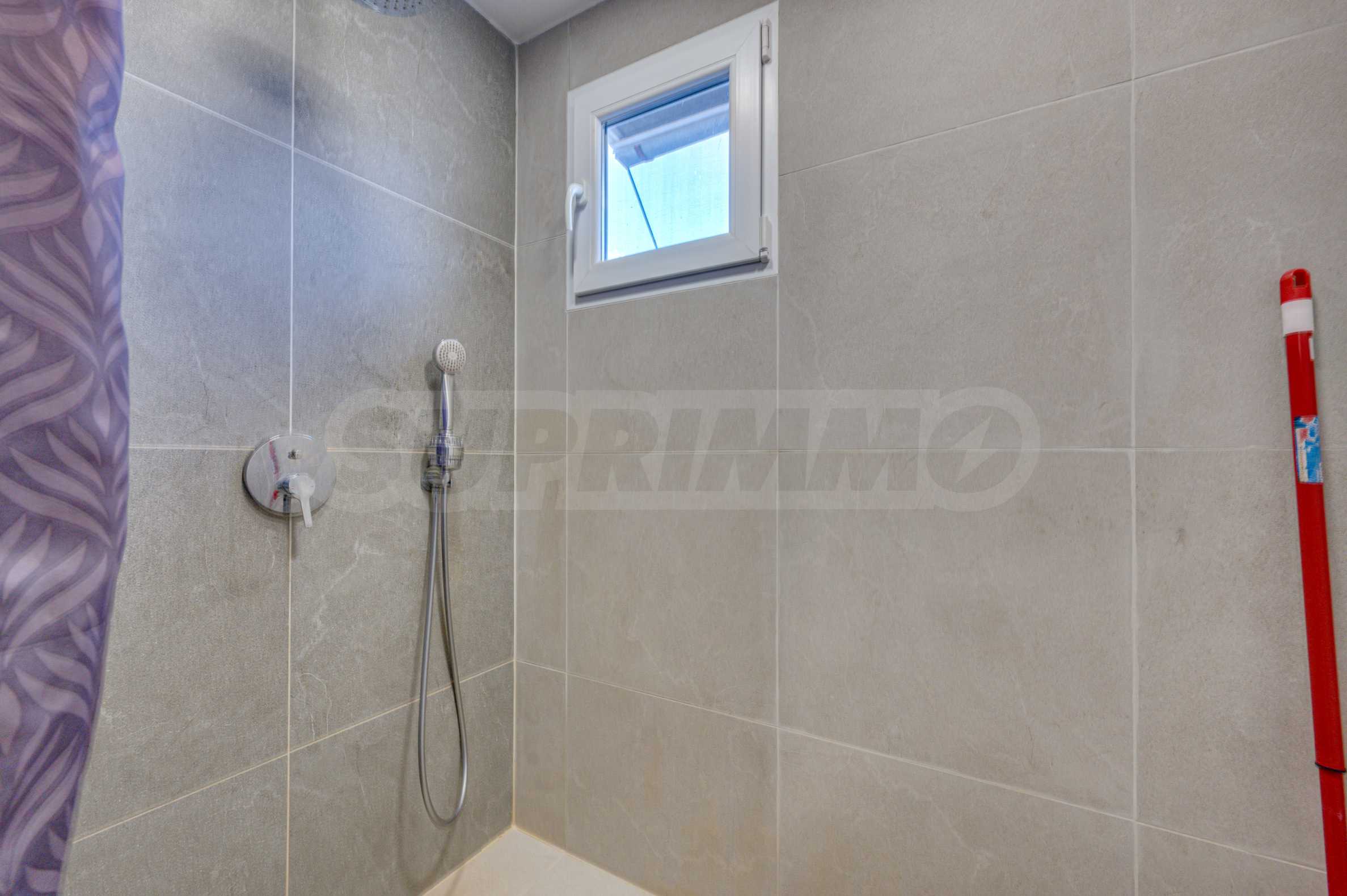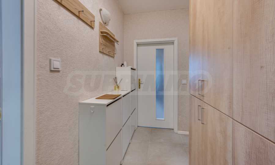 Разпределението предлага удобство и функционалност: просторна дневна с кухня и трапезария, две спални, баня с тоалетна, голяма гардеробна и остъклена тераса, която може да се използва целогодишно и повишава енергийната ефективност на жилището.