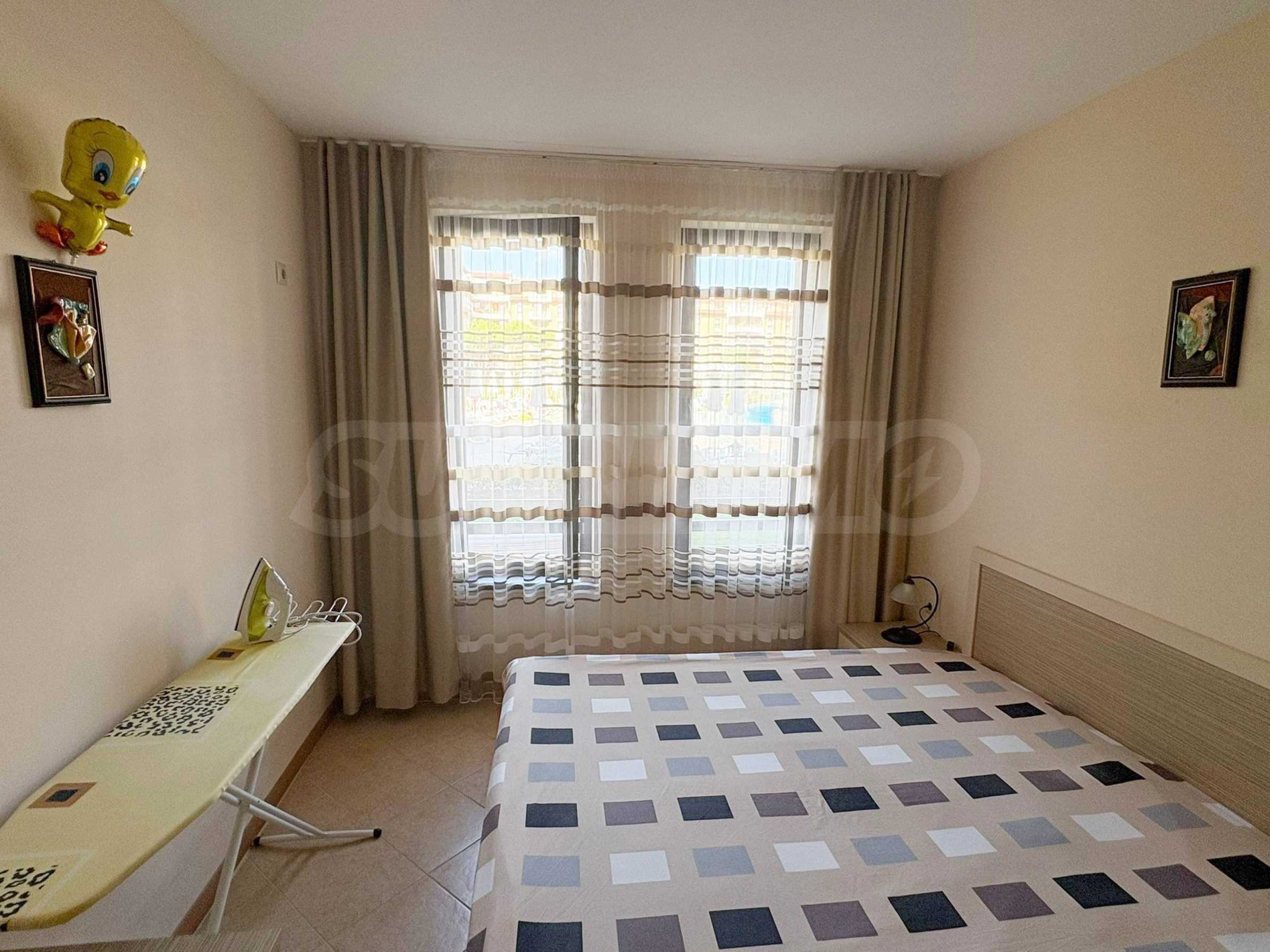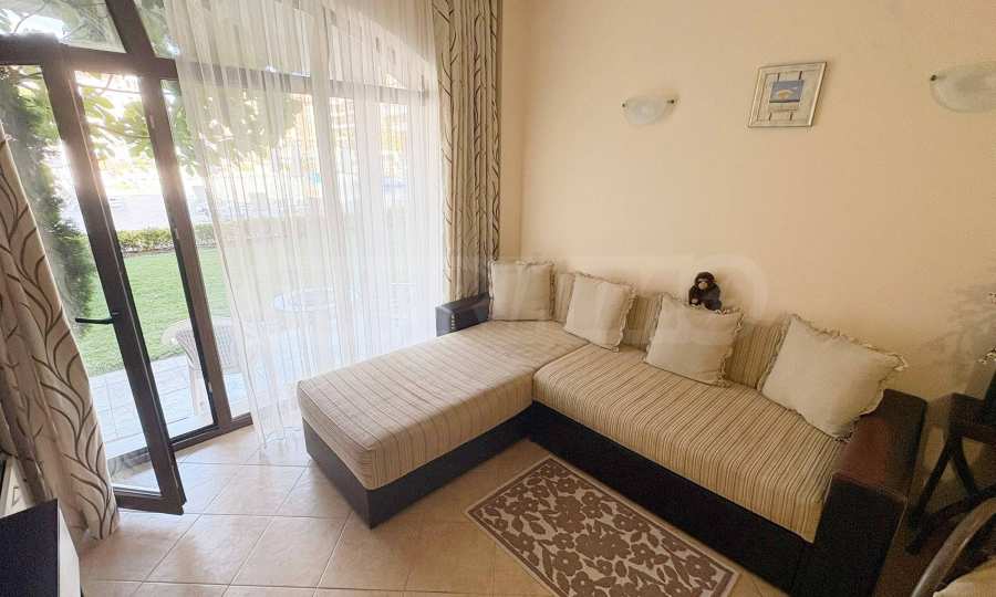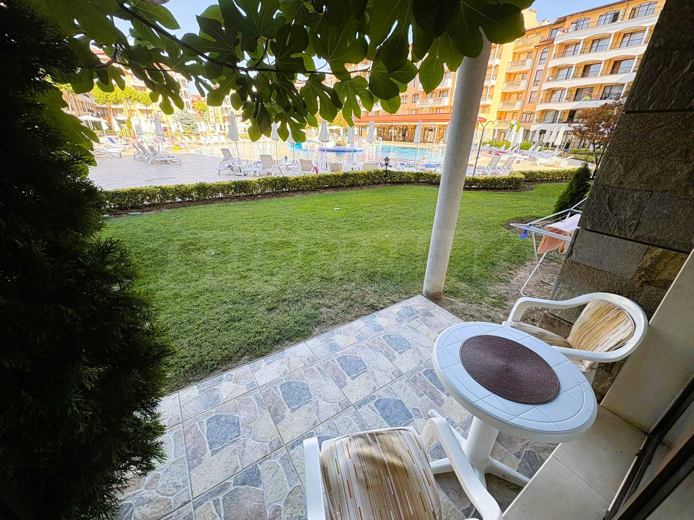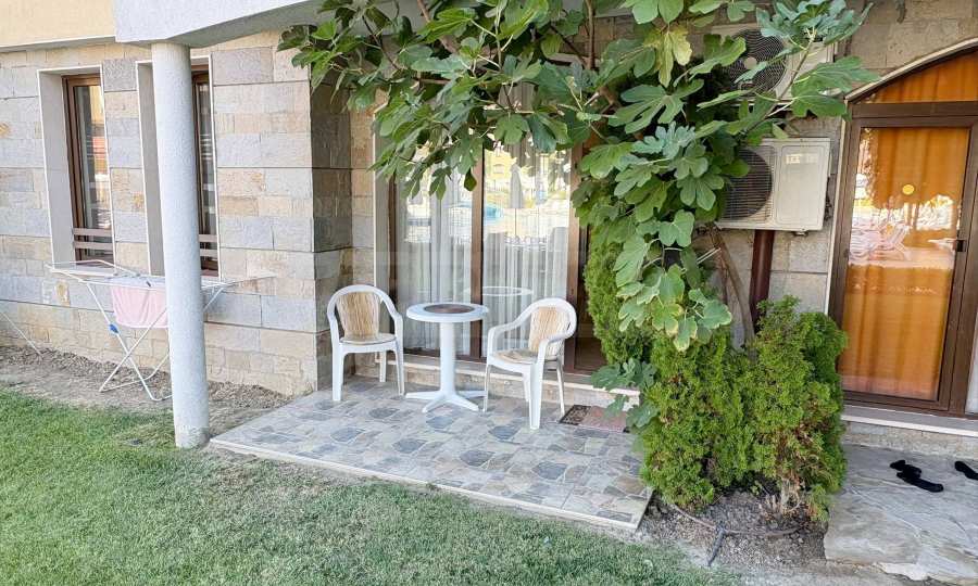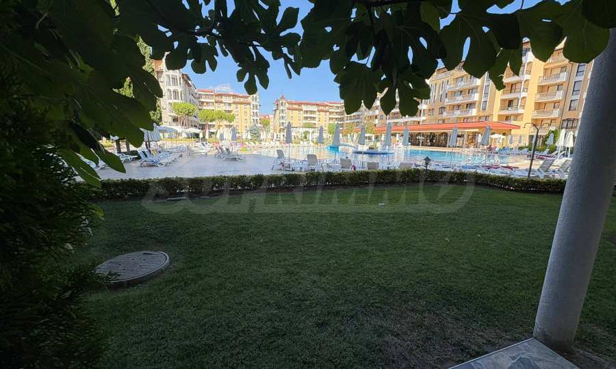 Имотът е с обща площ от 48 кв.м, разположен на 1-ви етаж с южно изложение и директен излаз към градината и басейните.