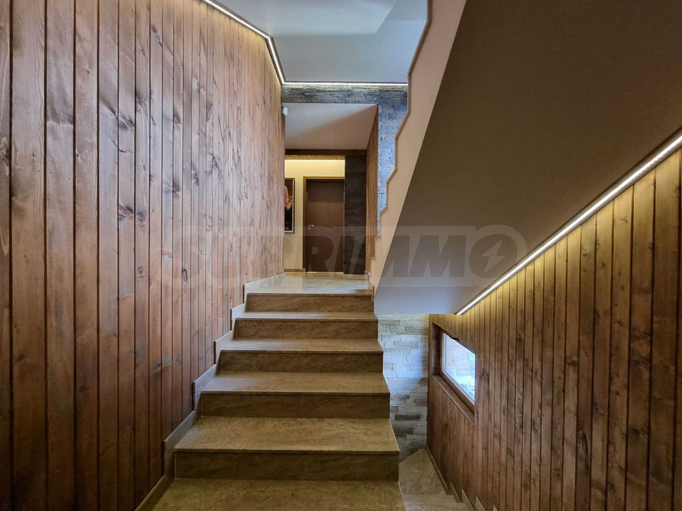 Изпълнена е външна топлоизолация (10 см) и вътрешна вата, настилките са от дъбов паркет и естествен камък травертин, осветлението е LED, а вентилацията – централна. Отоплението е решено чрез камина и климатици във всички помещения.