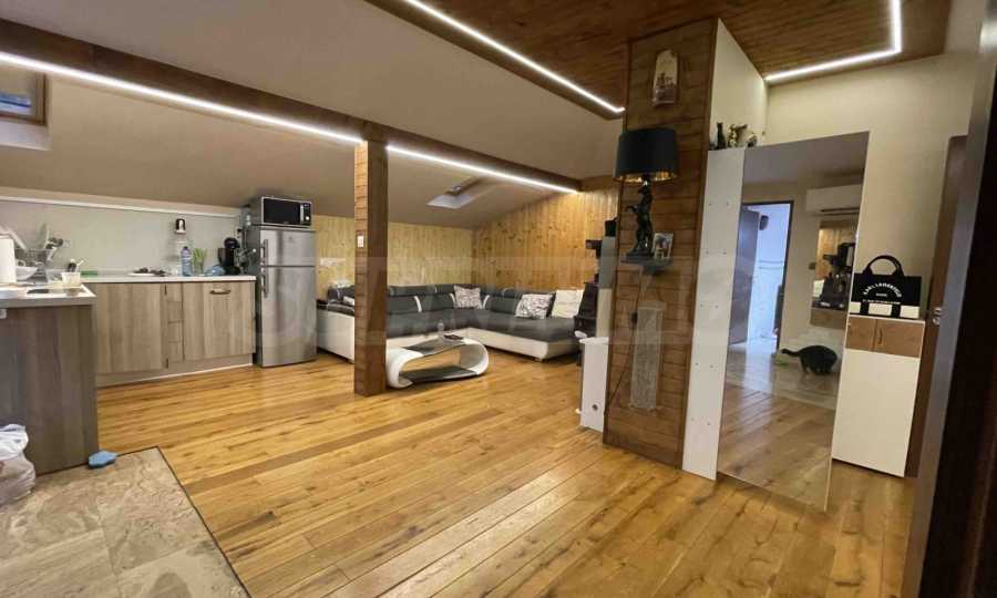 - Третият етаж включва огромна дневна с трапезария и кухненски бокс, родителска спалня с гардеробна, детска стая и баня с тоалетна.