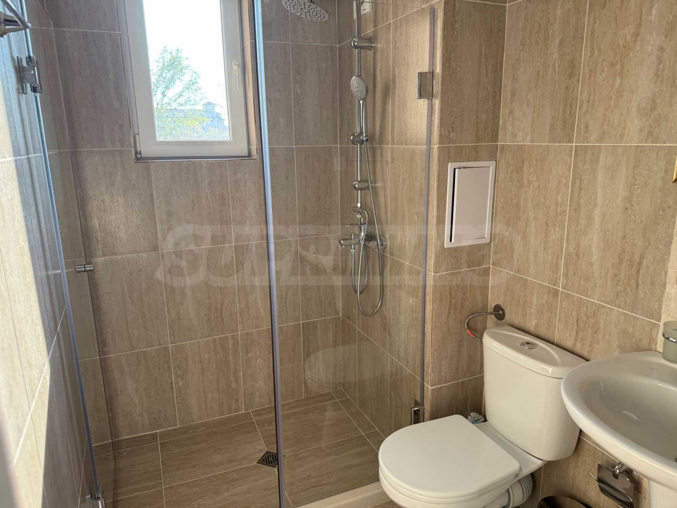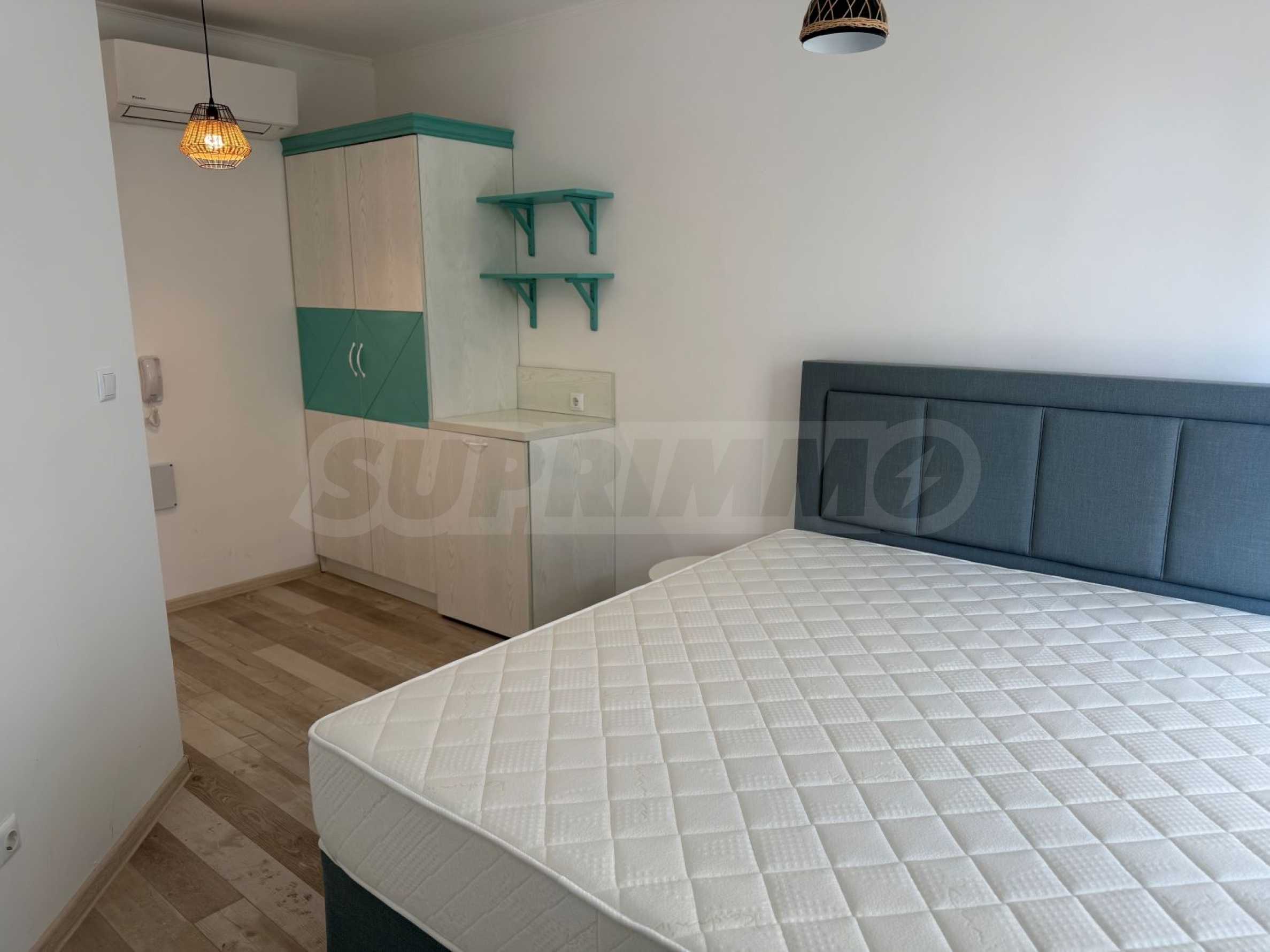 Имотът е комфортно обзаведен и оборудван, готов за нанасяне. Разполага с всекидневна със спалня, масичка с 2 стола, гардероб, хладилник, телевизор, климатик, напълно оборудвана баня.
