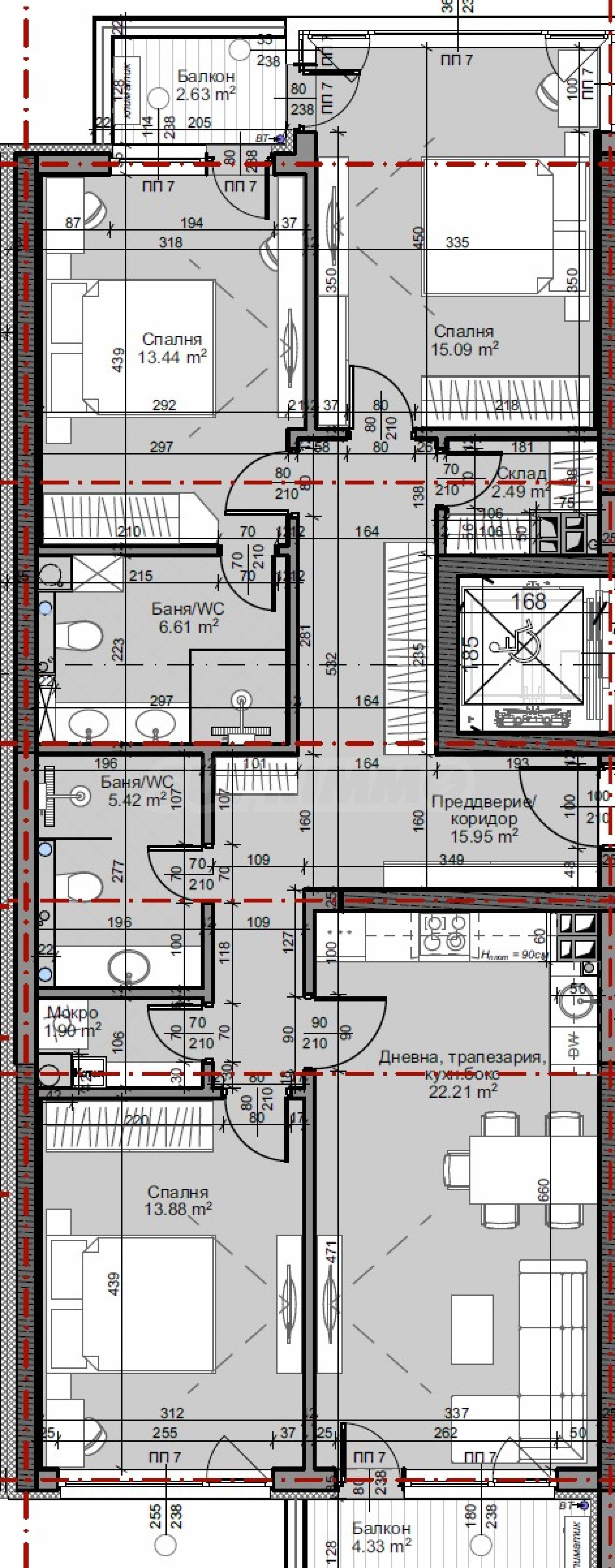 Апартаментът е четиристаен, с обща площ 141.26 кв.м. (нетна площ 122.14 кв.м. + общи части 22.12 кв.м.) и е разположен на пети етаж.