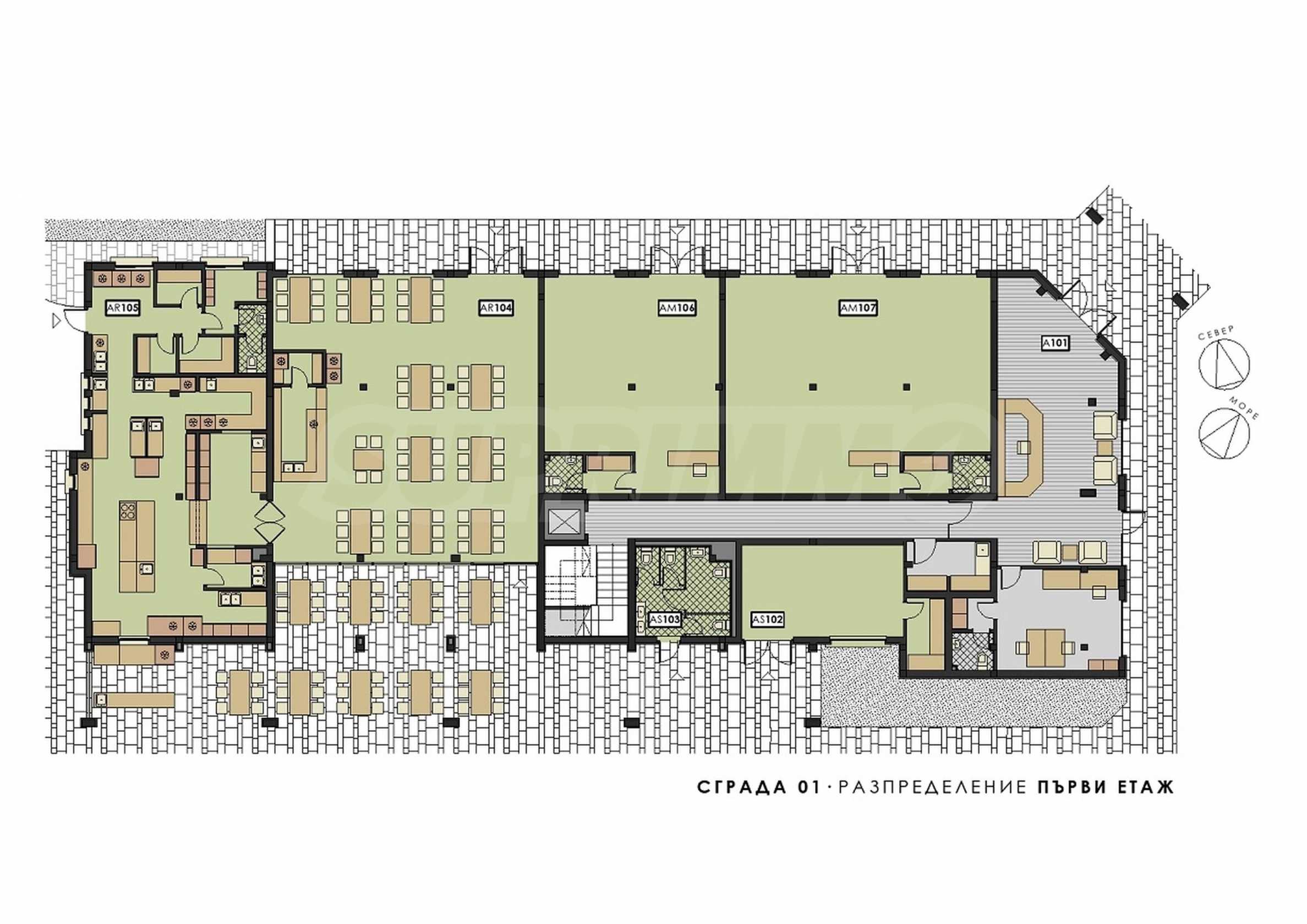 Имотът е с площ от 425 кв.м, разположен на партерен етаж в сърцето на комплекса.