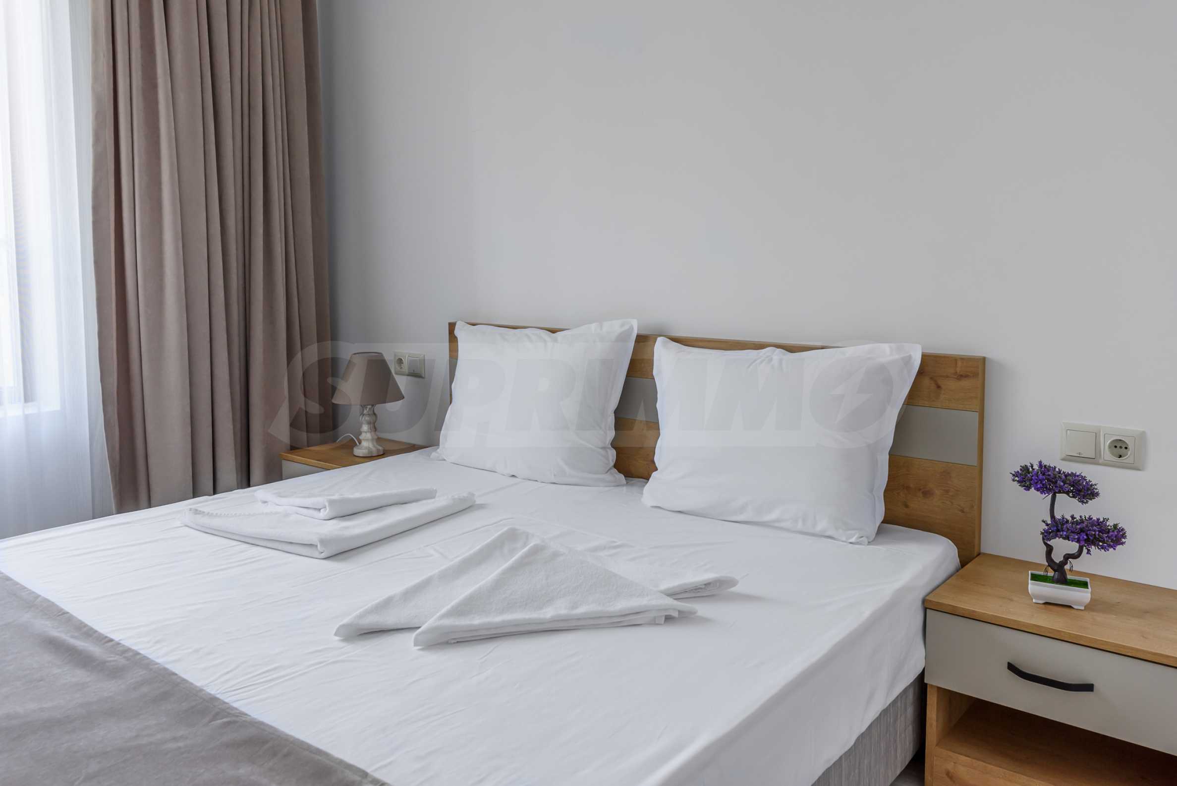 Апартаментът от 57,58 кв.м се намира на 1-ви етаж и се състои от: входно антре, всекидневна с кухня, спалня, баня с тоалет, веранда.