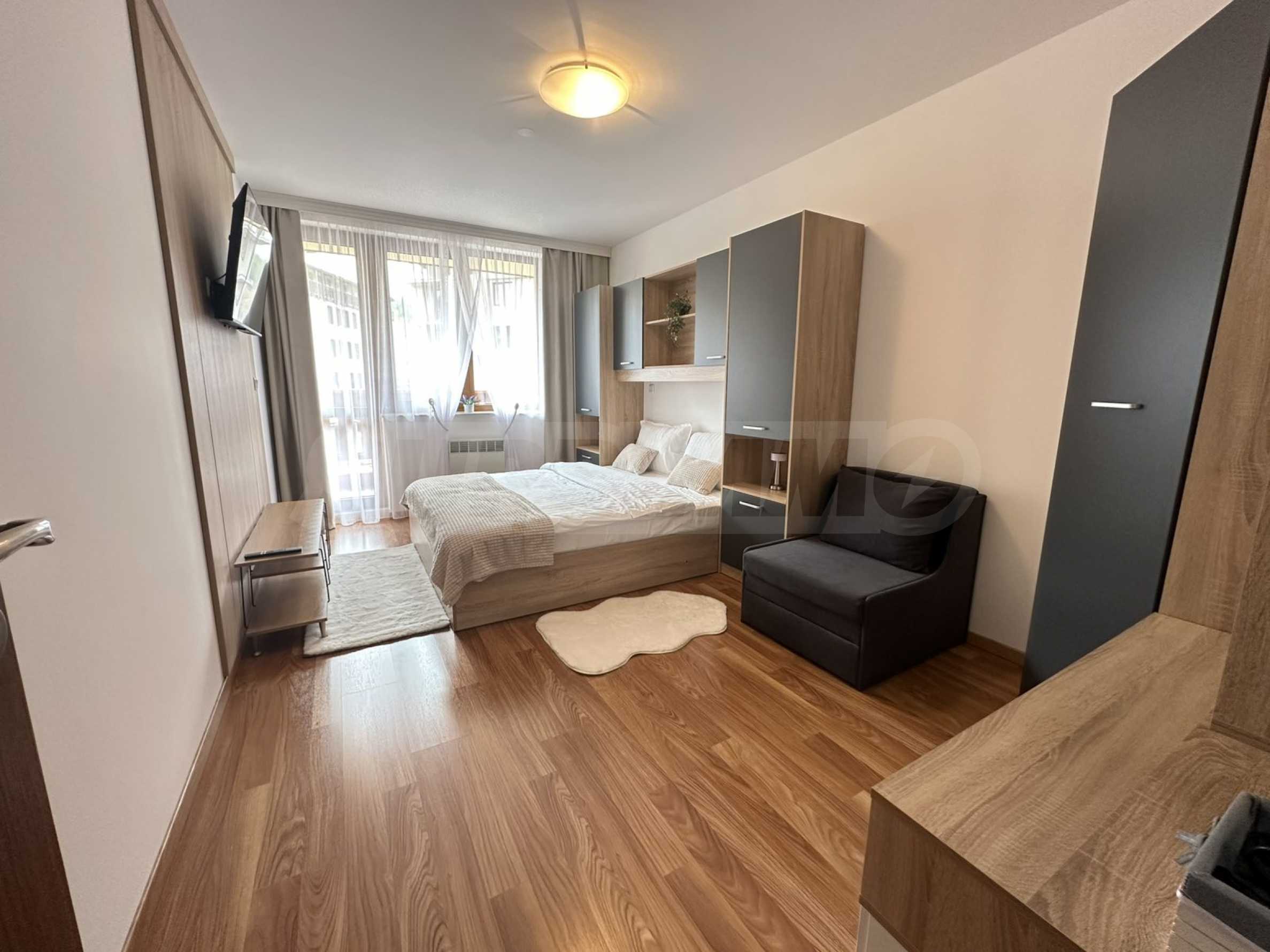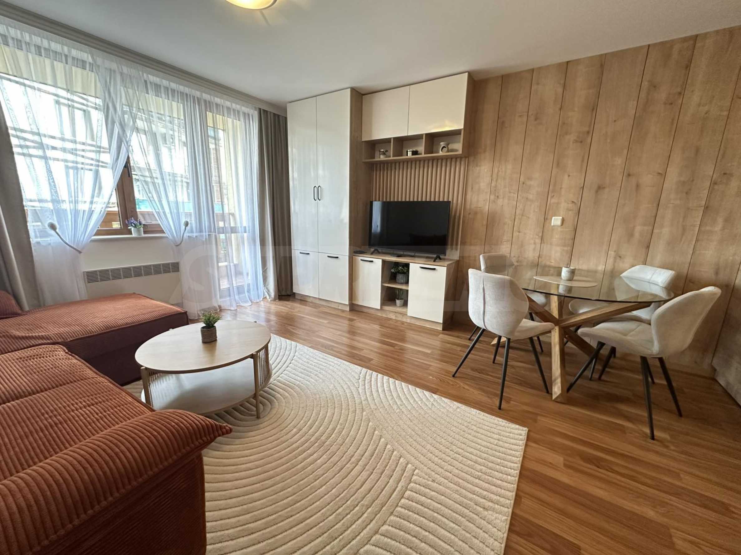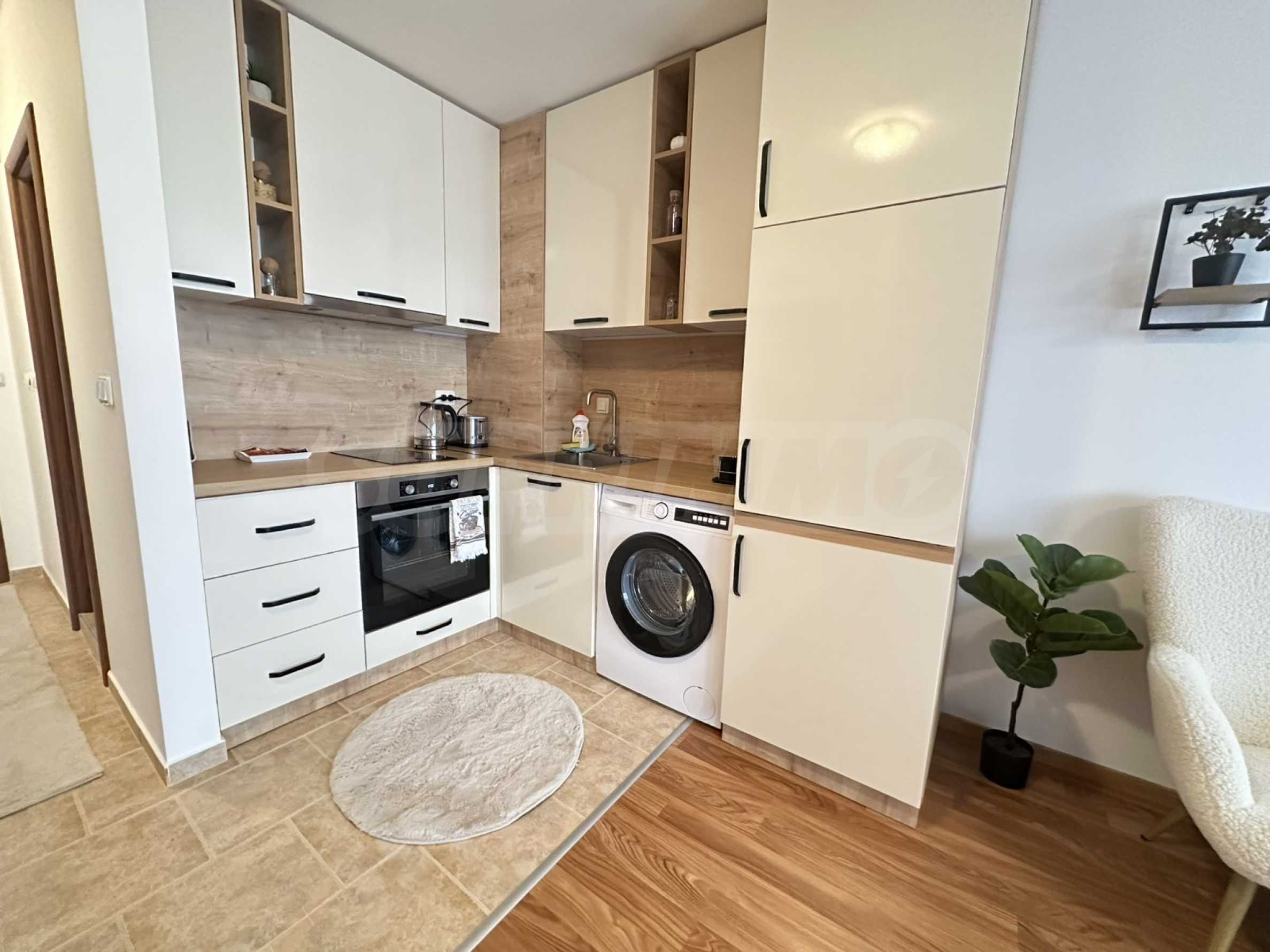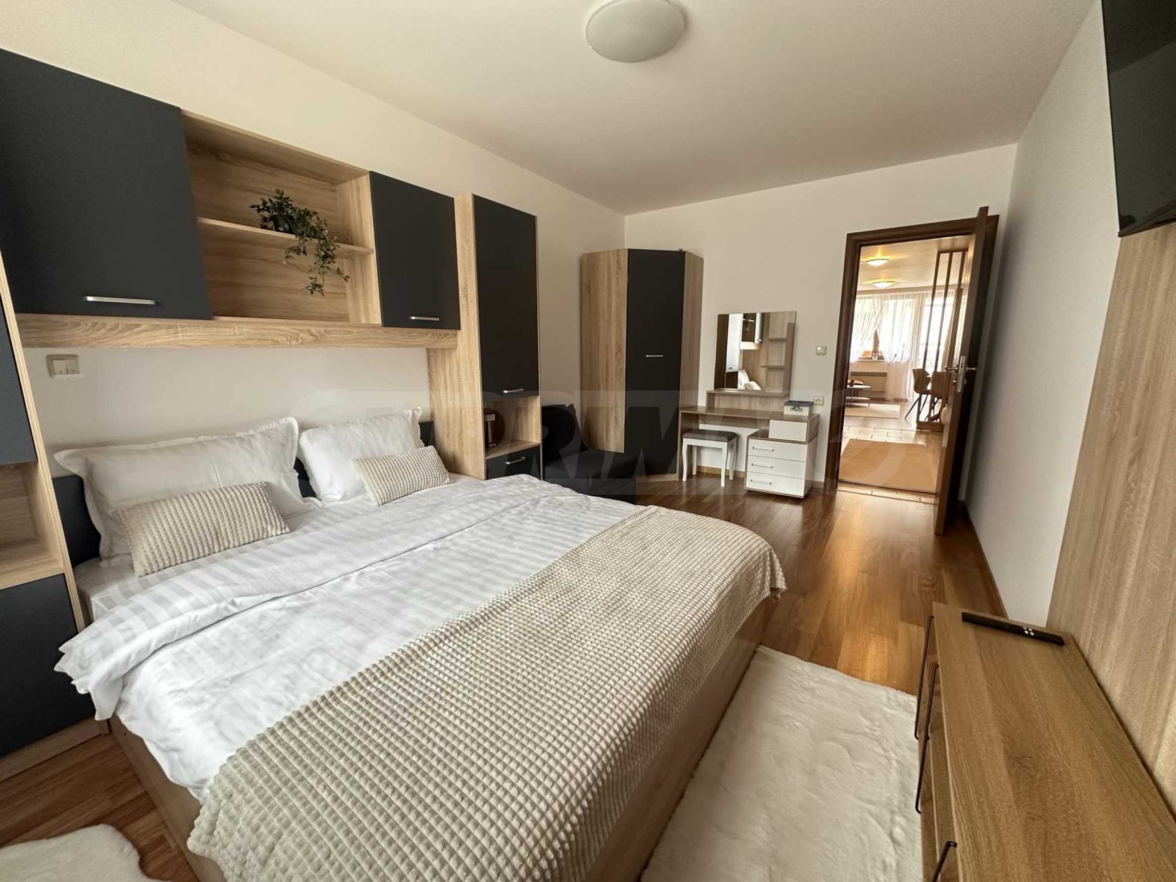 Имотът е ситуиран от: коридор, светла и уютна дневна , с големи прозорци, удобен разтегателен диван, телевизор с плосък екран и масичка за кафе. Кухненският бокс е напълно оборудван – има вградени уреди, котлони, хладилник, микровълнова, електрическа кана, посуда и прибори за готвене.Спалнята е отделна и предлага голямо легло с качествен матрак, гардероб с достатъчно място за багаж и нощни шкафчета с лампи. Банята е модерна, с душ кабина, сешоар и всички необходими удобства.