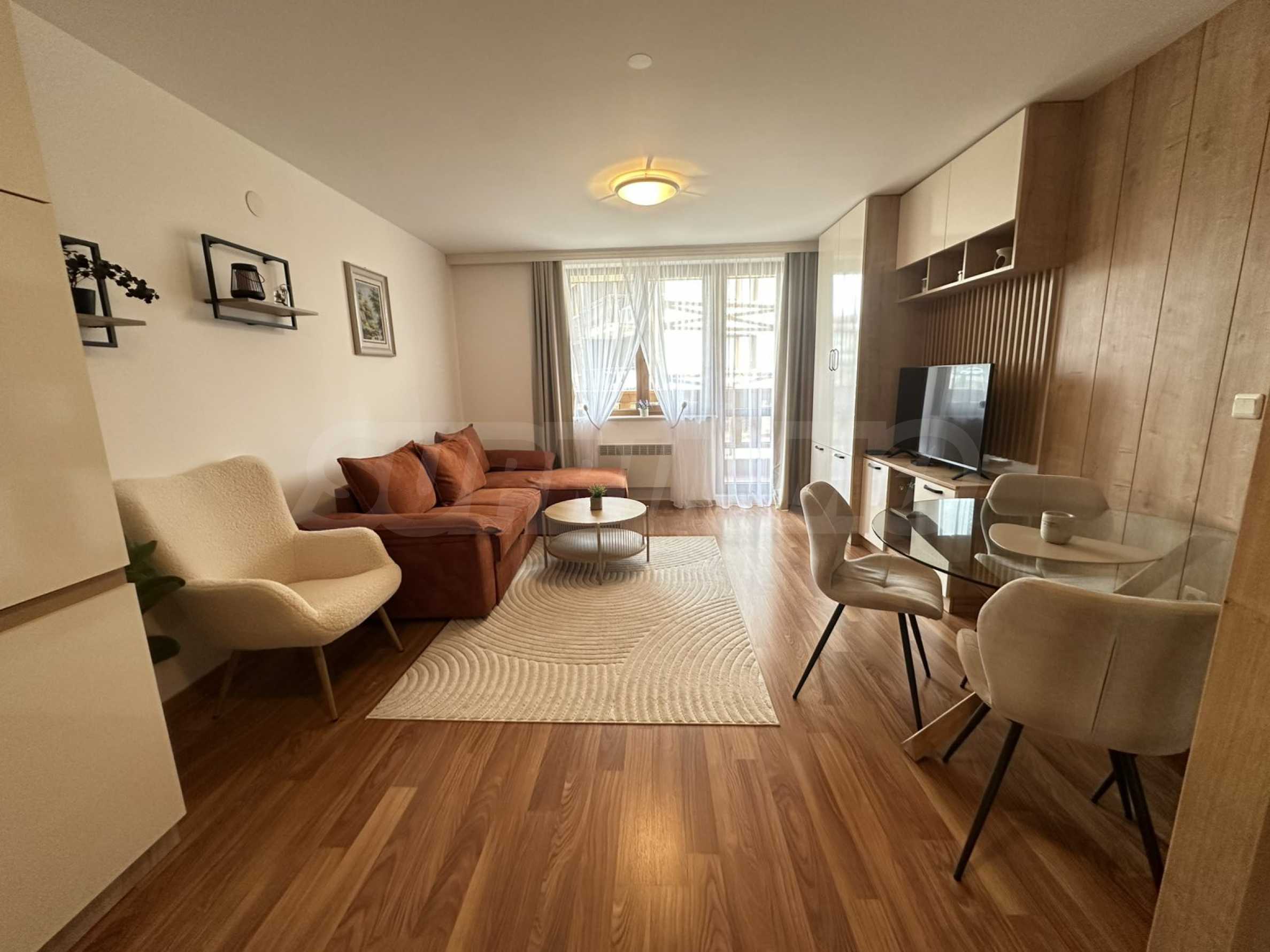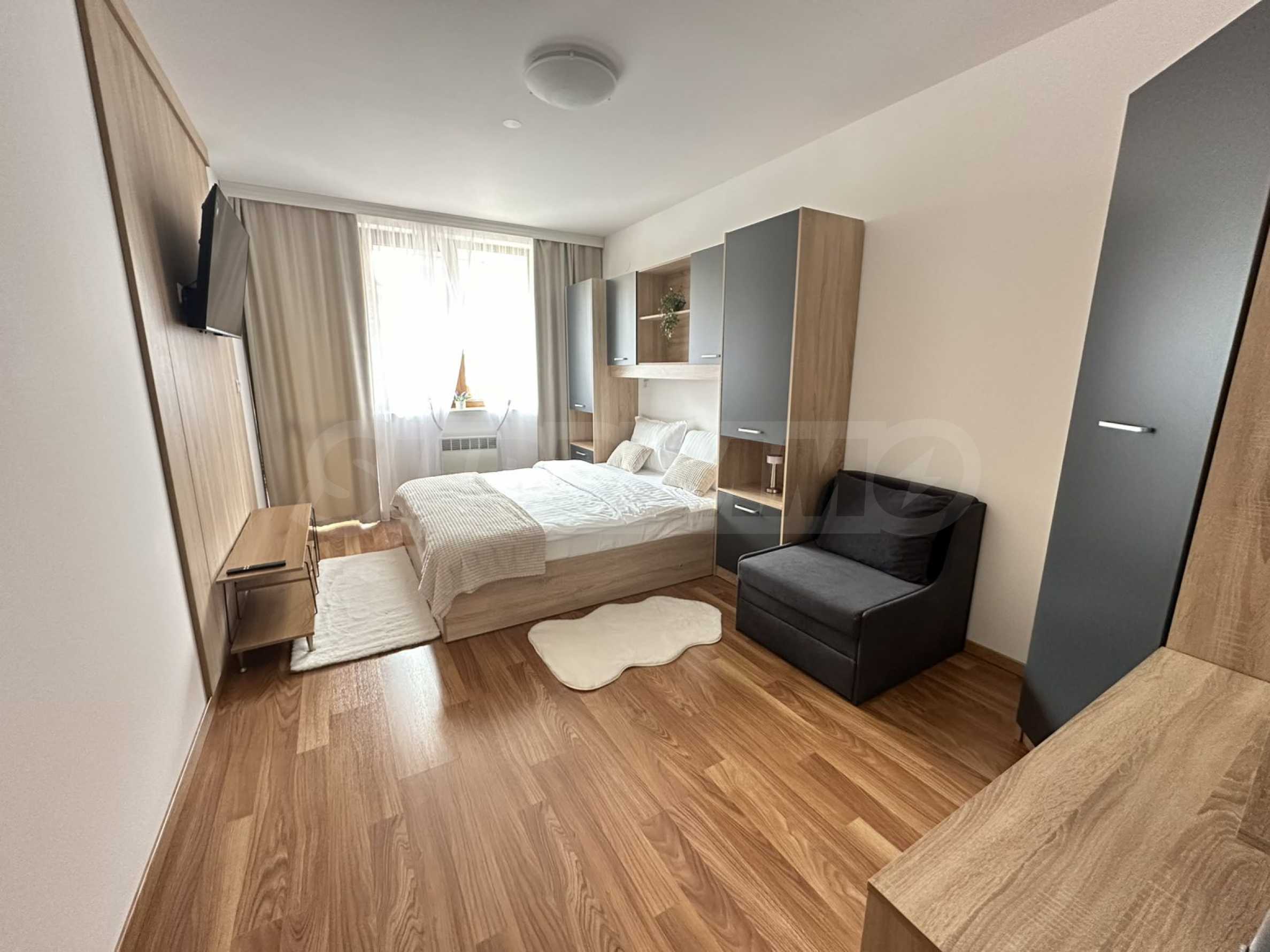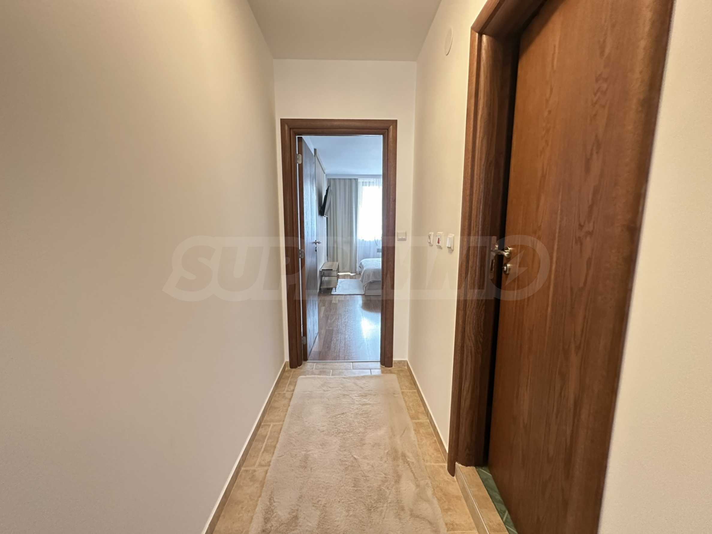 Имотът е ситуиран от: коридор, светла и уютна дневна , с големи прозорци, удобен разтегателен диван, телевизор с плосък екран и масичка за кафе. Кухненският бокс е напълно оборудван – има вградени уреди, котлони, хладилник, микровълнова, електрическа кана, посуда и прибори за готвене.Спалнята е отделна и предлага голямо легло с качествен матрак, гардероб с достатъчно място за багаж и нощни шкафчета с лампи. Банята е модерна, с душ кабина, сешоар и всички необходими удобства.