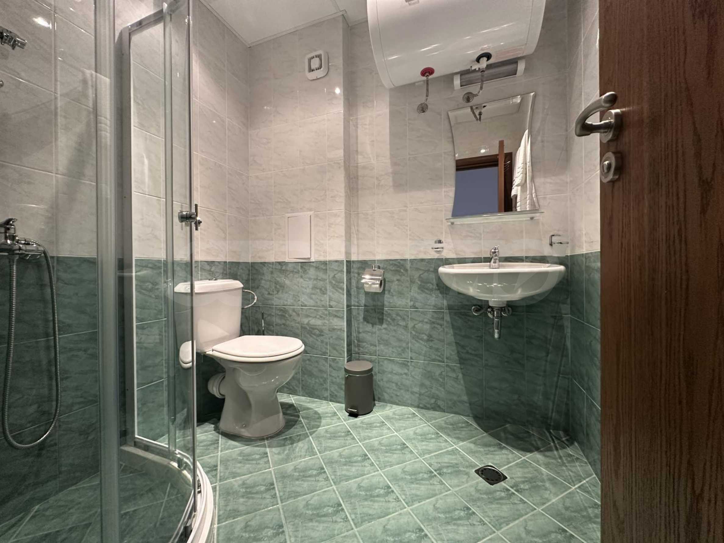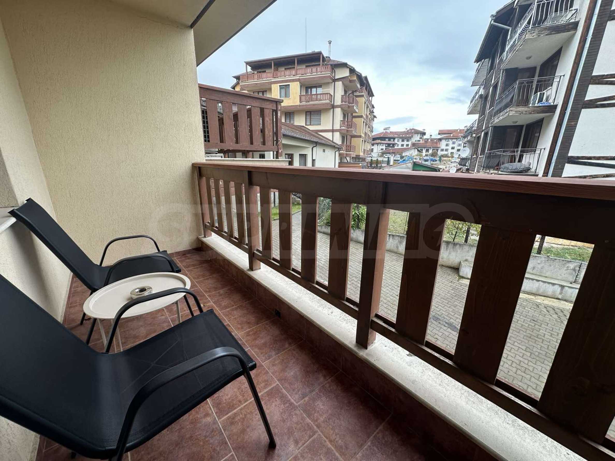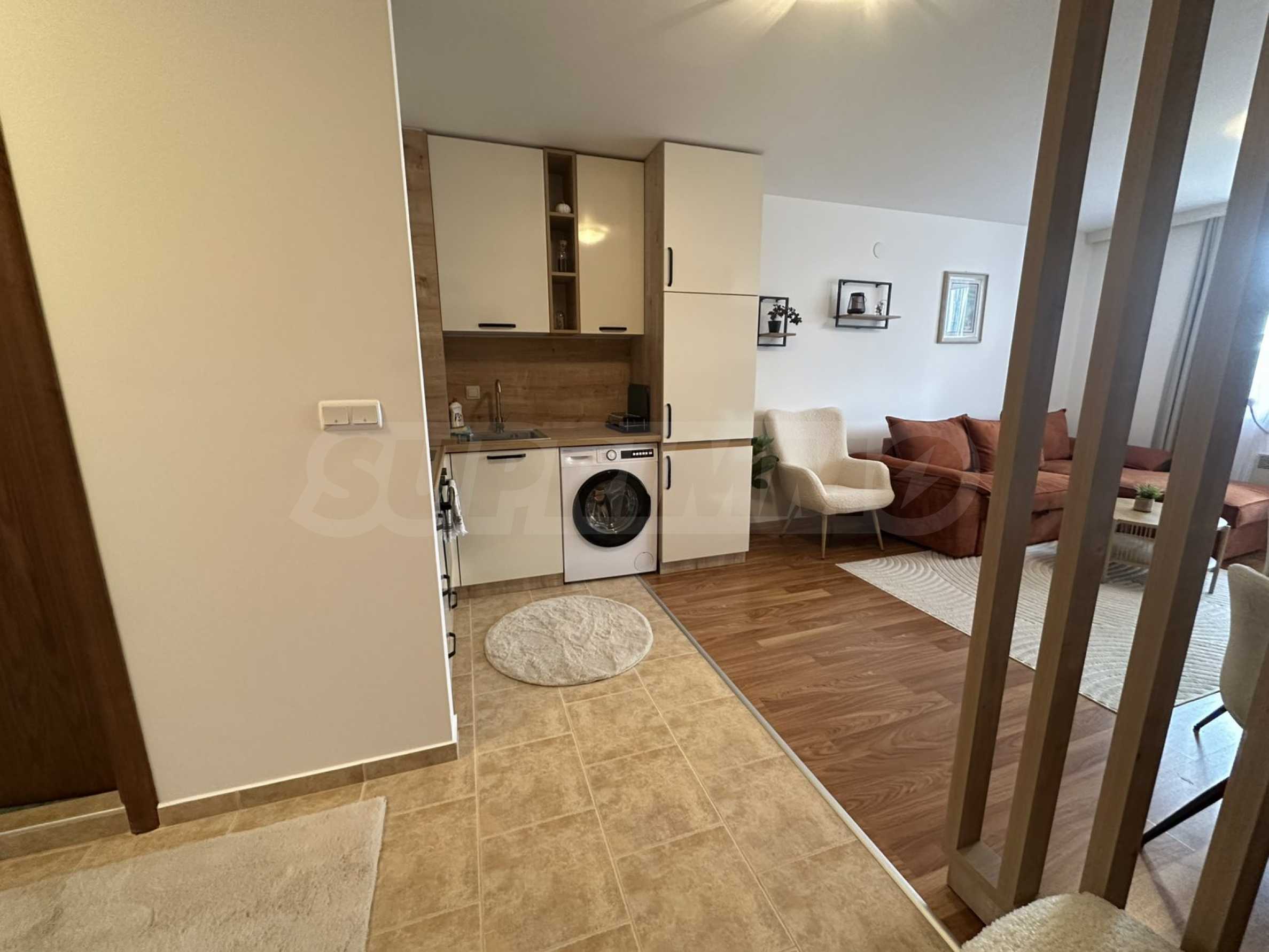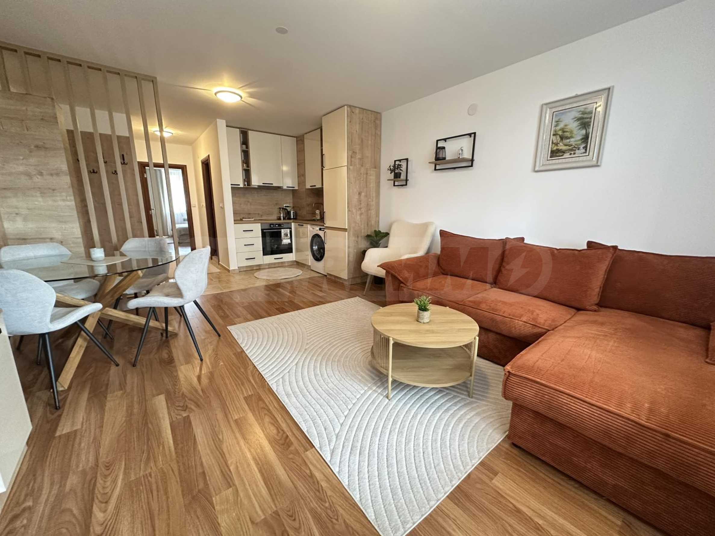 Имотът е ситуиран от: коридор, светла и уютна дневна , с големи прозорци, удобен разтегателен диван, телевизор с плосък екран и масичка за кафе. Кухненският бокс е напълно оборудван – има вградени уреди, котлони, хладилник, микровълнова, електрическа кана, посуда и прибори за готвене.Спалнята е отделна и предлага голямо легло с качествен матрак, гардероб с достатъчно място за багаж и нощни шкафчета с лампи. Банята е модерна, с душ кабина, сешоар и всички необходими удобства.