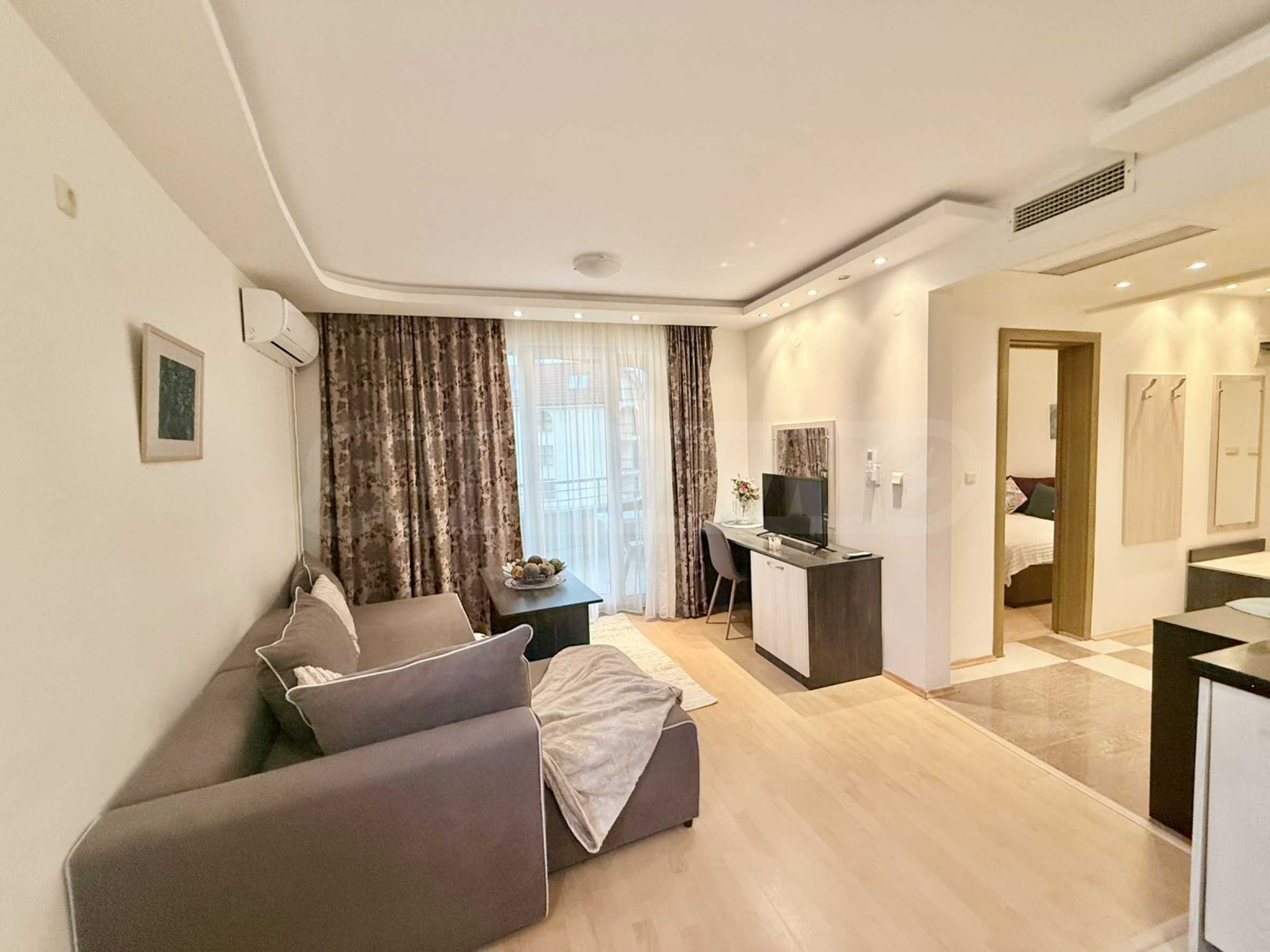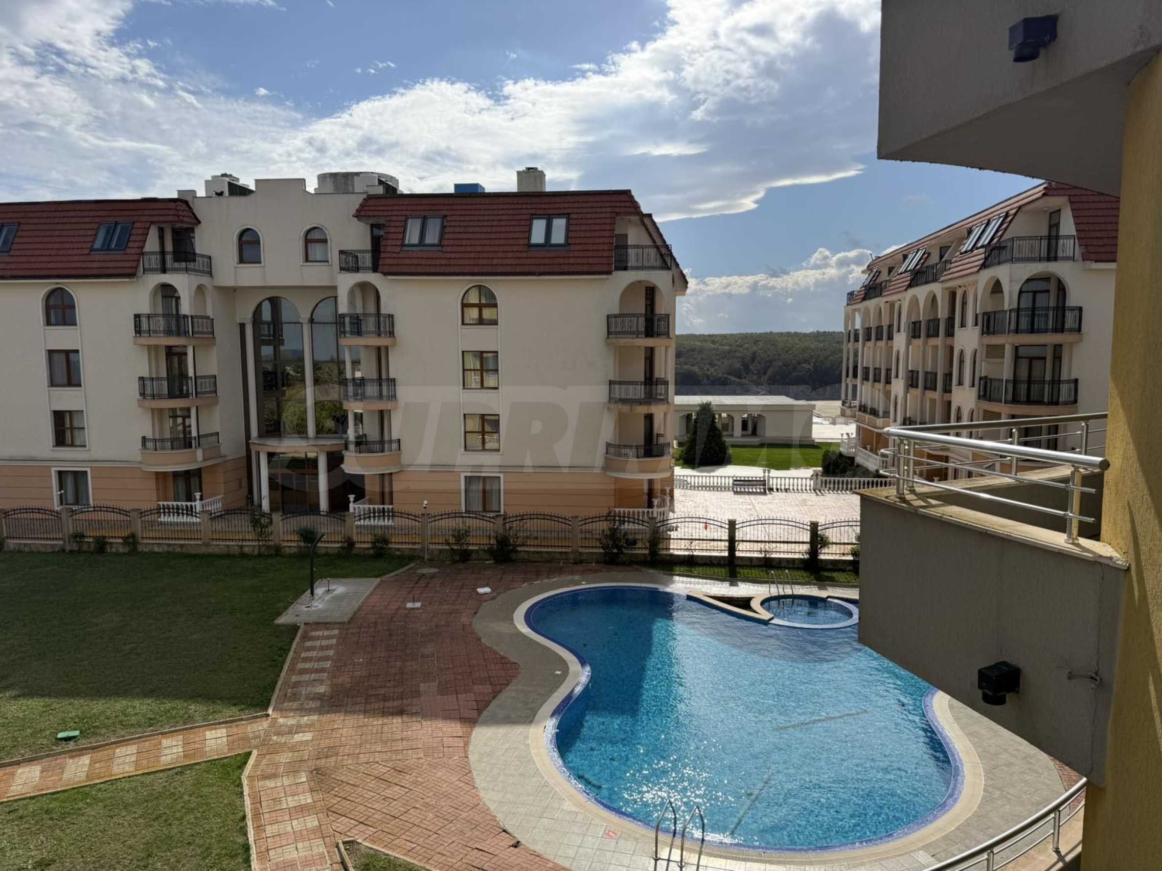Имотът е с обща площ 57,70 кв.м, разположен на 3-ти етаж с гледка към басейна и морето.