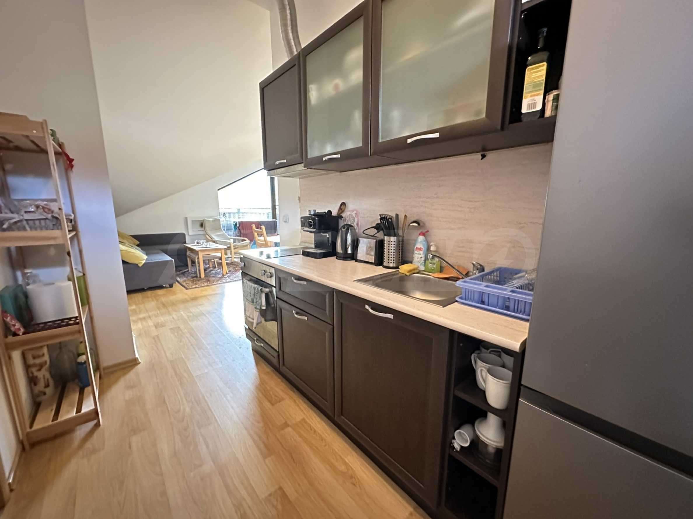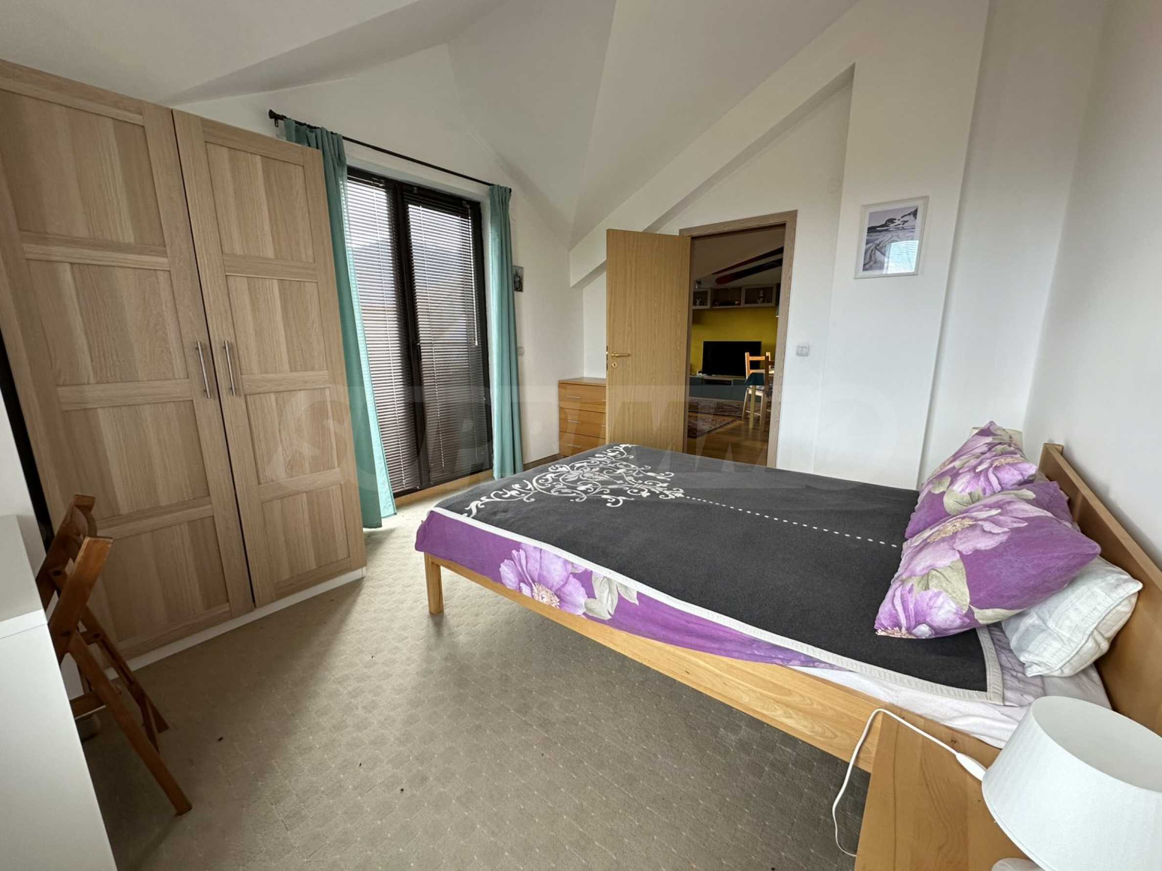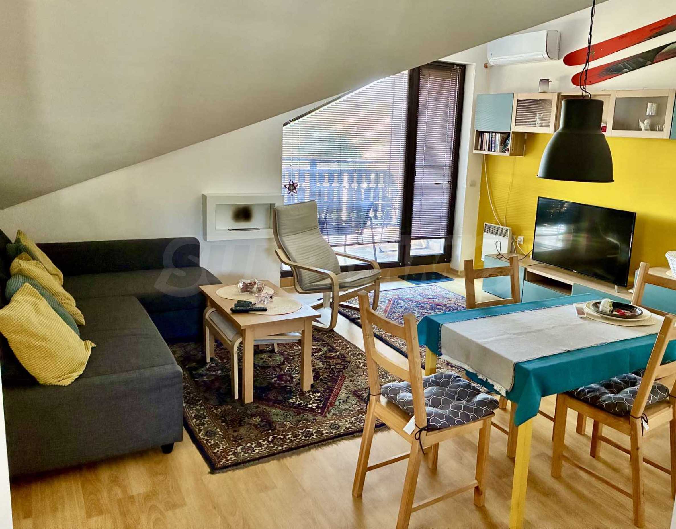 Имотът е ситуиран от: Всекидневна с кухненски кът, маса за хранене , разтегателен диван , две спални, напълно оборудвана баня с вана и два балкона;