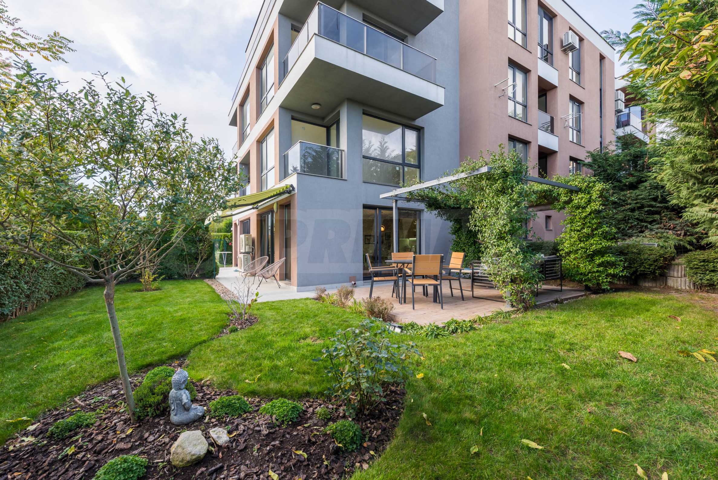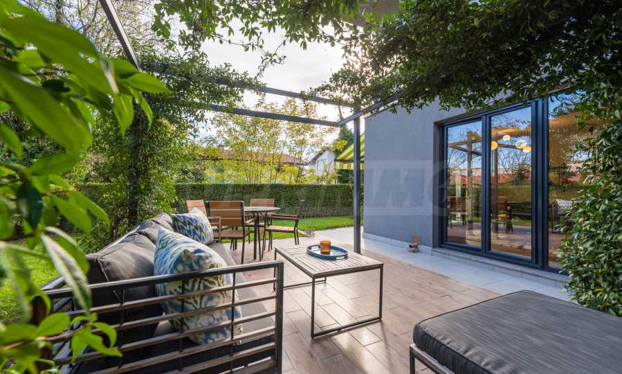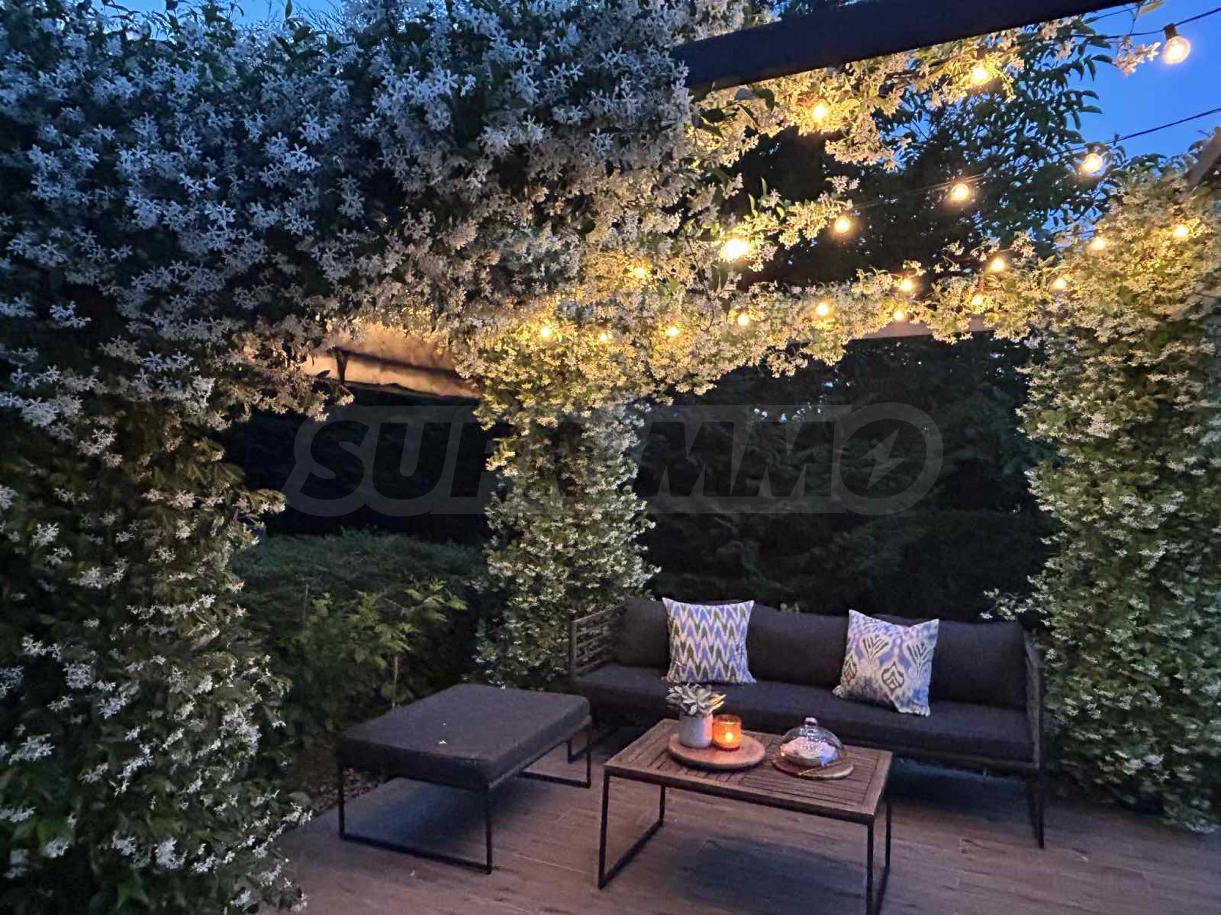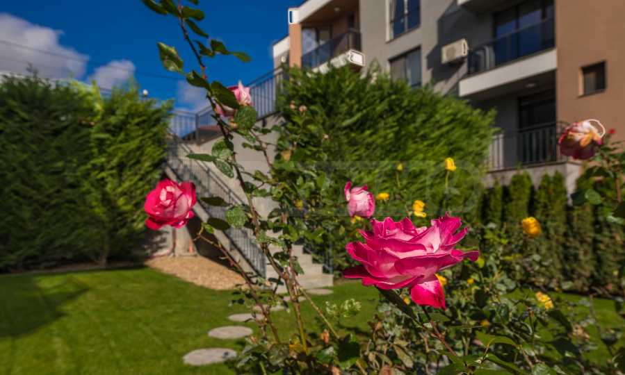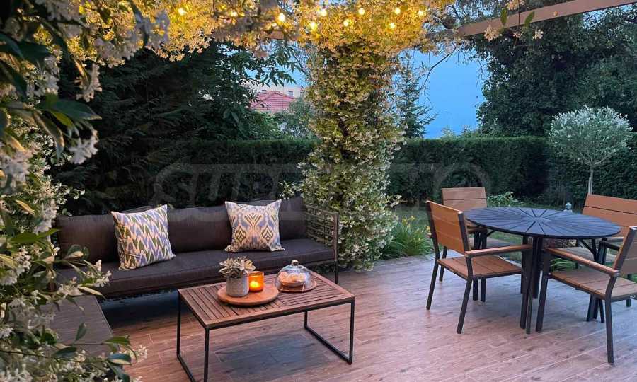Голямо предимство на имота е озелененият двор, който се ползва само от този апартамент. Там ще откриете беседка, обвита с жасмин, който ухае през цялото лято, както и маса за хранене и сутрешно кафе, от която може да се насладите на прекрасните изгреви съчетани с частична морска гледка.