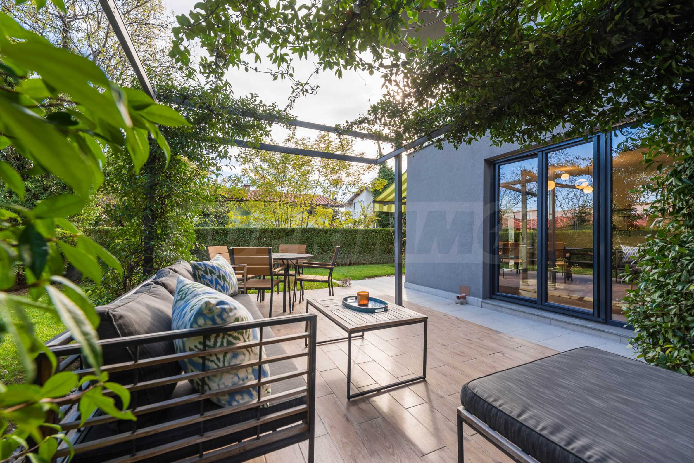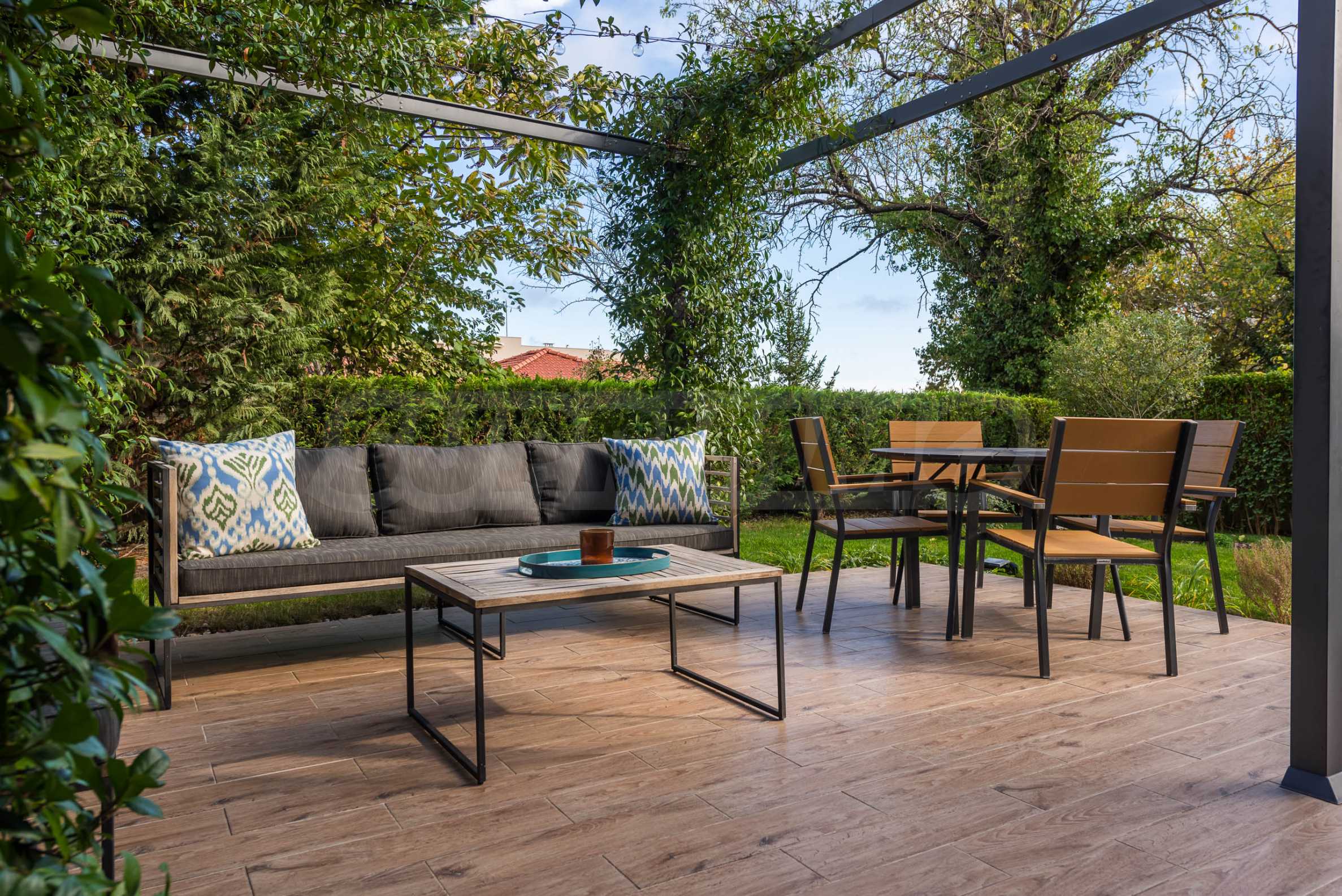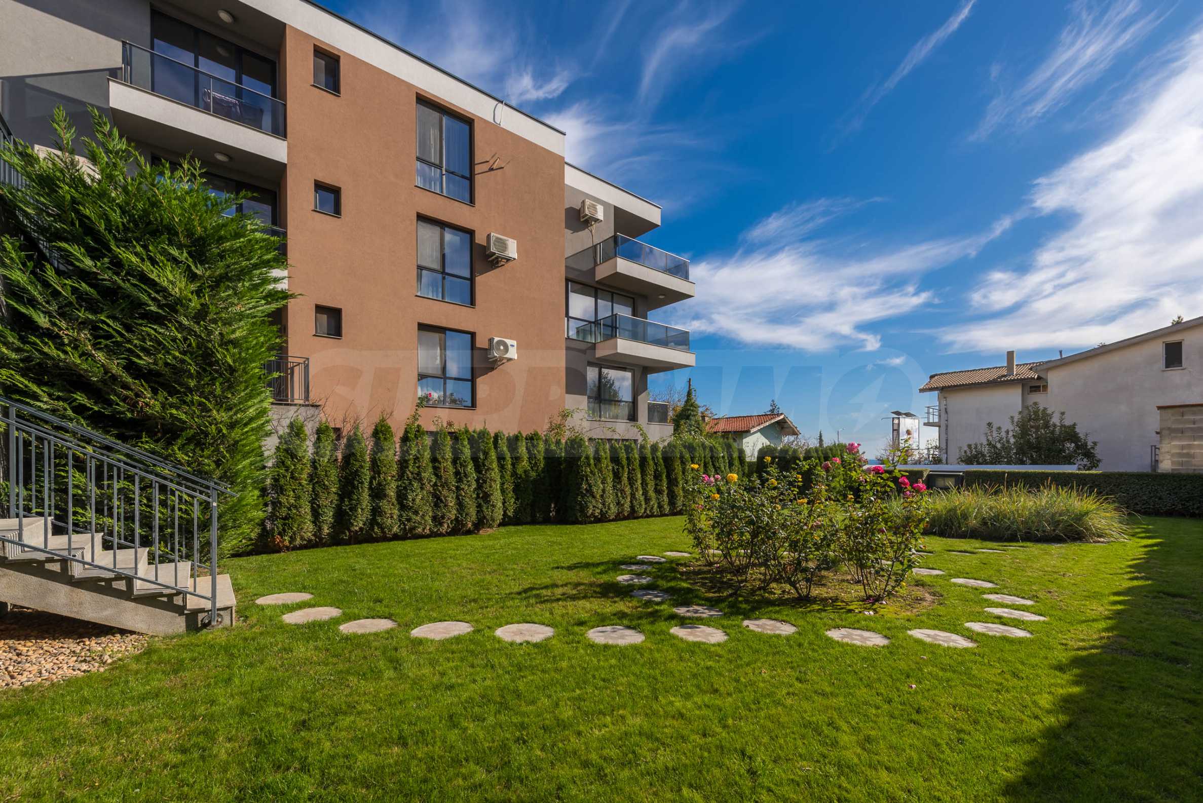 Голямо предимство на имота е озелененият двор, който се ползва само от този апартамент. Там ще откриете беседка, обвита с жасмин, който ухае през цялото лято, както и маса за хранене и сутрешно кафе, от която може да се насладите на прекрасните изгреви съчетани с частична морска гледка.