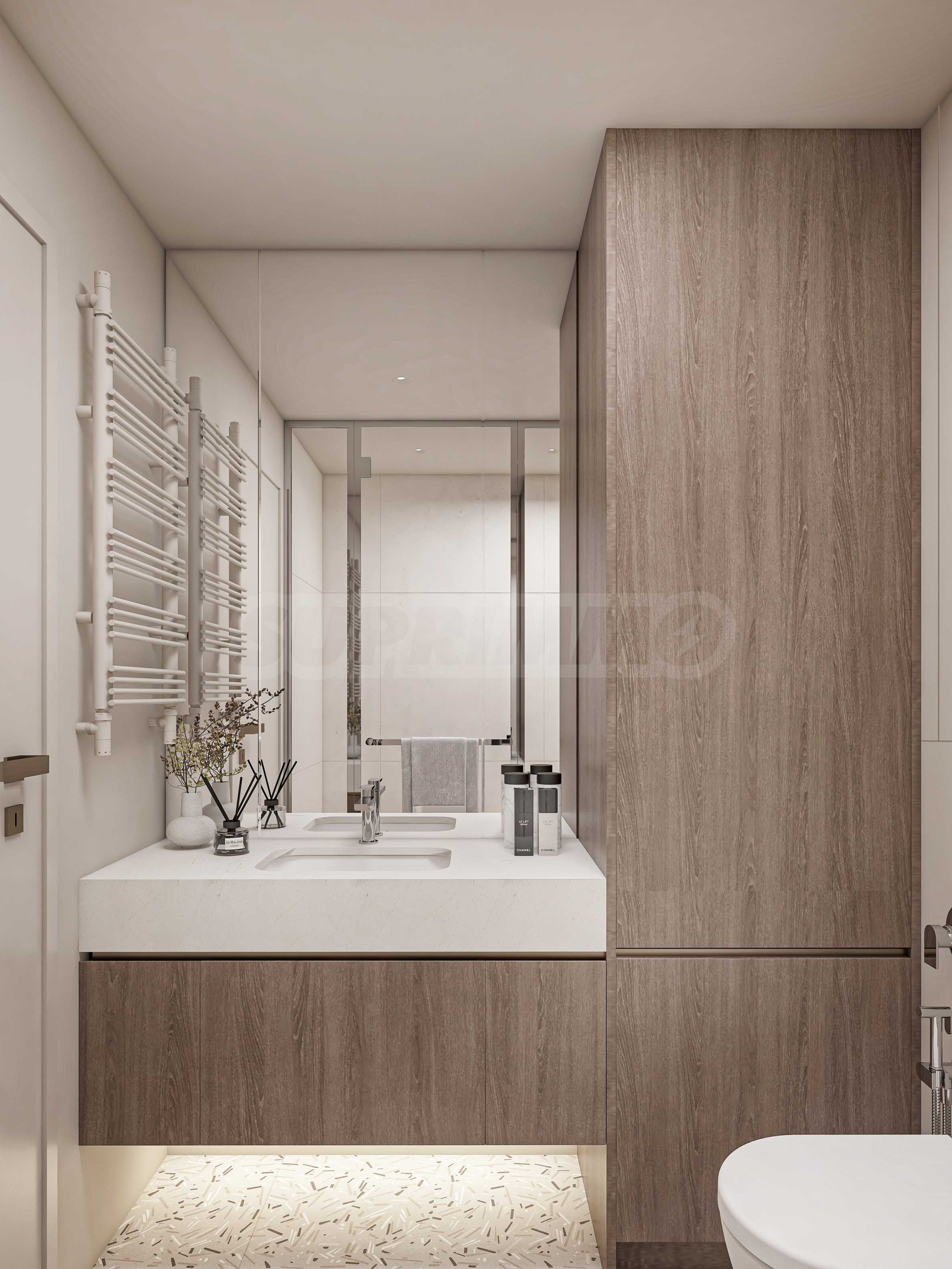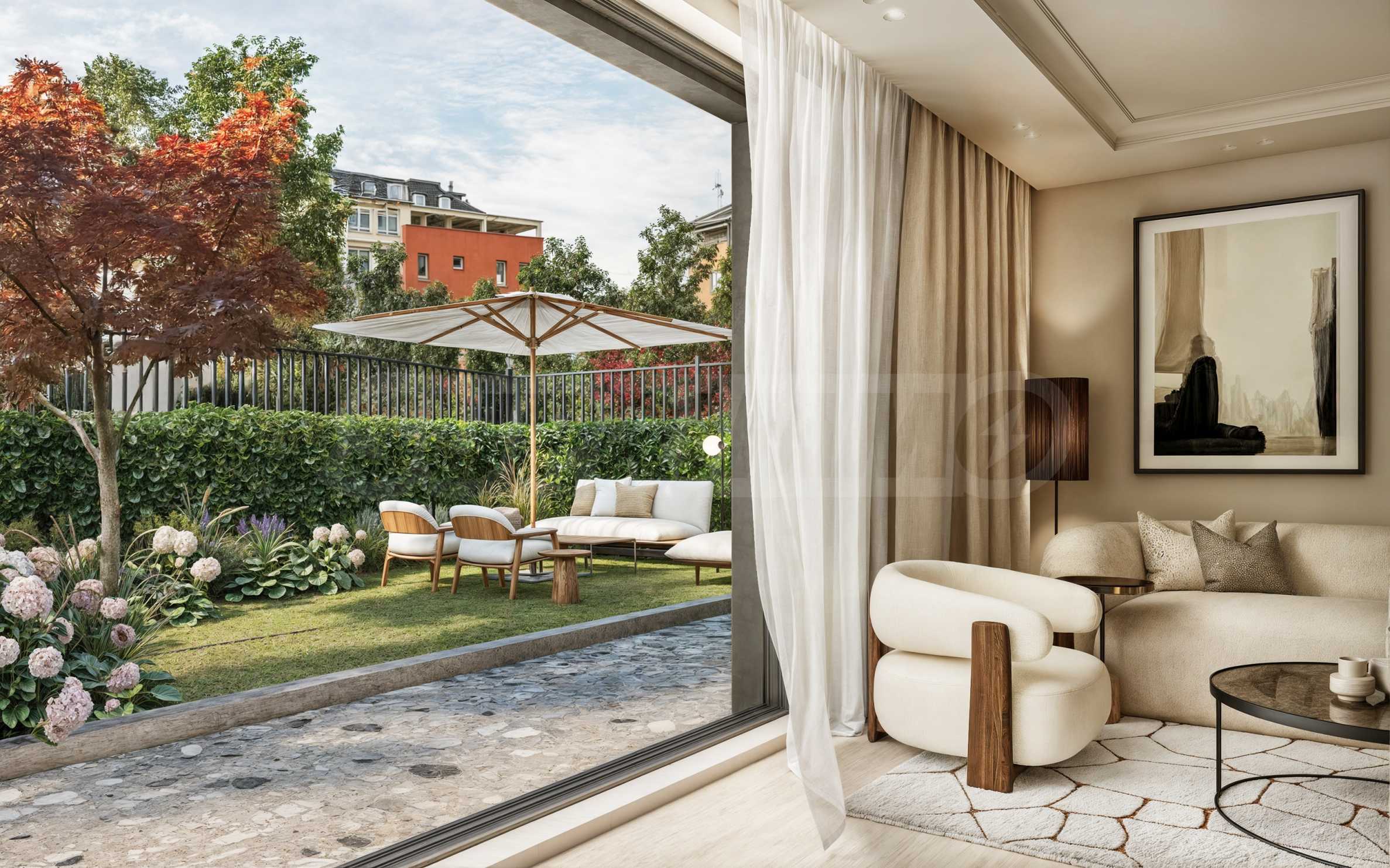 Апартаментът се намира на партерния етаж на сградата и е с обща жилищна площ 90.35 кв.м. Изложението е североизток-югозапад, а разпределението е комфортно и функционално, като всяка стая разполага с излаз към тераса. Имотът разполага със слънчево дворно пространство с площ 28.81 кв.м, което допълва интериора и може да се превърне в място за отдих и почивка на открито.