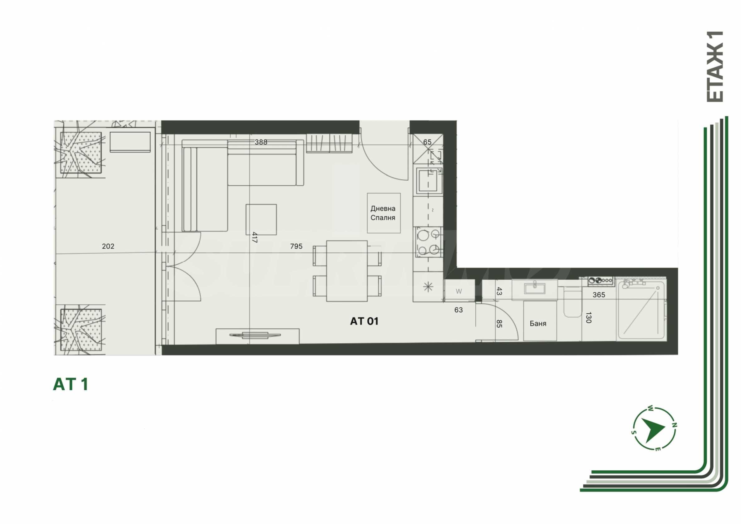 Жилището, което избрахме да Ви представим е с обща площ 42.01 км.м и е разположено на първия етаж в сградата. С благоприятно южно изложение, ателието е окъпано в светлина, а малката градина, с която разполага е прекрасно място за отдих и почивка на открито. Разпределението включва всекидневна с кухня, тераса и баня с тоалетна.