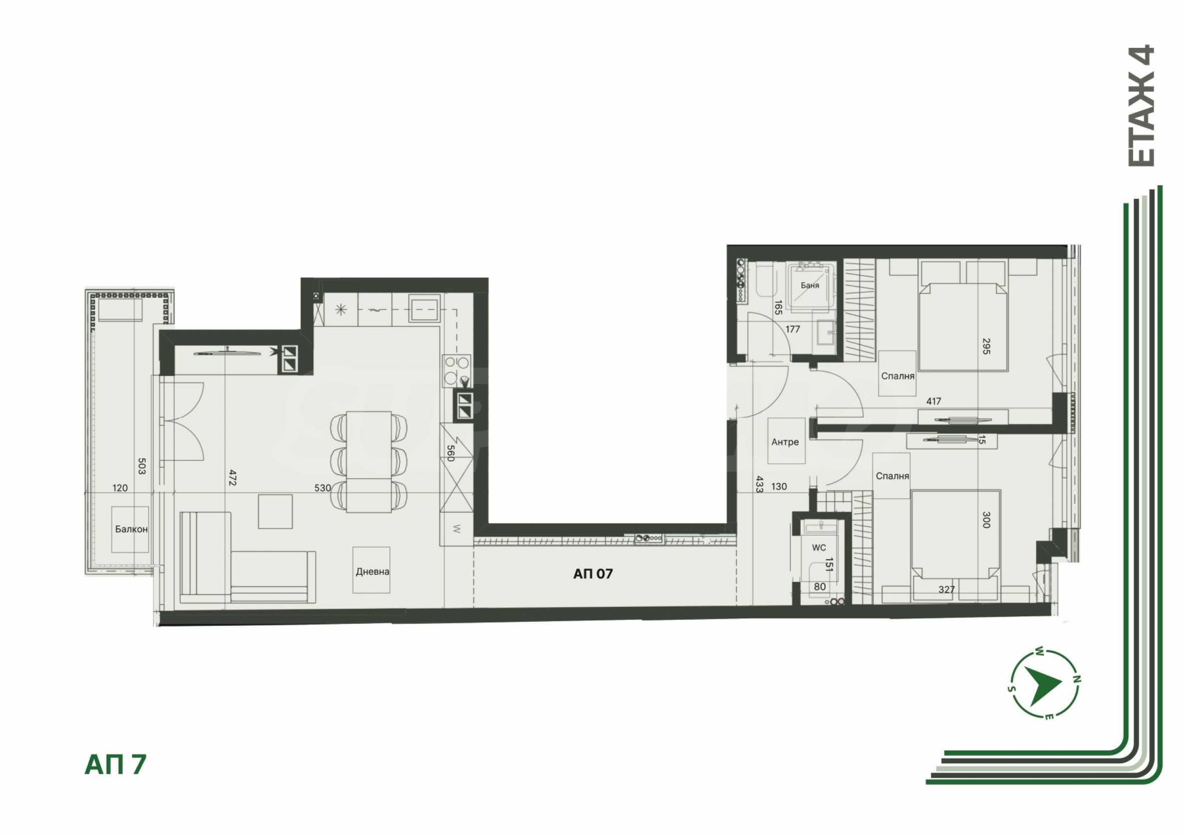 Имотът се намира на 4-ти етаж и има обща площ 106.30 кв.м, чиста площ - 83.63 кв.м. Издава се в степен на завършеност по БДС, с висок клас PVC дограма REHAU, с троен стъклопакет и блиндирана входна врата. Разпределението включва антре, тоалетна, баня/тоалетна, две спални, коридор, дневна с кухня и трапезария и с тераса. Към жилището има мазе от 4.93 кв.м.