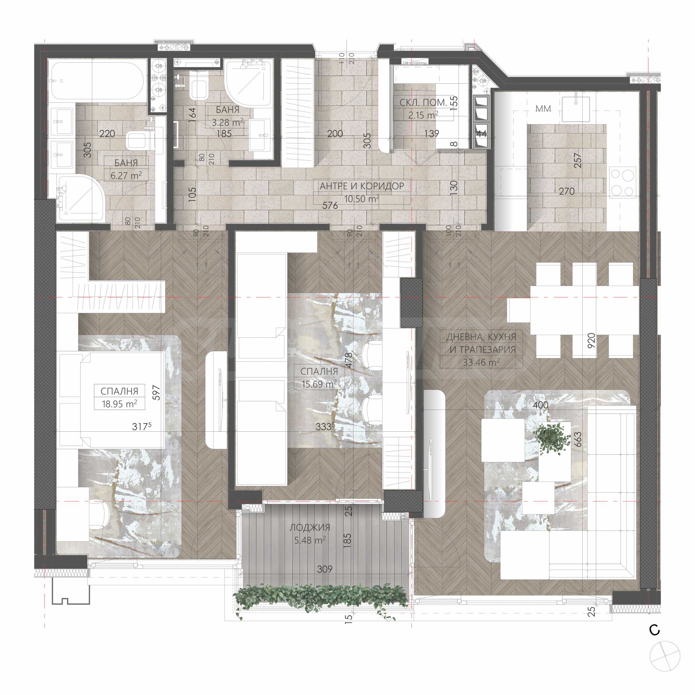 Апартамент №А405 е разположен на 4-ти етаж и има южно изложение. На чиста площ от 109.42 кв.м са разпределени: антре, две бани с тоалетна, мокро помещение, просторна дневна с кухня и трапезария, две спални, тераса с излаз от трите стаите.