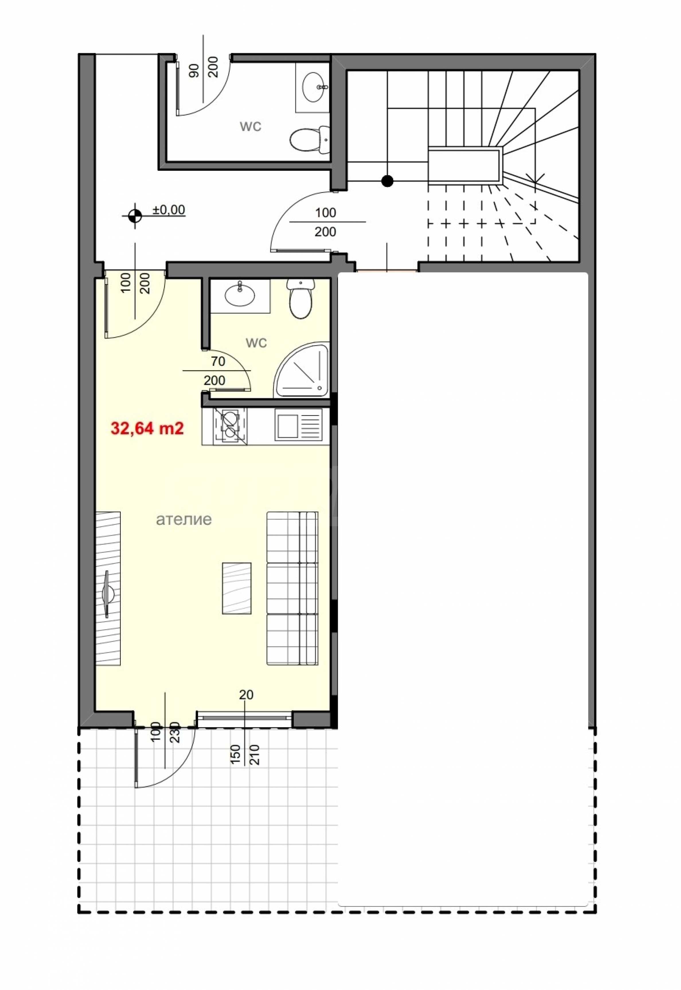 Имотът е с обща площ от 32,64 кв.м, разположен на партерен етаж със собствен двор.