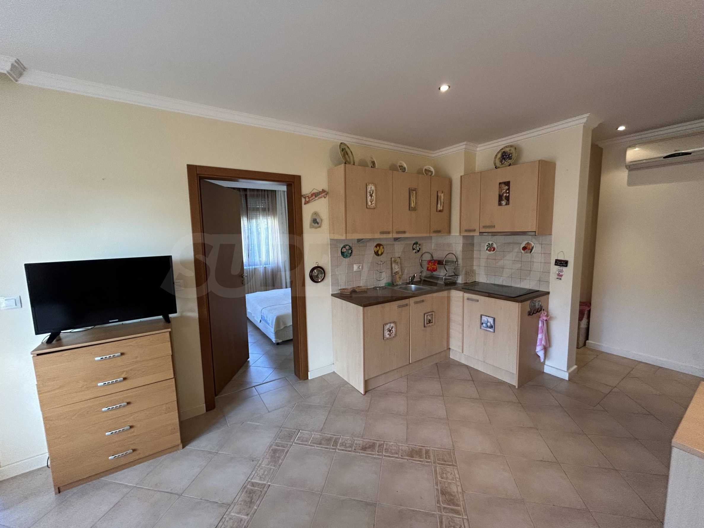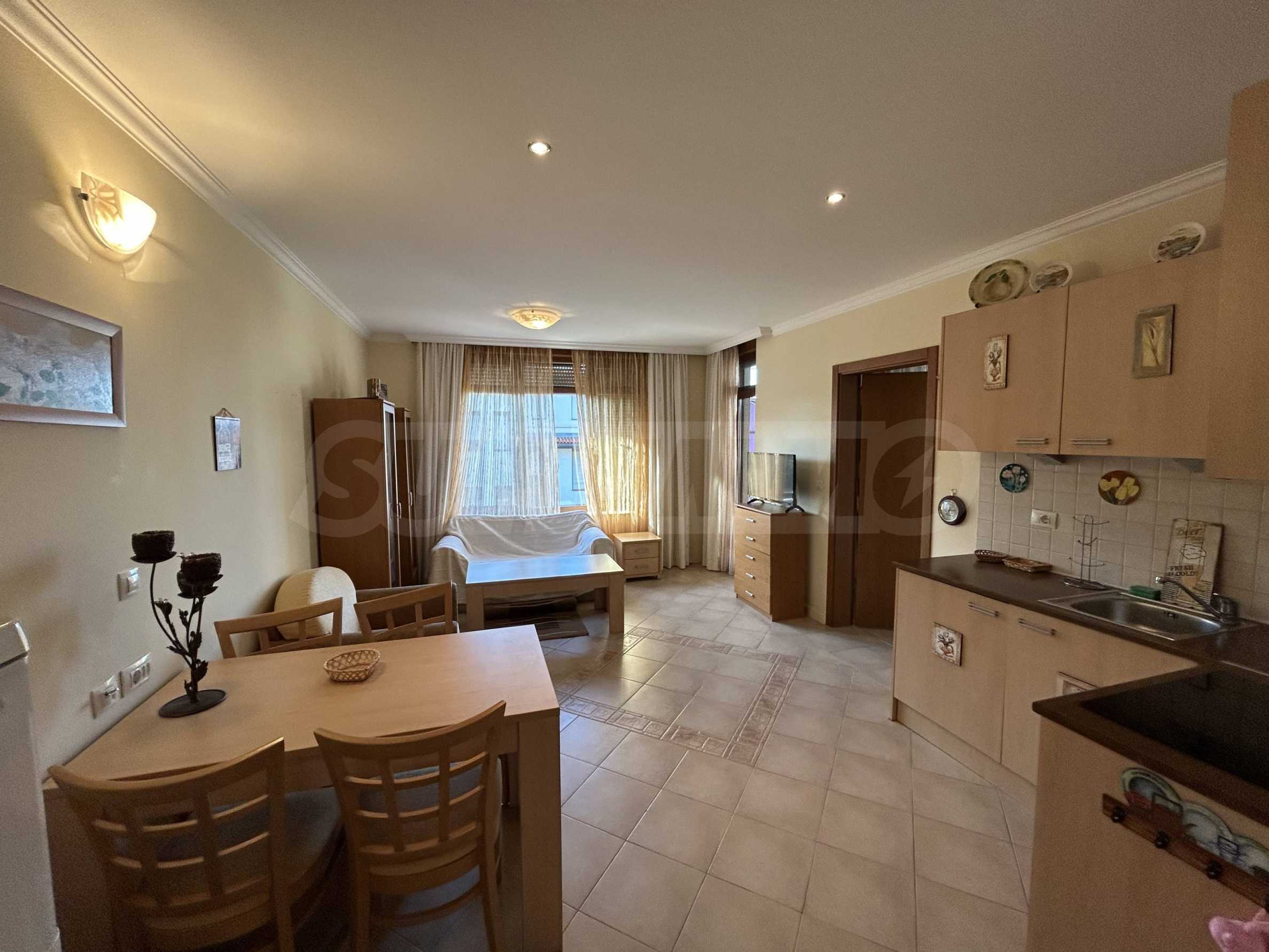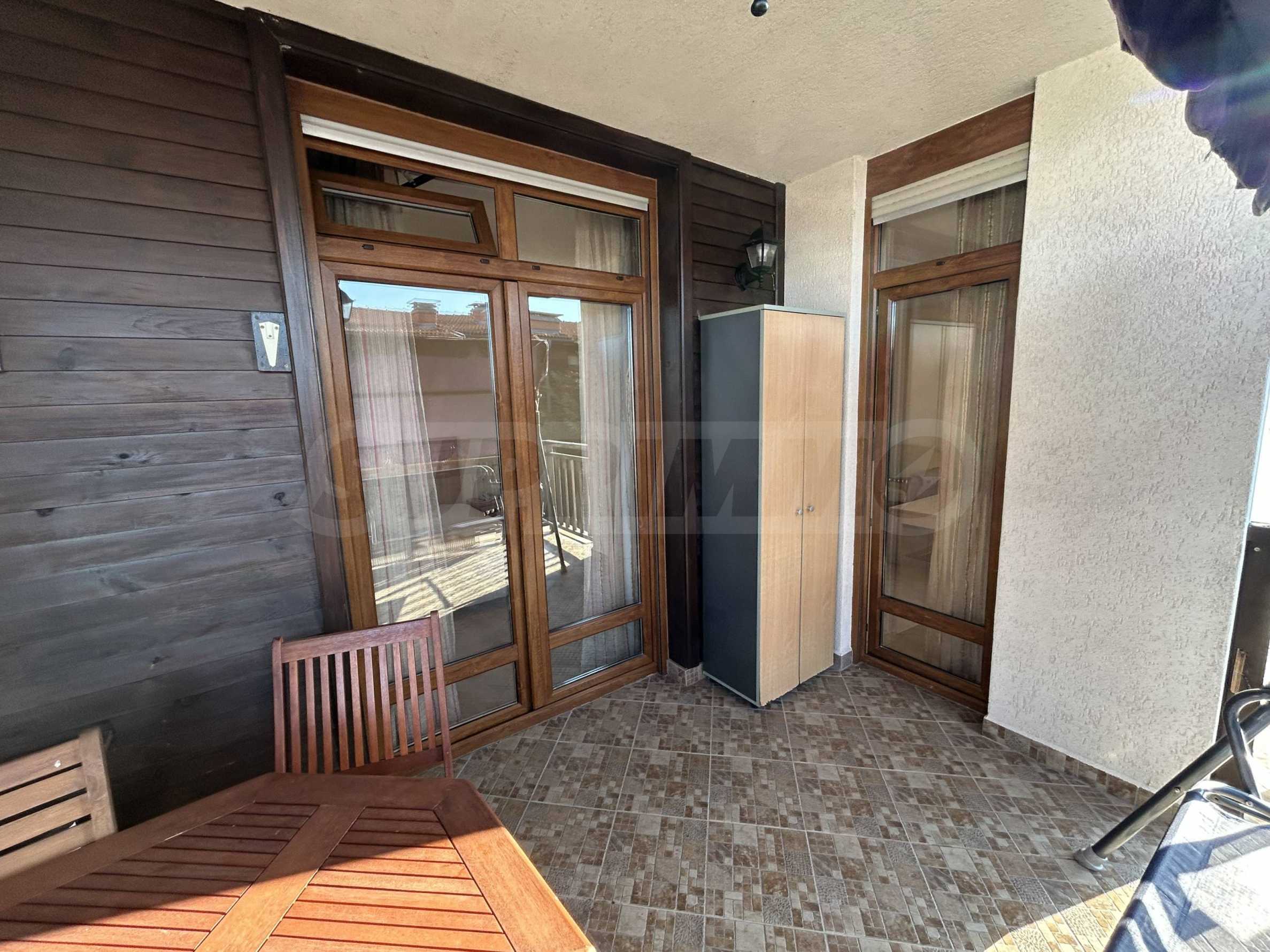 Имотът се намира на среден етаж, с обща площ от 89 кв.м, ориентиран към вътрешния двор на комплекса. Жилището е оборудвано с нови мебели и техника, запазва усещане за светлина, мекота и морски характер. Подходящо е както за ваканционно ползване, така и за целогодишен престой.