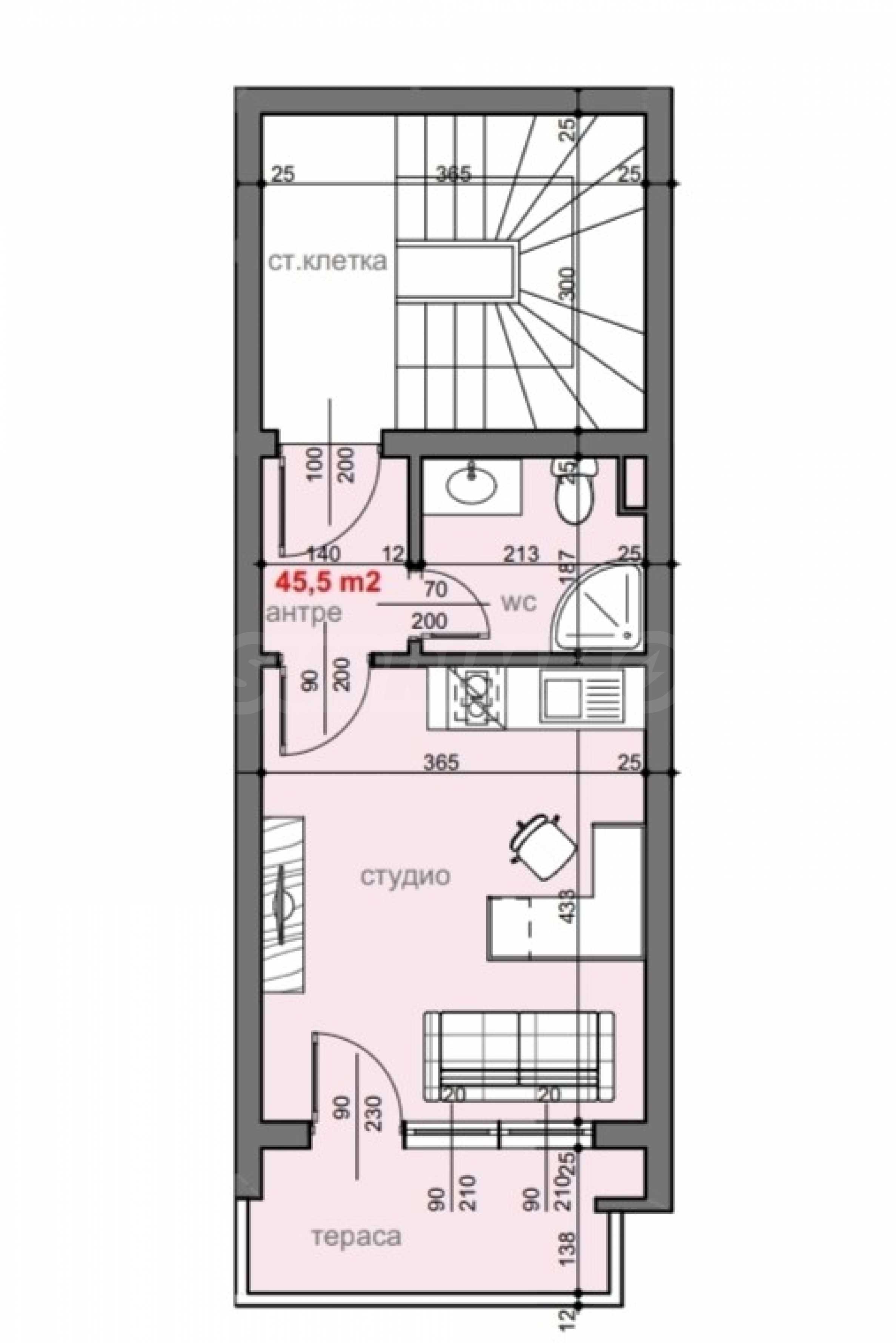 Имотът е с обща площ от 45,5 кв.м, разположен на 1-ви етаж с тераса.