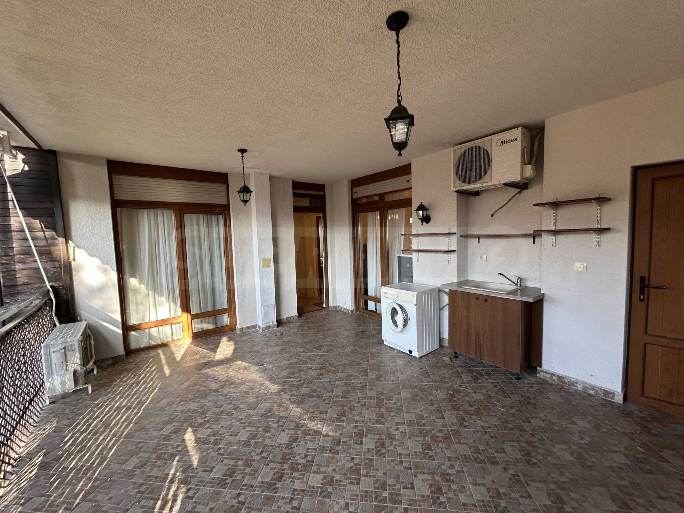 Имотът е с обща площ от 114 кв.м, ориентиран към вътрешната част на комплекса, осигуряващ тишина и комфорт. Жилището е модерно оборудвано, изпълнено в светли, успокояващи тонове и приятно морско излъчване. Подходящо е както за ваканционно ползване, така и за целогодишно обитаване.