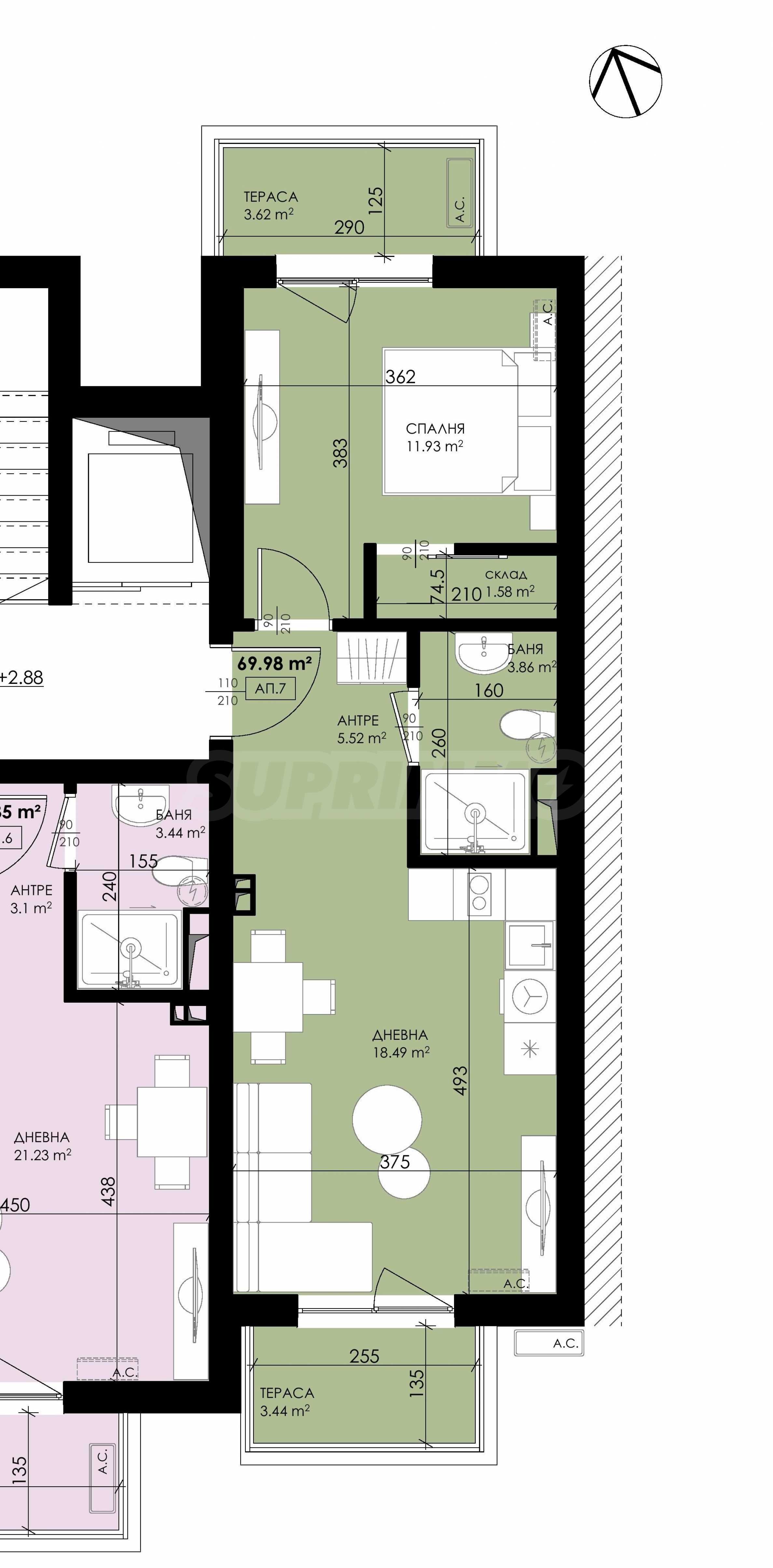 Имотът е с обща площ от 70,01 кв.м, разположен на втори етаж, със следното разпределение: антре, дневна с кухня, спалня с гардеробна, баня с тоалет и две тераси.