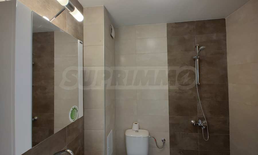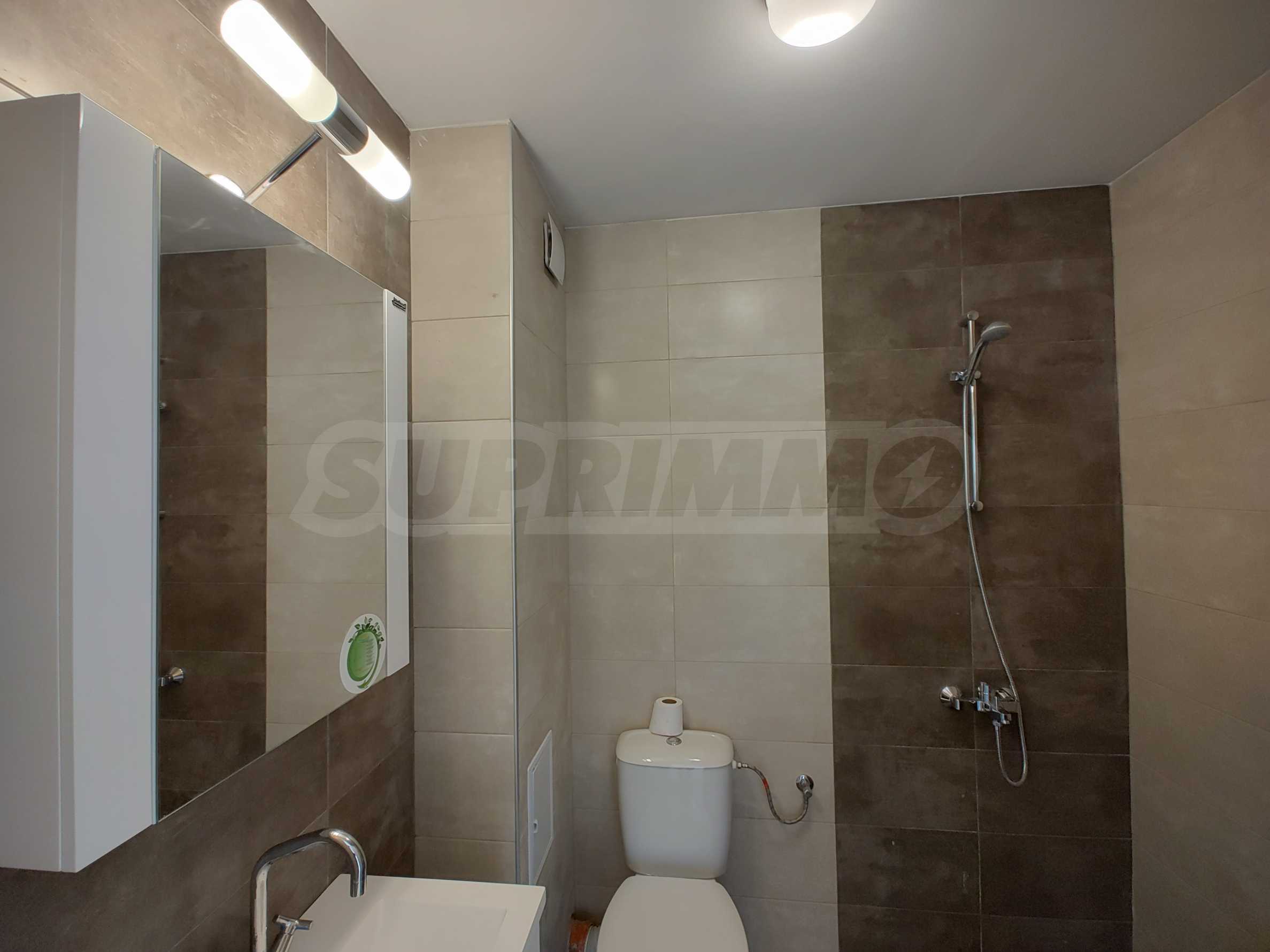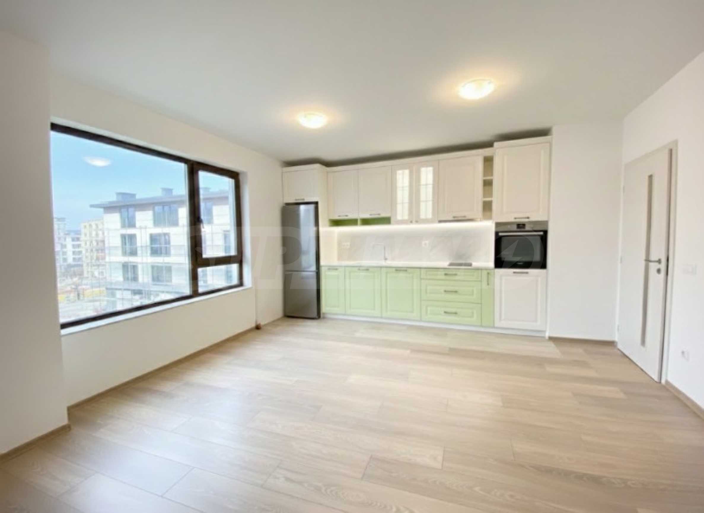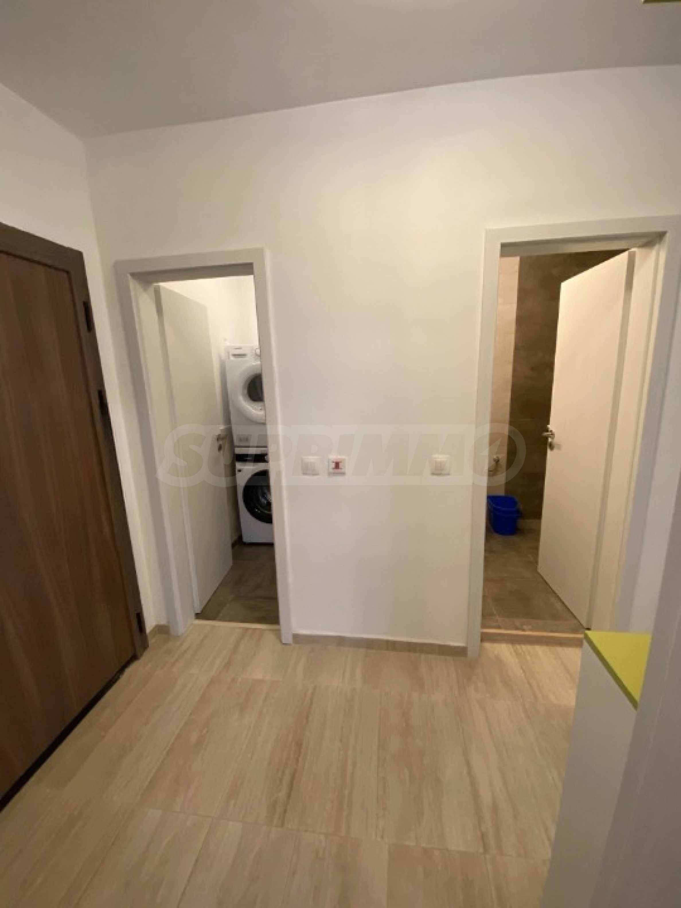 Апартаментът е чисто нов и изпълнен с висок клас материали, като антрето и кухненското обзавеждане са изработени по индивидуален проект. Оборудван е с премиум смарт електроуреди Samsung и Teka, включително съдомиялна, вградена фурна, котлони, абсорбатор, пералня, сушилня и бойлер, всички в енергиен клас A++.