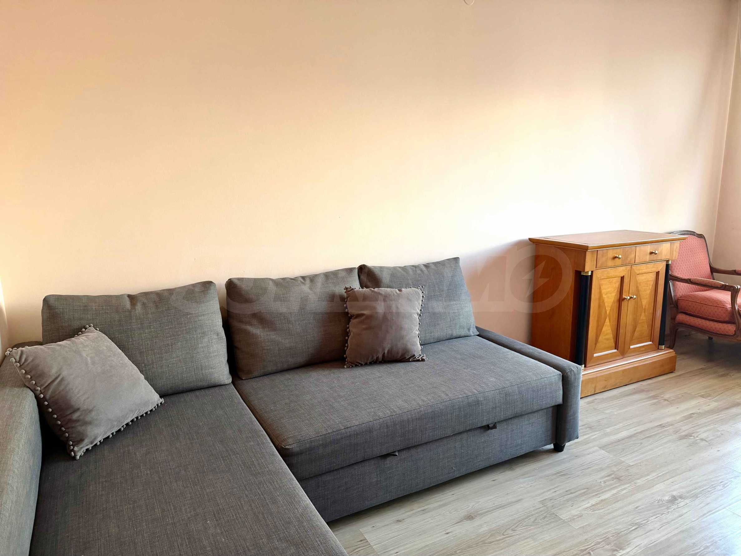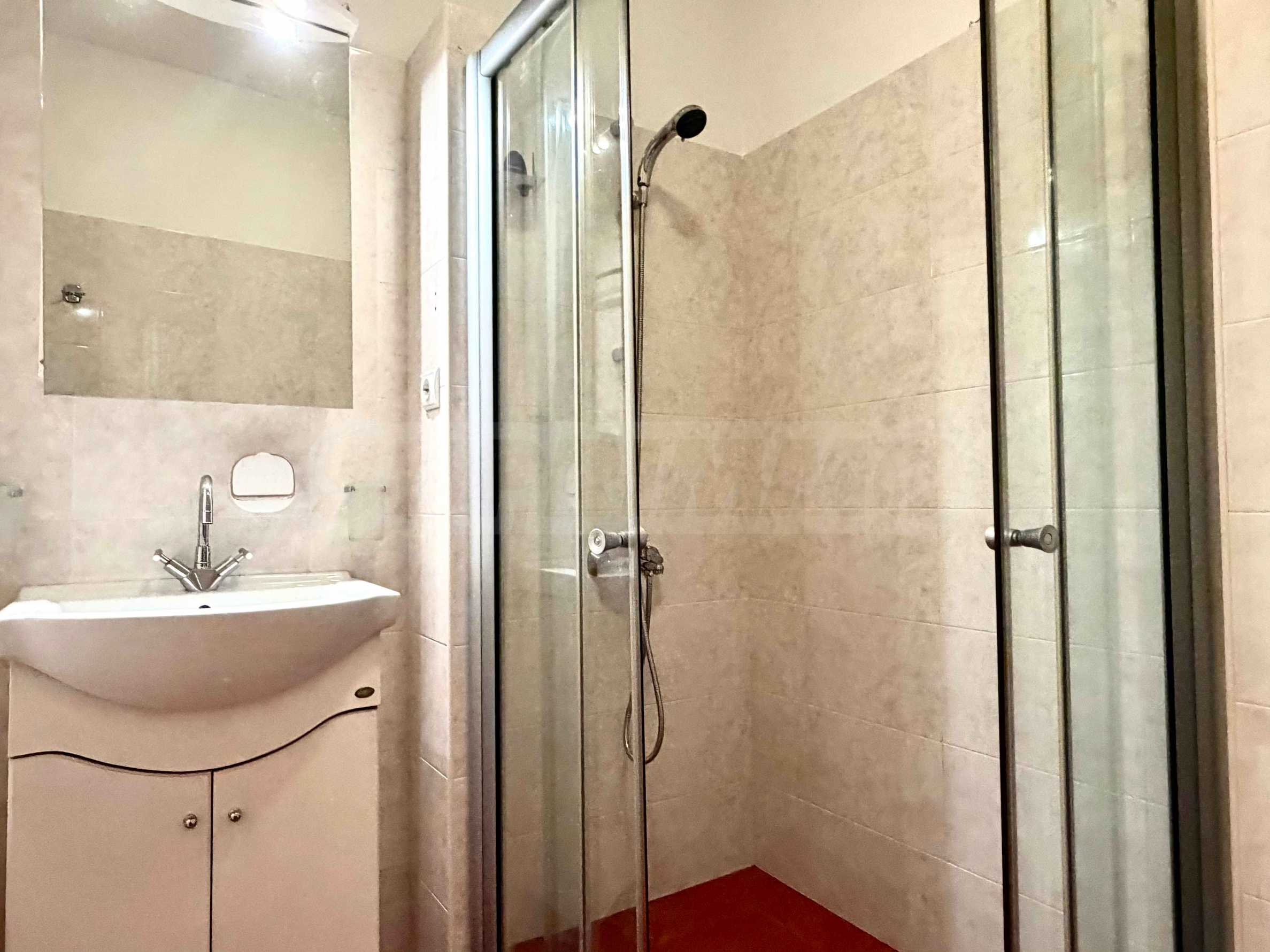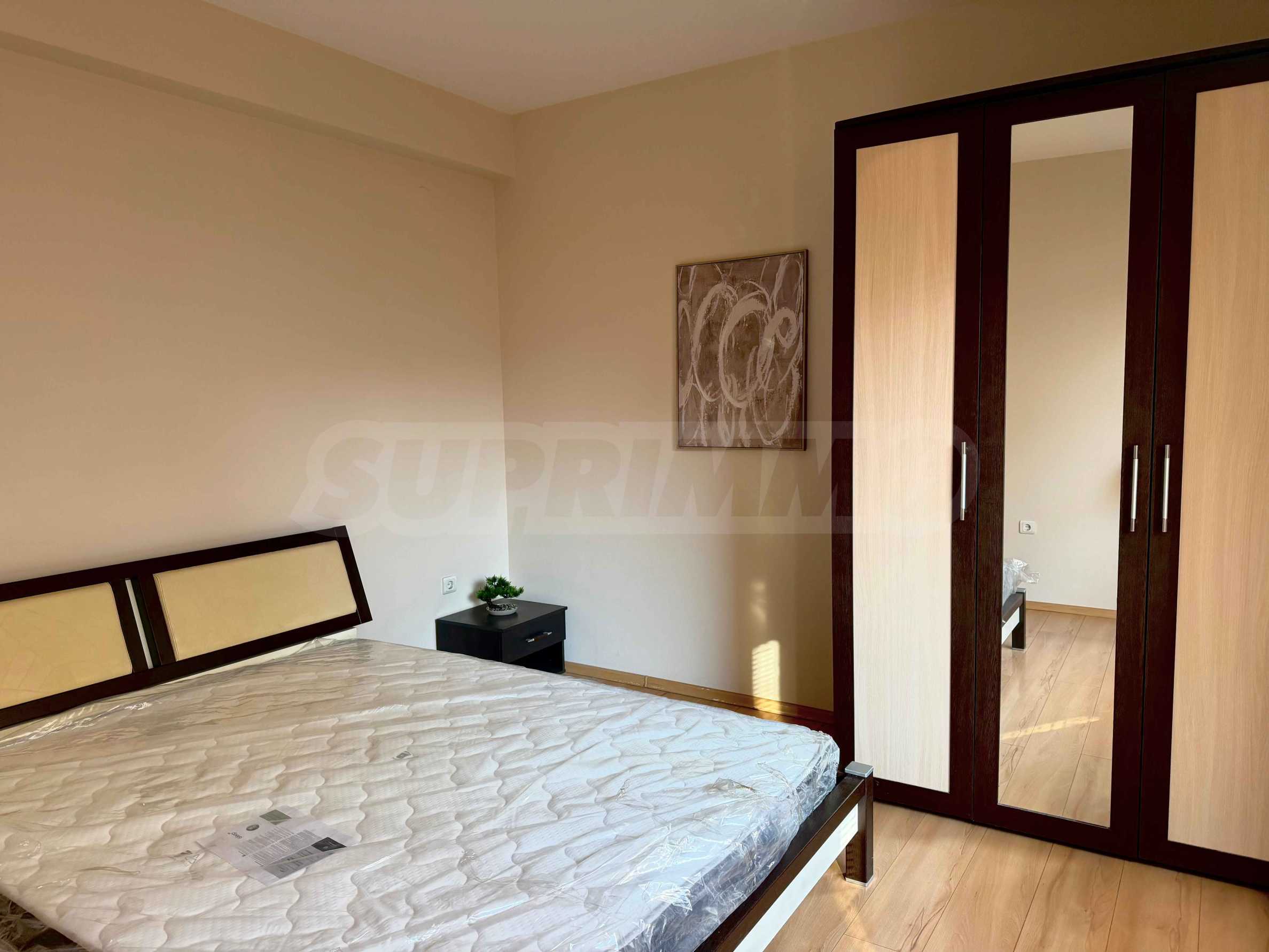 Апартаментът разполага с две самостоятелни спални, просторна дневна, както и допълнителна стая, която може да бъде обособена по преценка на наемателя – като трета спалня или кабинет. Санитарните помещения включват баня с тоалетна, както и отделна тоалетна, което допринася за удобството при ежедневно ползване. Жилището е в много добро общо състояние, с висок клас електроуреди, южно изложение, осигуряващо отлична светлина и топлина през целия ден. Отоплението е посредством централно парно, като за допълнителен комфорт са налични и климатици във всички основни помещения. Към имота има и мазе.