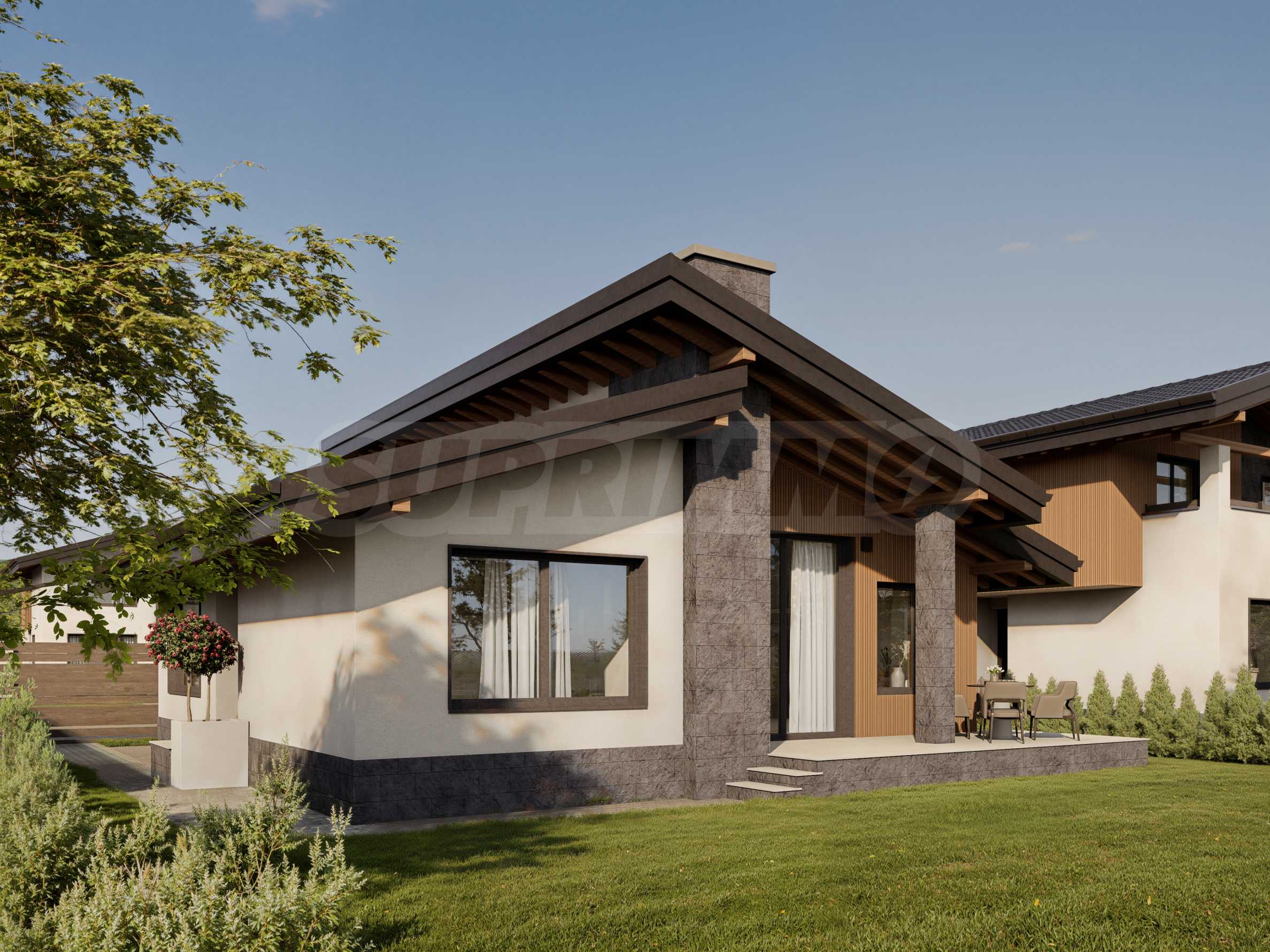 • Фасада с естествен камък и декоративни елементи с имитация на дърво;