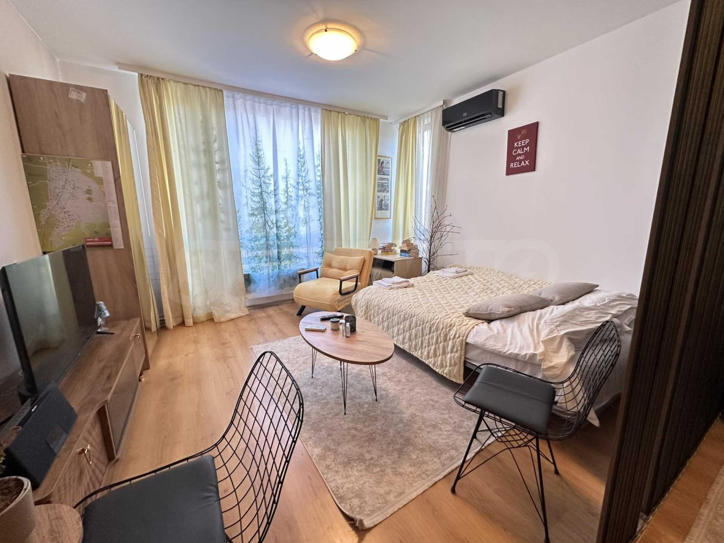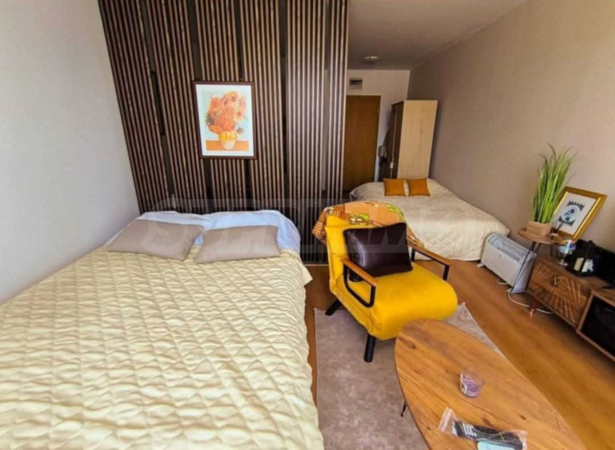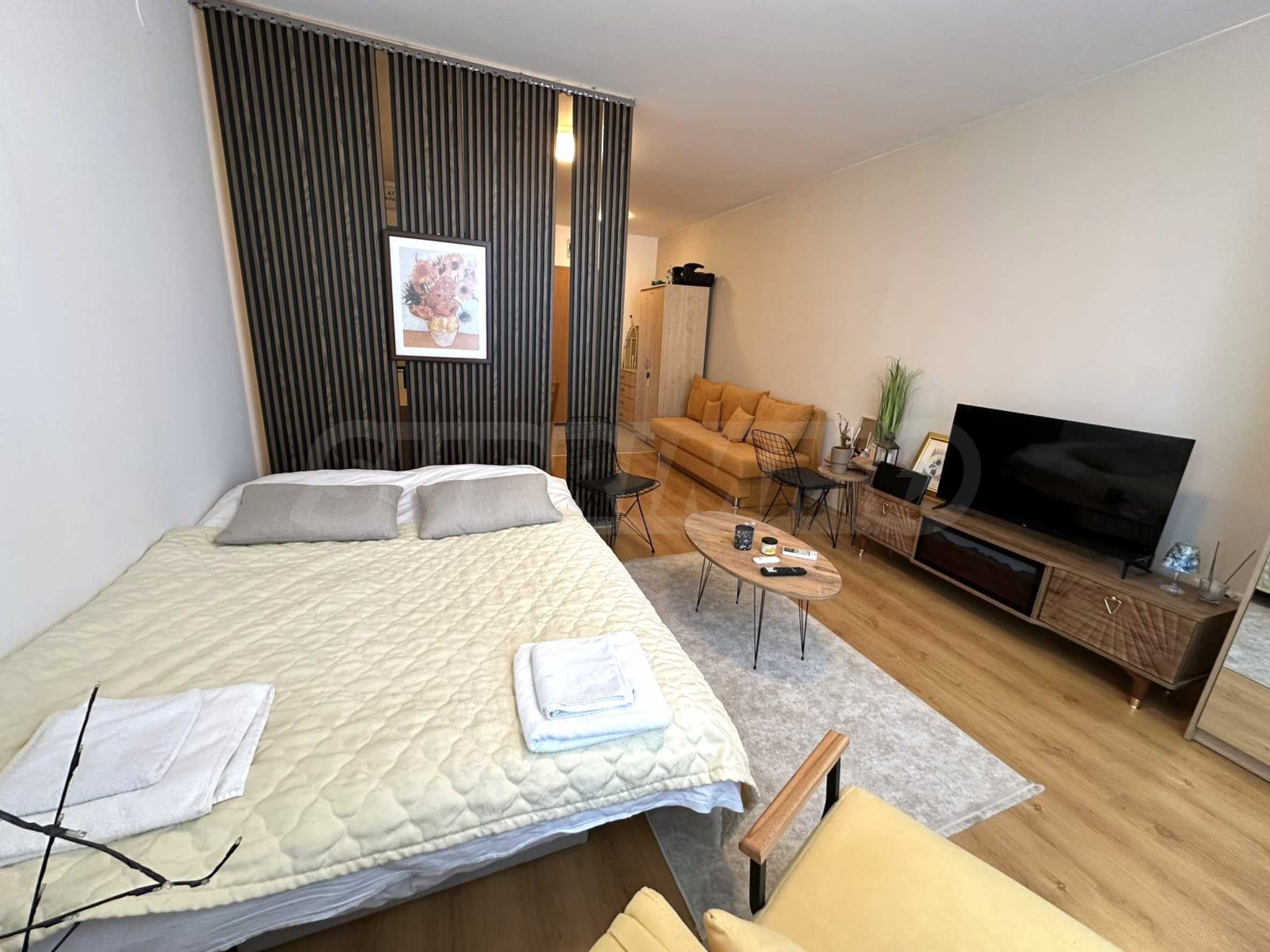 •Дневната зона включва спалня, фотьойл и телевизор, създавайки уютна и комфортна обстановка;