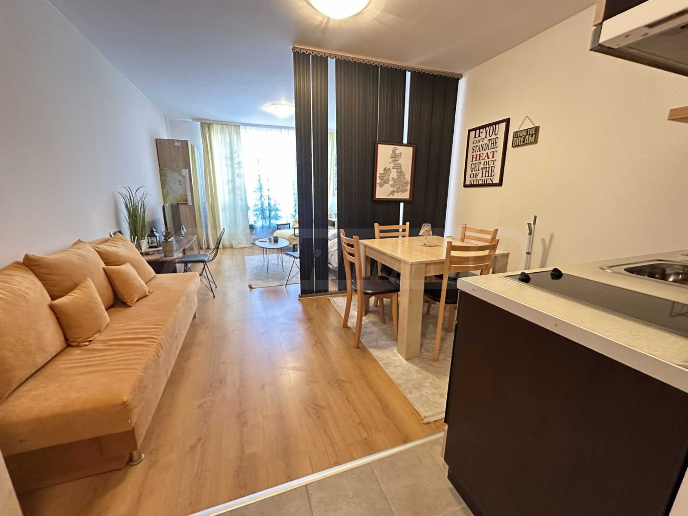•Дневната и кухненският кът са визуално отделени чрез декоративна стена, която придава стил и ясно разграничение между зоните.