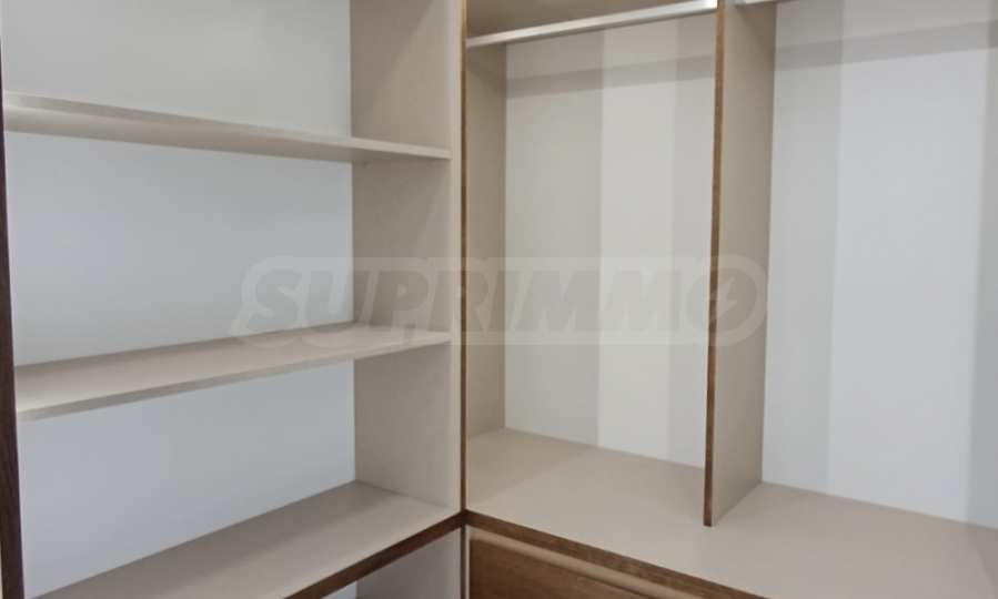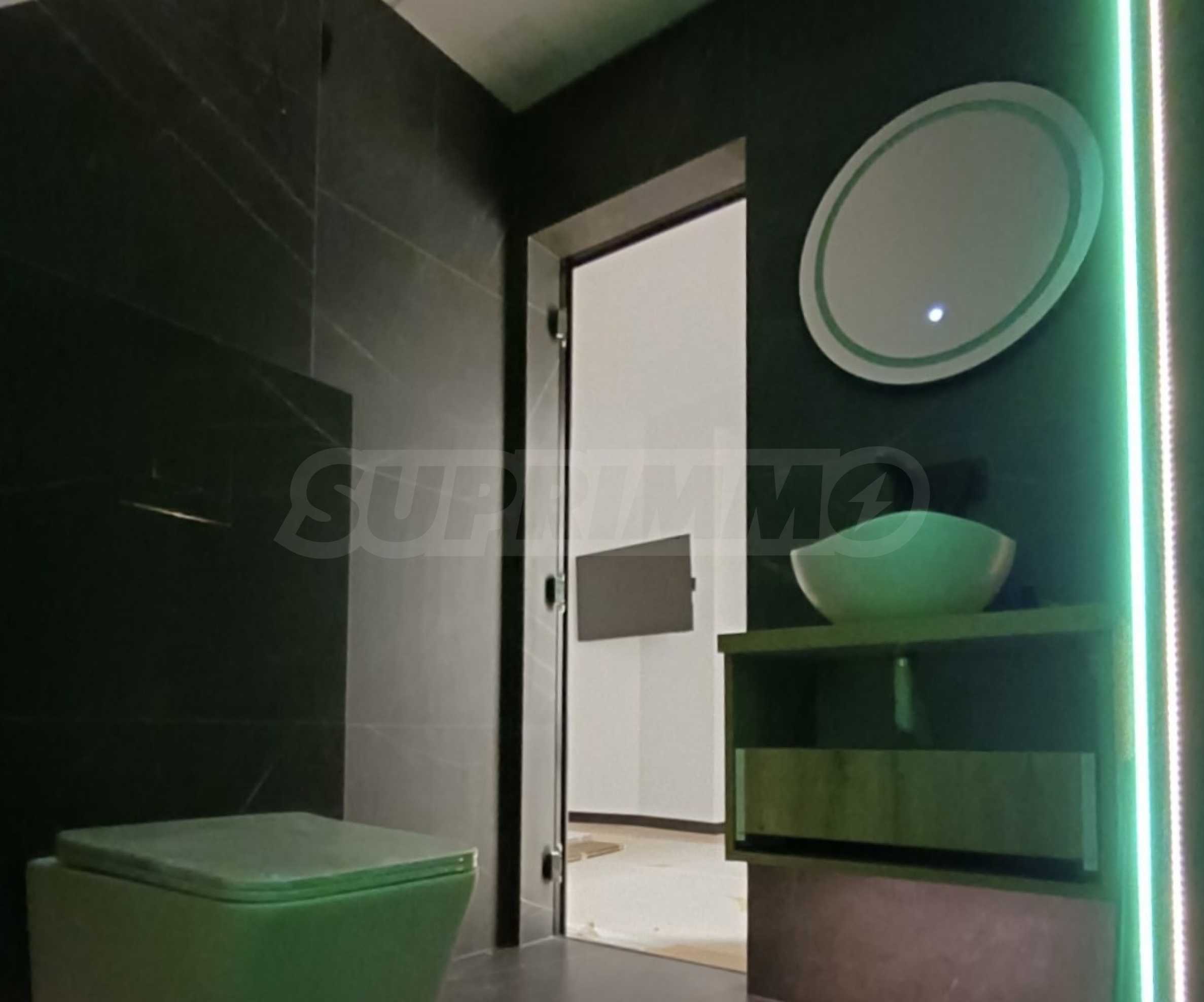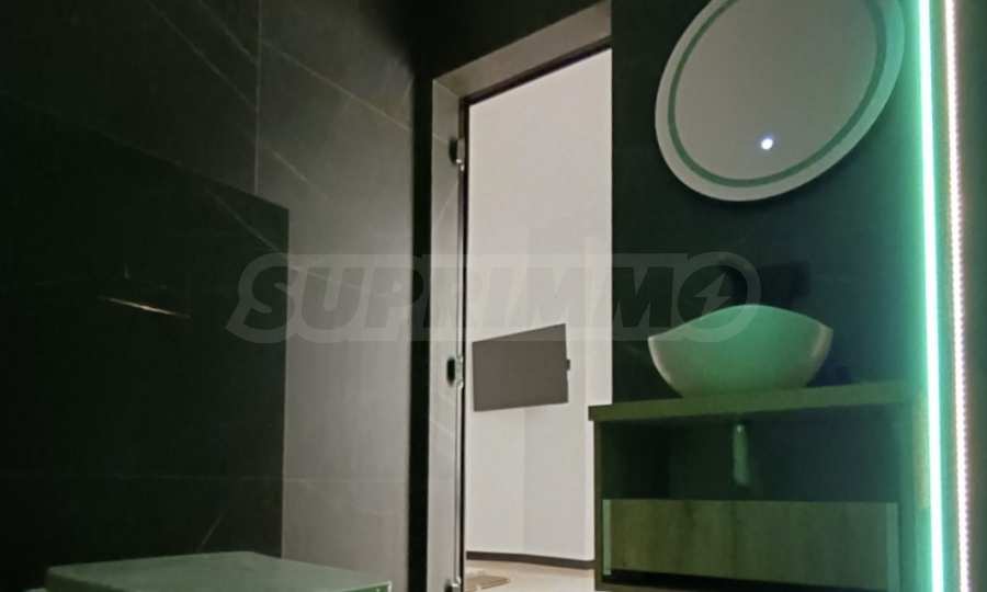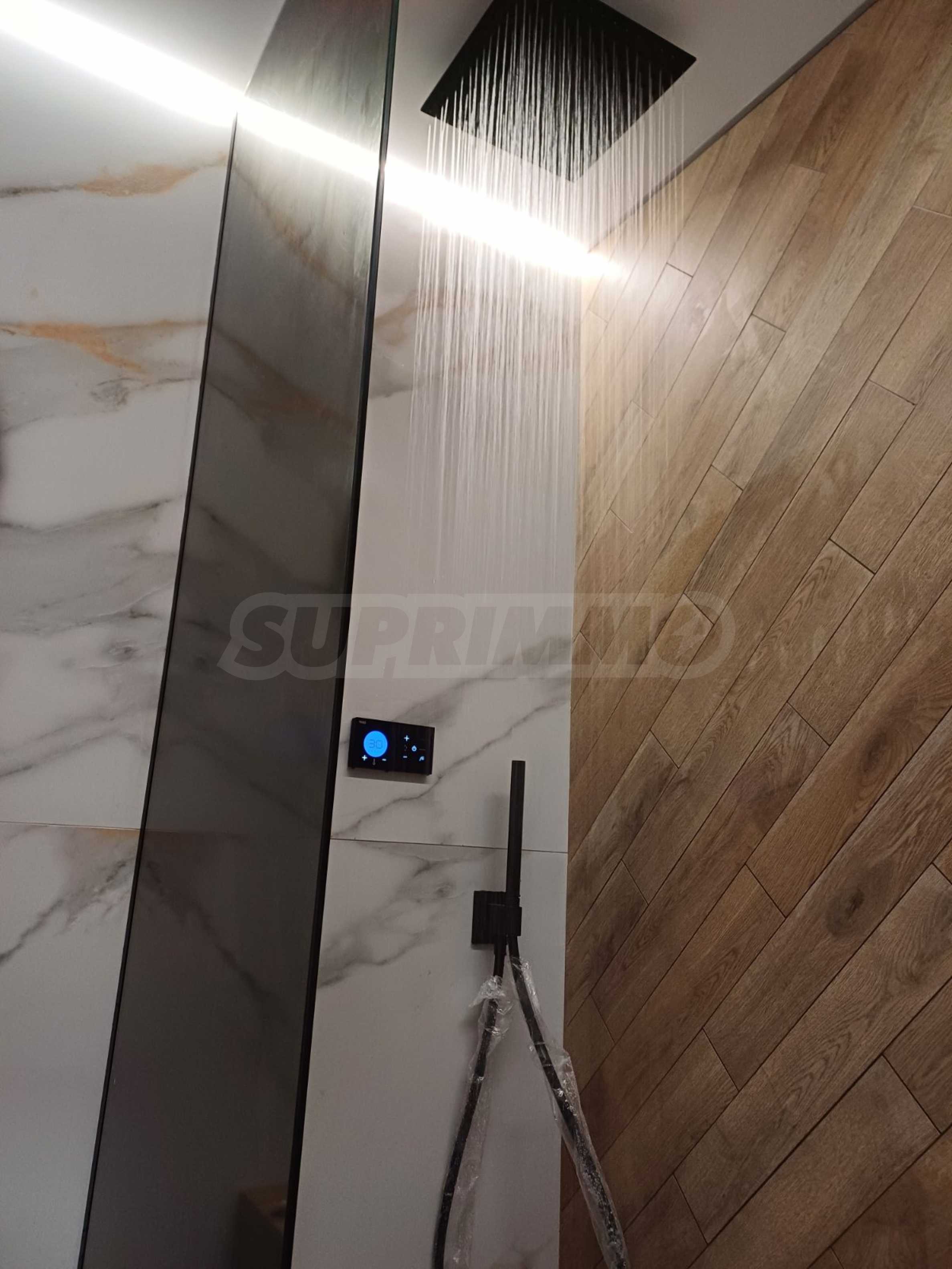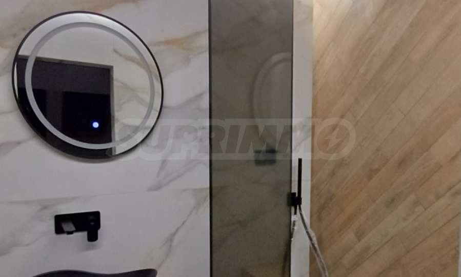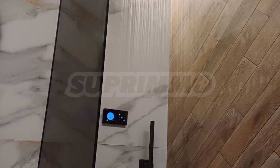 Бани: Душ системи Tres (Spain) – напълно автоматизирани, вградени структури Grohe с пневматично пускане и бутони с декора на плочките, смесители и умивалници Roca, мебели за баня от PVC, италиански гранитогрес Marazzi с герунг, линейни сифони, вградени в стената, вградени аксесоари Parro – четка и държач за тоалетна хартия,топление и комфорт:Инверторни климатици висок клас Toshiba с гаранция