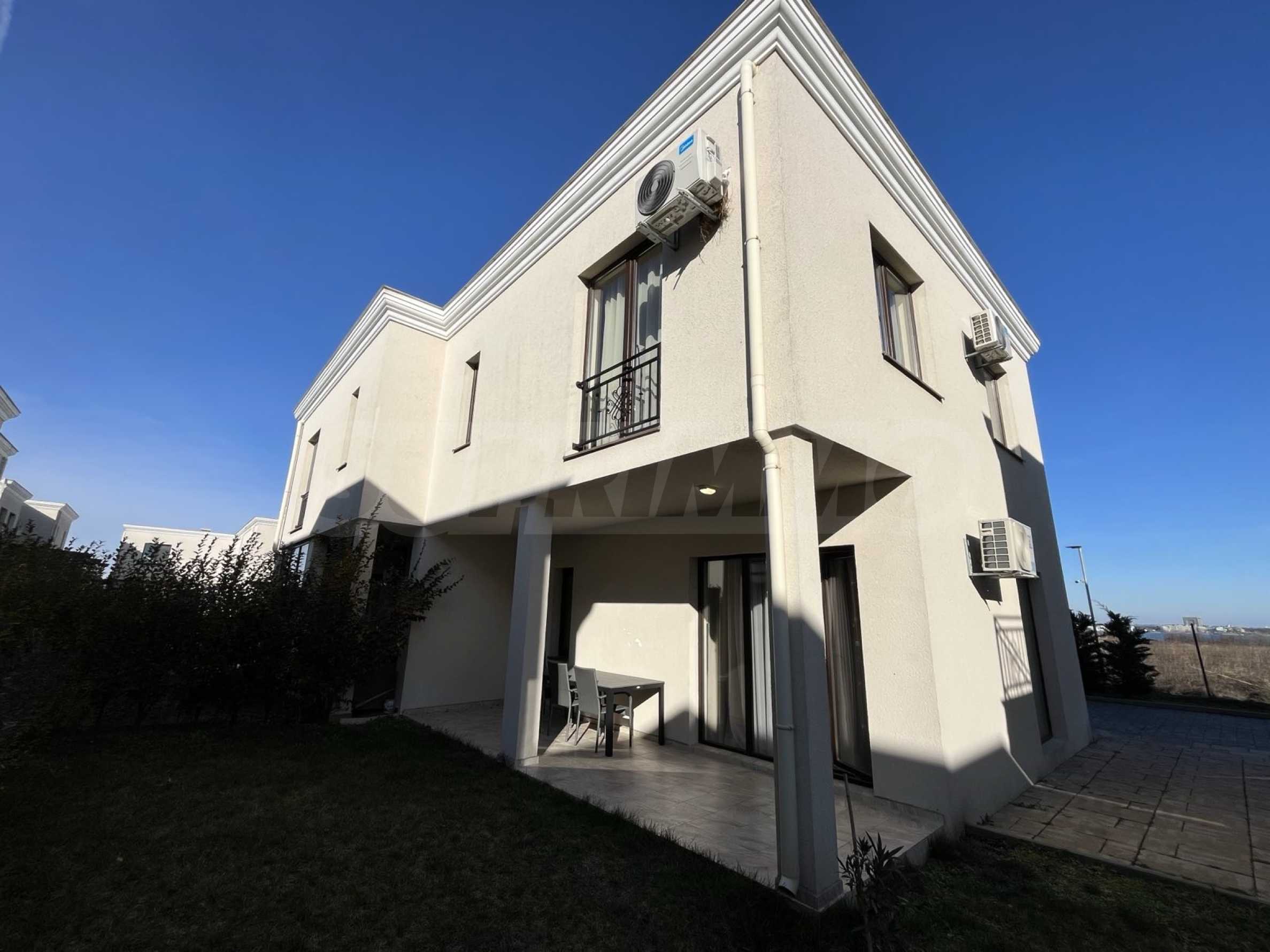 Представяме двуетажна къща под наем, разположена в престижно затворено селище на първа линия до морето, в местност Лахана, която съчетава тишина и уединение с удобството на бърз достъп до кв. "Сарафово", Поморие и Бургас.