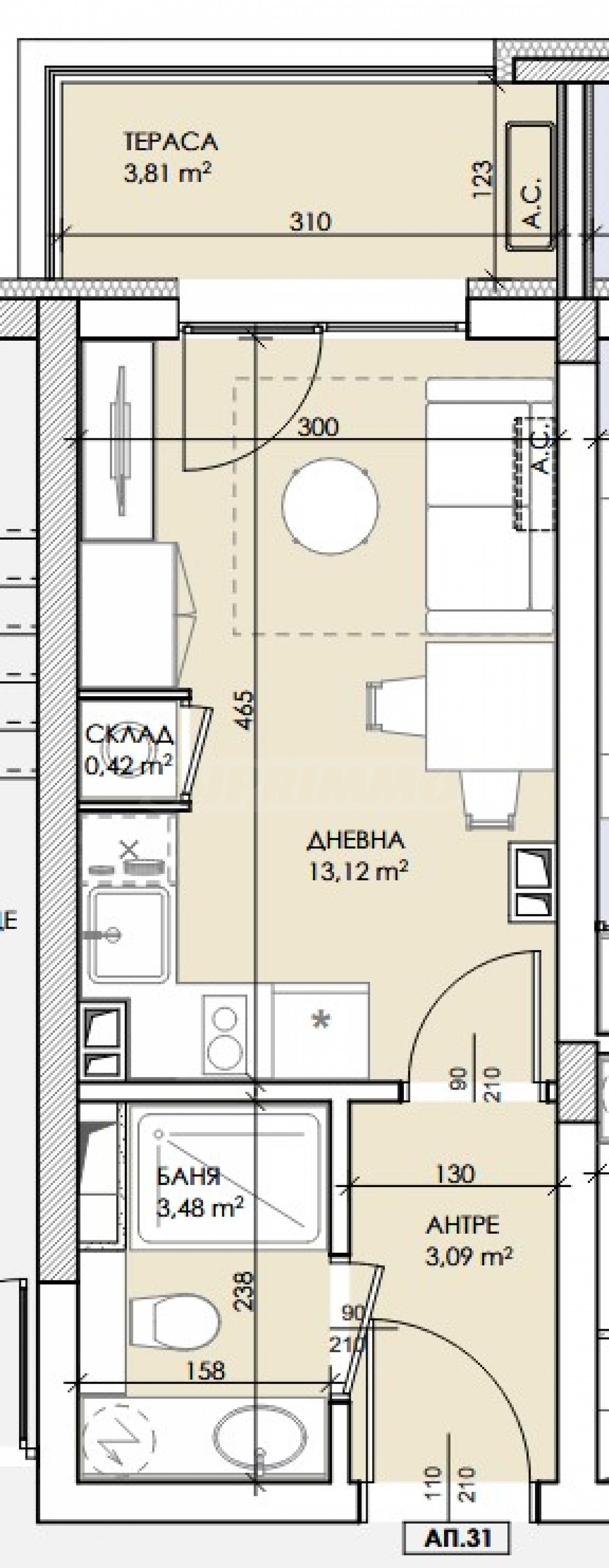 Имотът е с площ от 34,31 кв.м, ситуиран на 4-ти етаж с тераса. Подходящ е както за целогодишно живеене, така и за инвестиция.