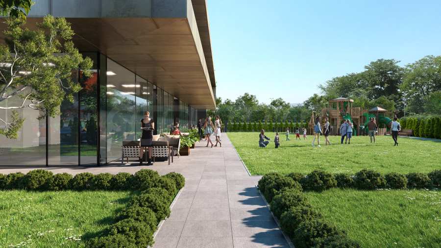 • Зелен пояс към булеварда, 3000 кв.м зелени площи, детска площадка, алеи, пейки, градина на 20-ия етаж и 75 паркоместа за посетители.