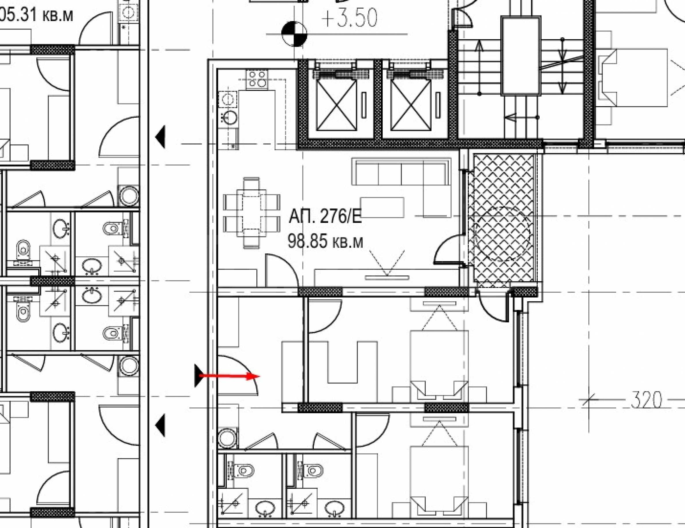Имотът е разположен на 2-ри етаж и е с обща площ 114.21 кв.м, чиста площ - 98.85 кв.м, върху които са разпределени: антре, две бани с тоалетни, дневна с кухня, тераса с излаз от две от стаите, две спални. Жилището се издава в степен на завършеност по БДС, с петкамерна PVC дограма Rehau, с троен стъклопакет и блиндирана входна врата.