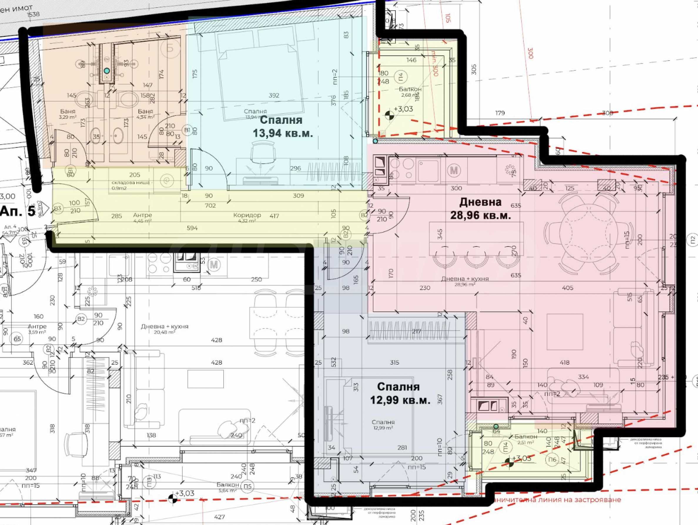 Конкретната оферта е за апартамент 5, състоящ се от две спални, хол с кухненски бокс, две бани с тоалетни и две тераси.