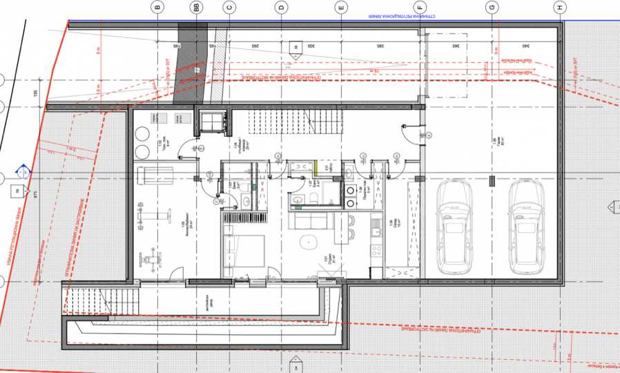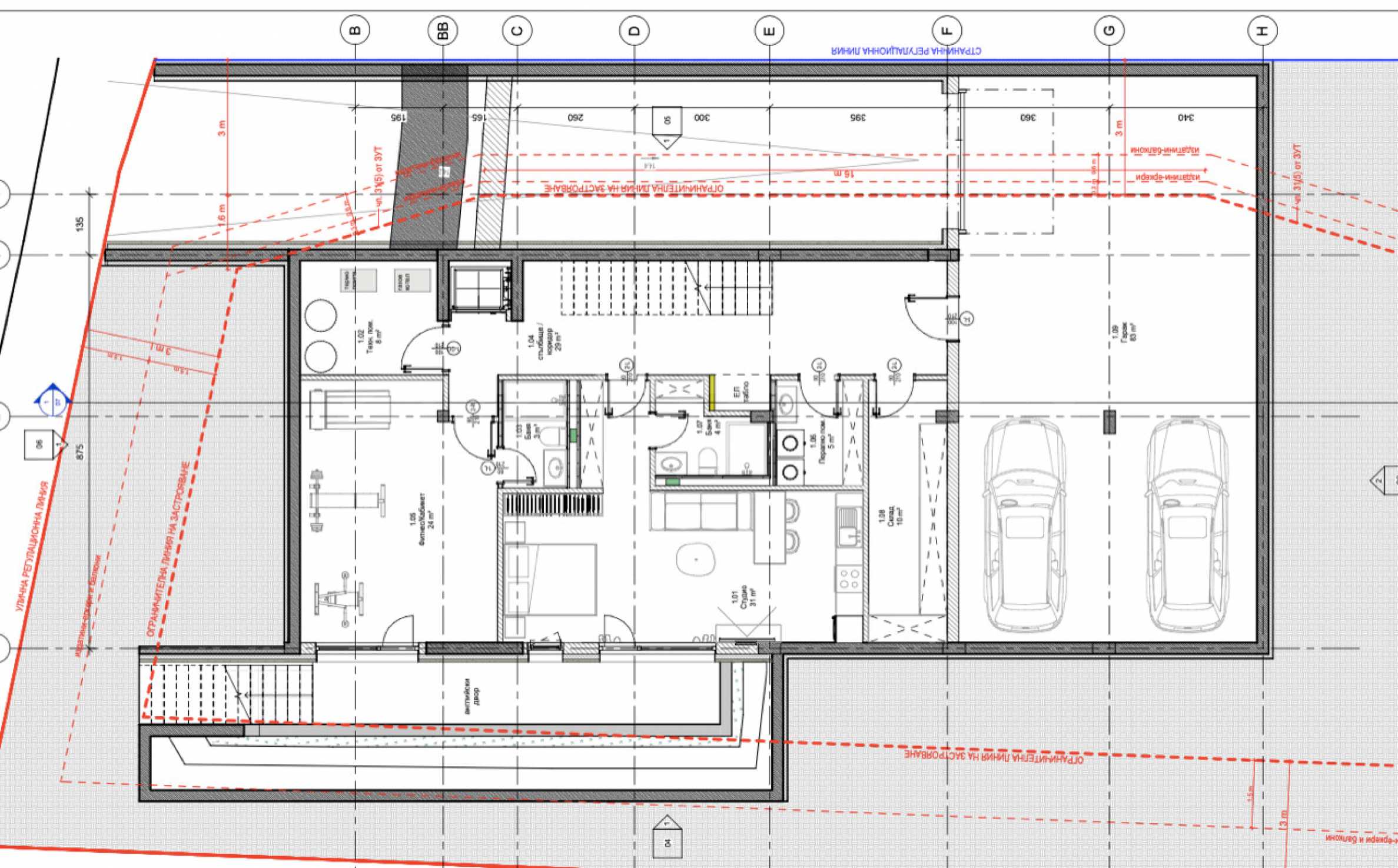 • ниво сутерен (-1) – гараж с възможност за паркиране на четири автомобила, пространство за фитнес и обслужващи помещения;