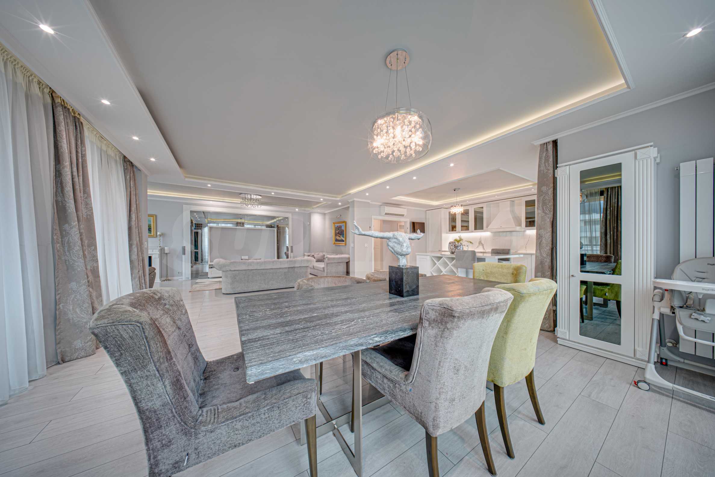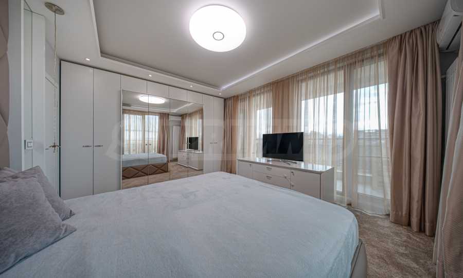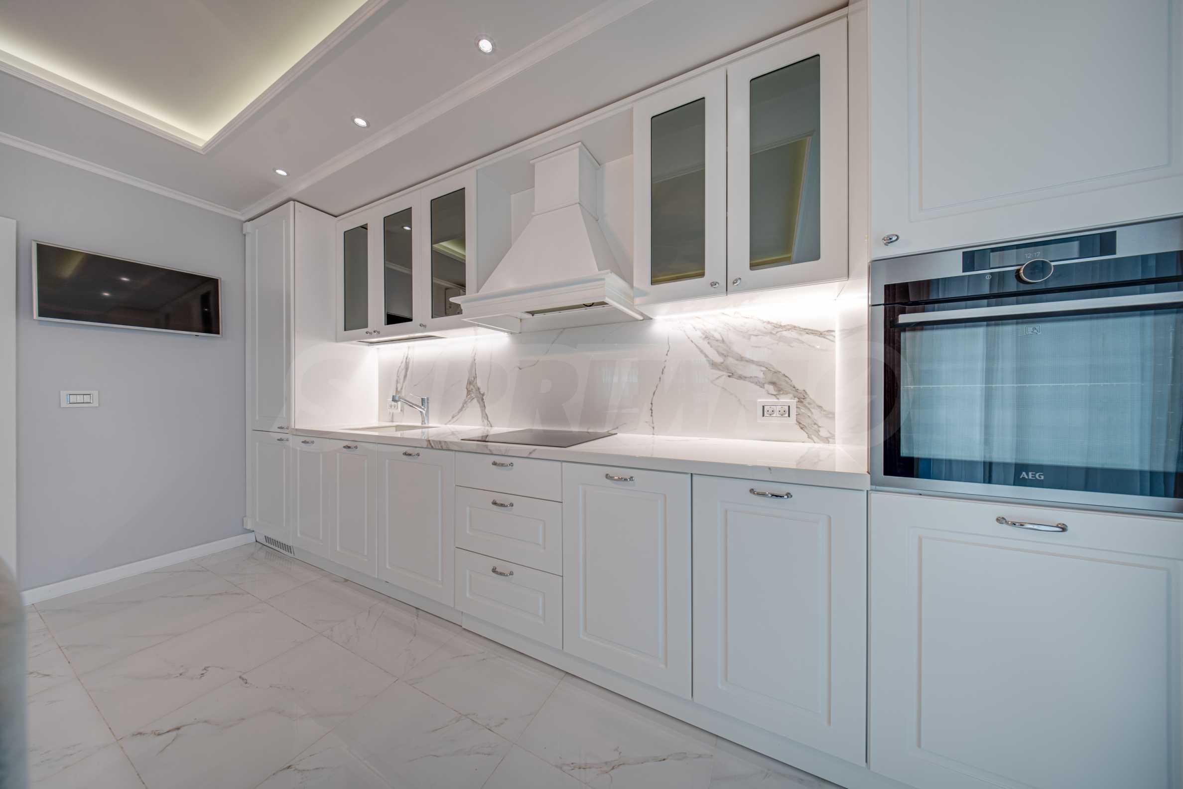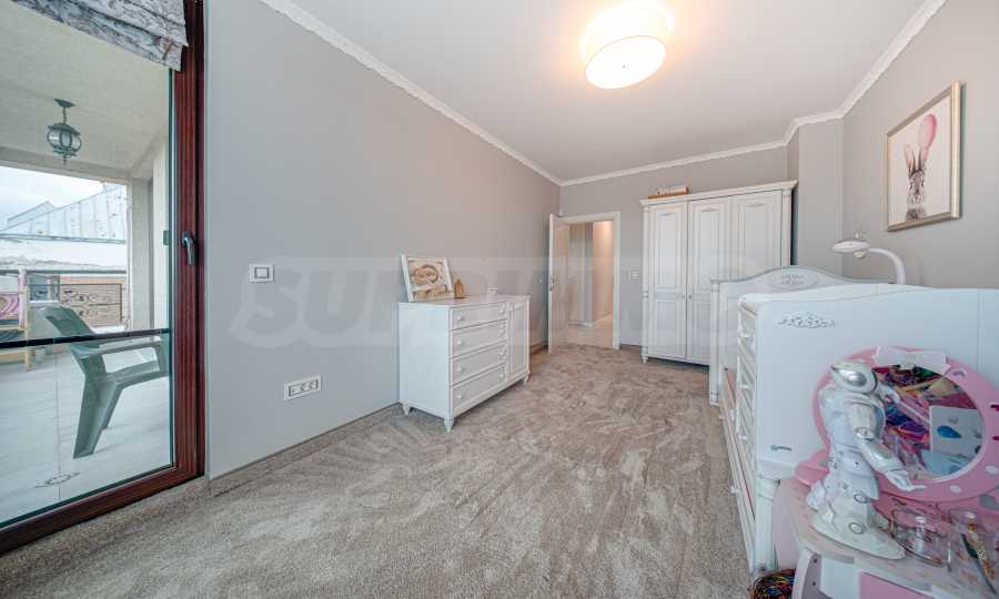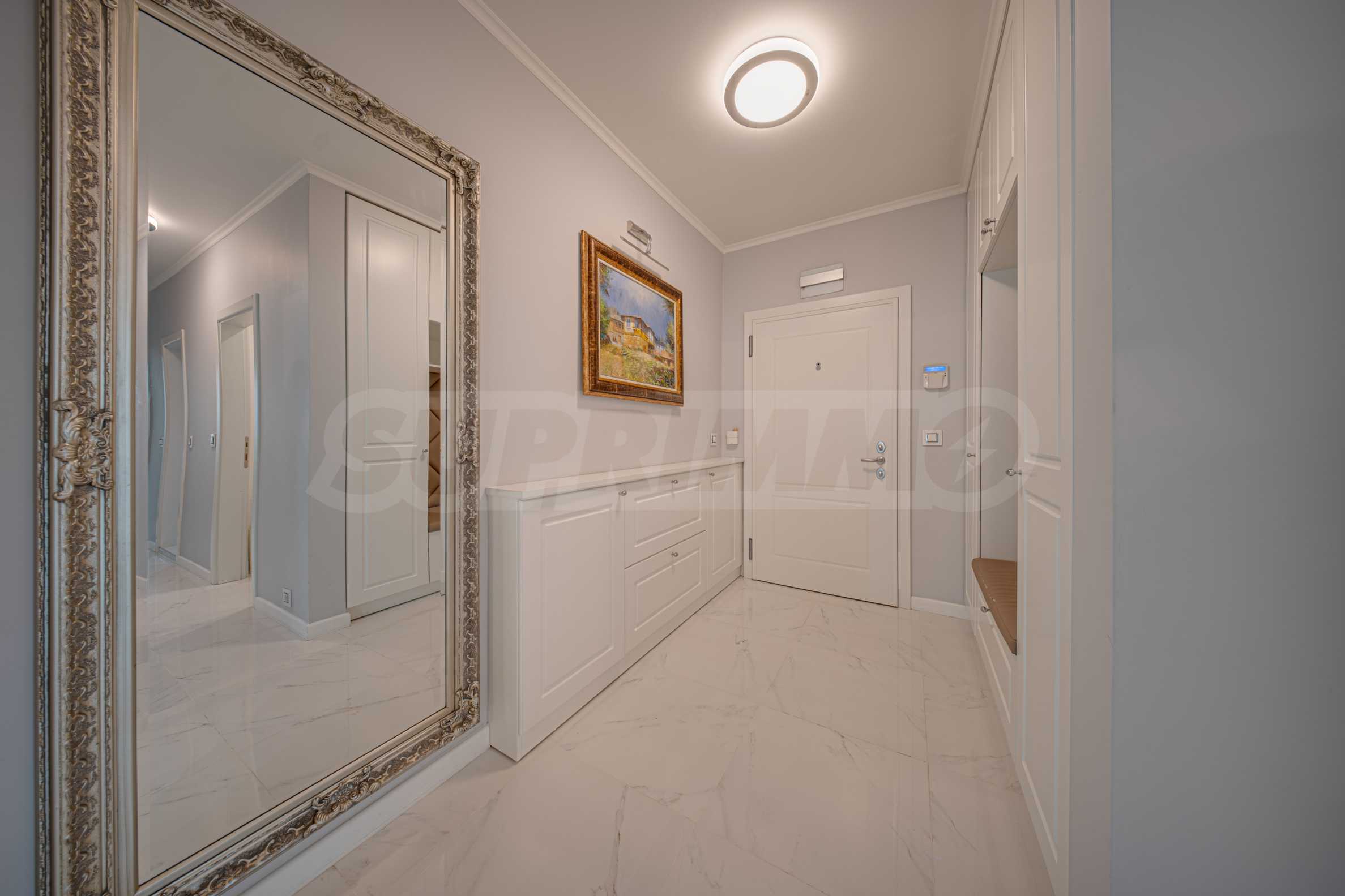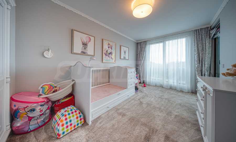 Апартаментът е обзаведен с висок клас материали и оборудван с всички необходими електроуреди. Интериорът е реализиран по дизайнерски проект, детската стая е обзаведена с мебели Cilek. Трапезната маса и столовете са от Kare, баните са изпълнени с решения на Keramo, а меката мебел в дневната е изработена по индивидуална поръчка.