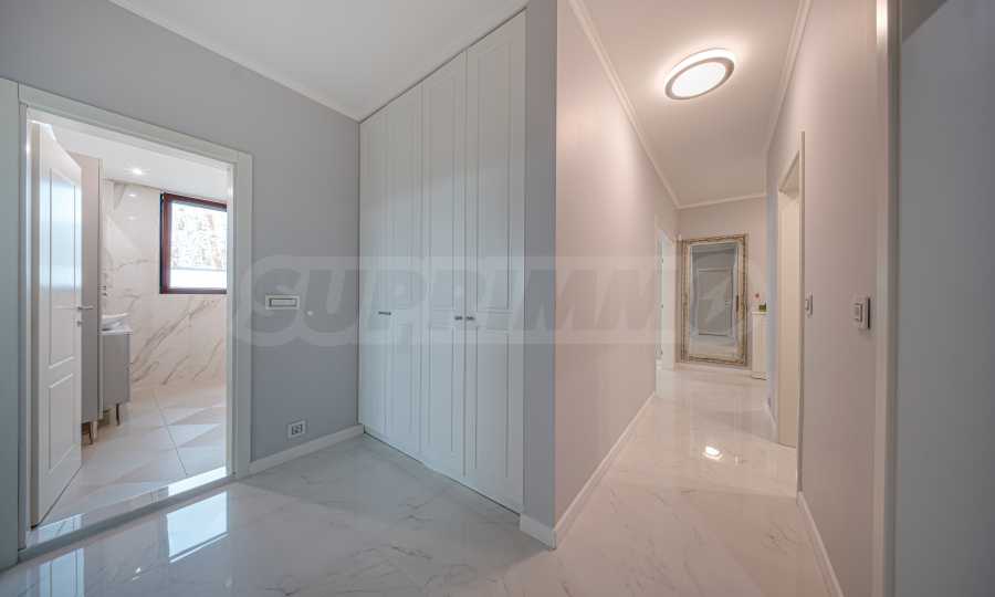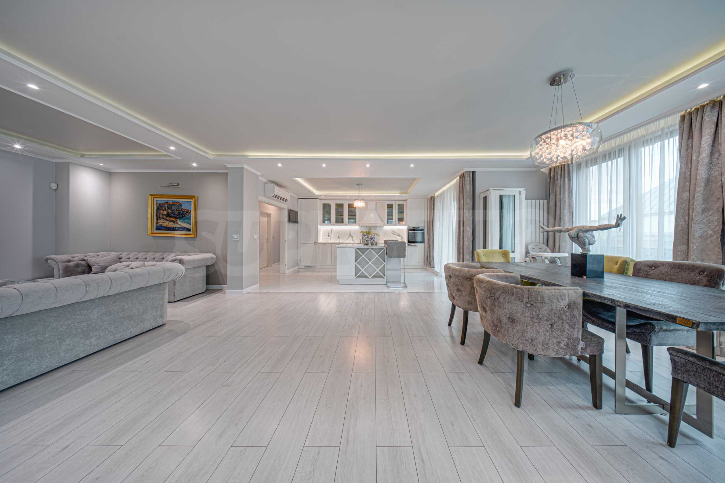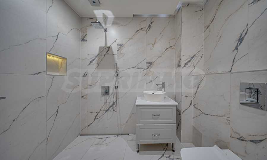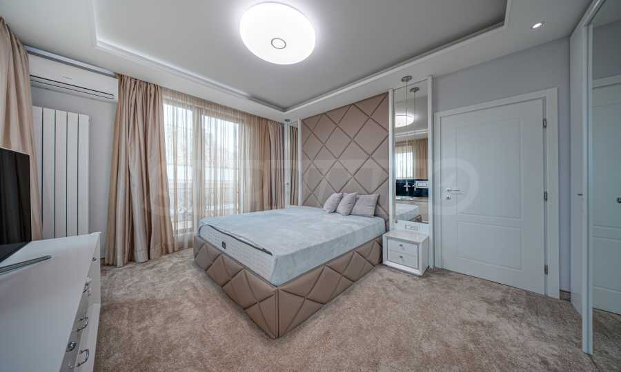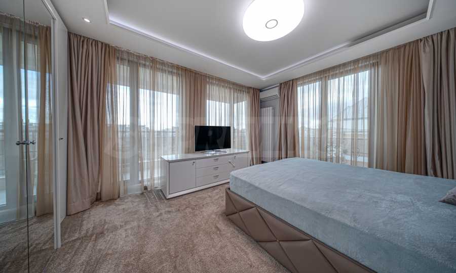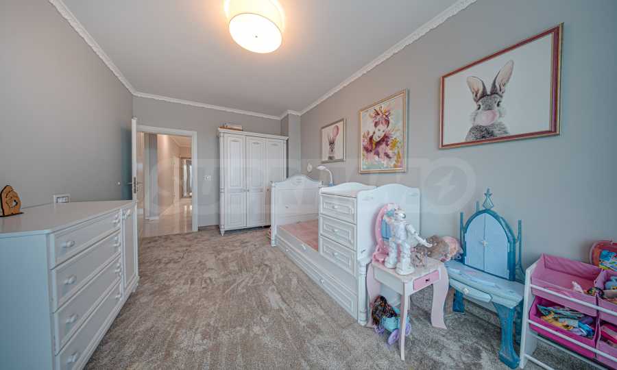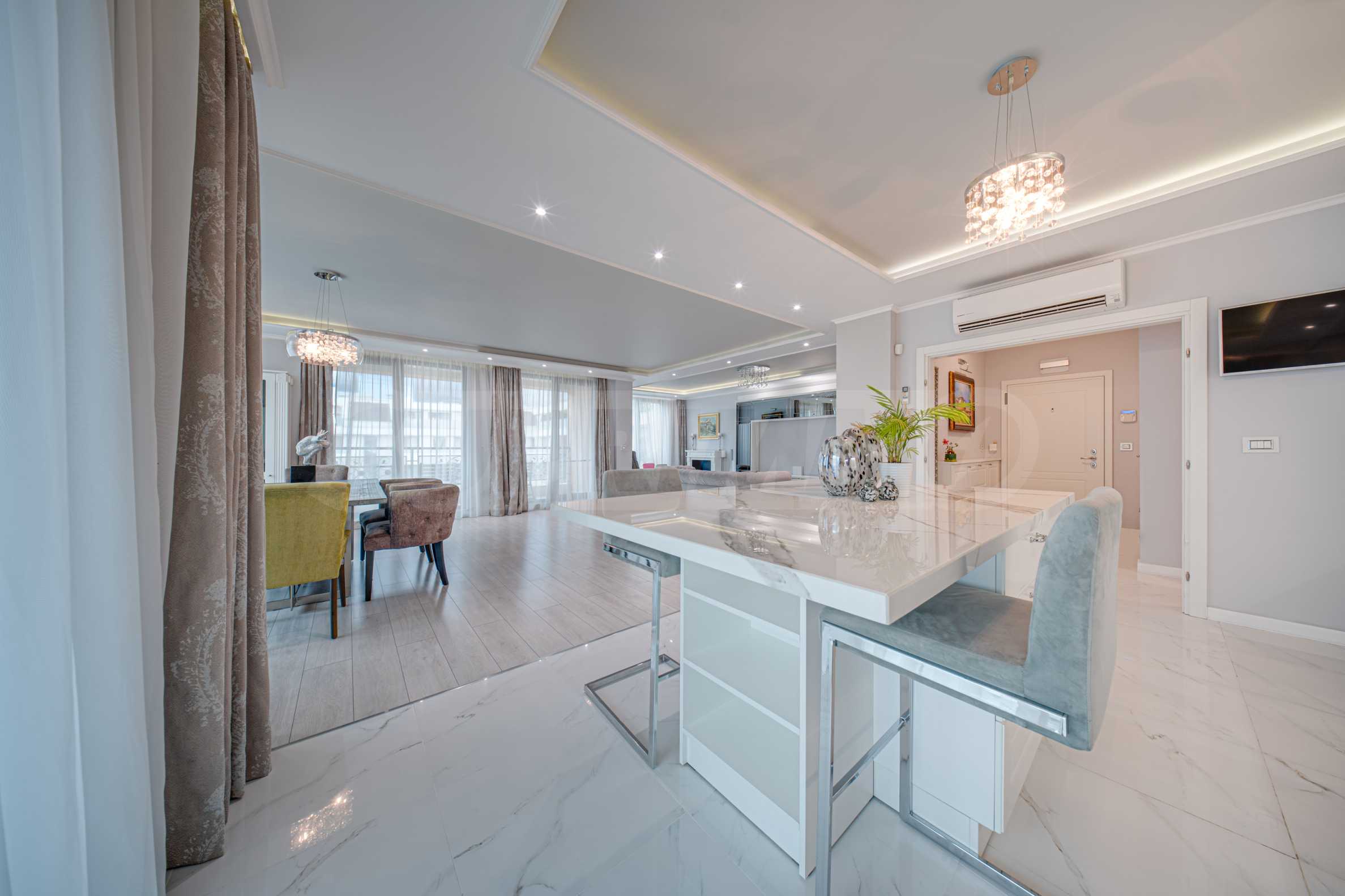 Апартаментът е обзаведен с висок клас материали и оборудван с всички необходими електроуреди. Интериорът е реализиран по дизайнерски проект, детската стая е обзаведена с мебели Cilek. Трапезната маса и столовете са от Kare, баните са изпълнени с решения на Keramo, а меката мебел в дневната е изработена по индивидуална поръчка.