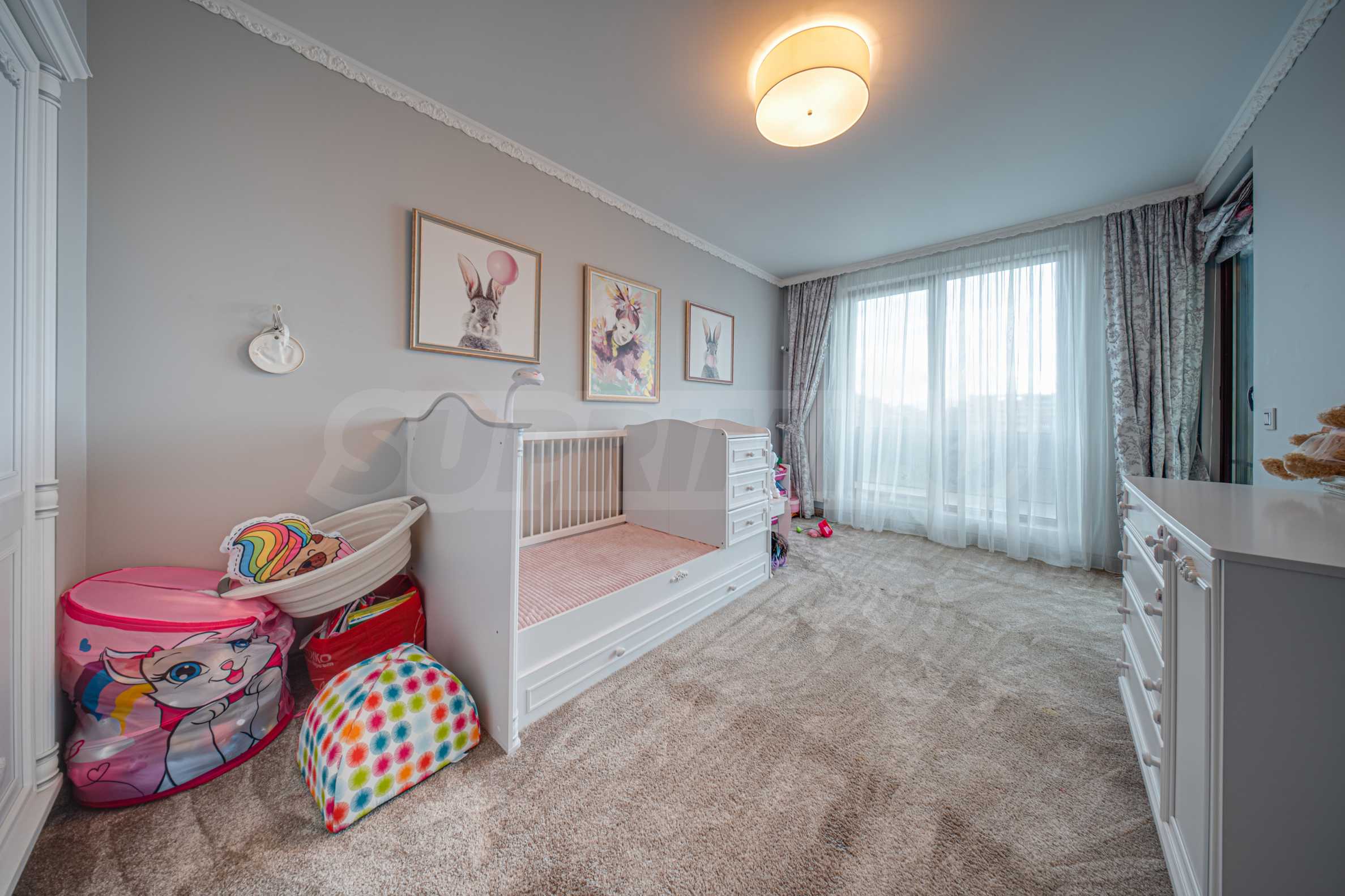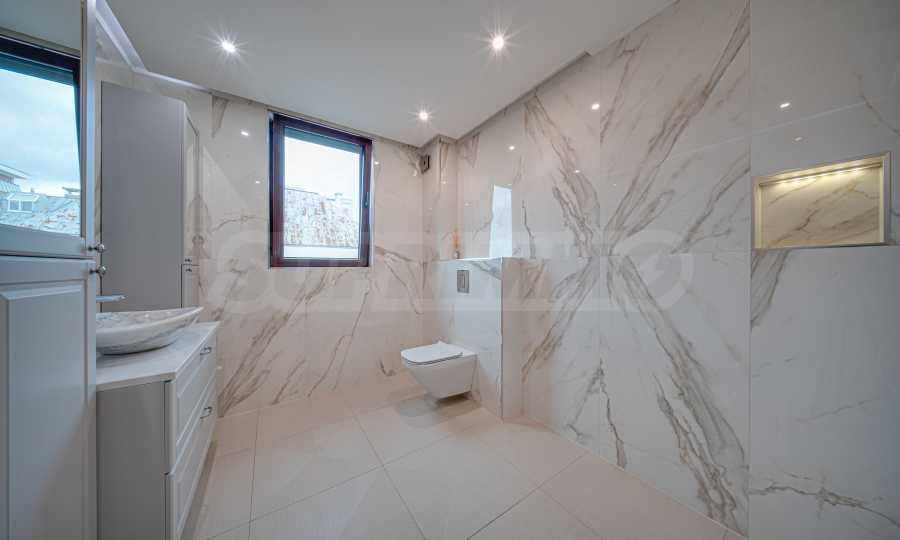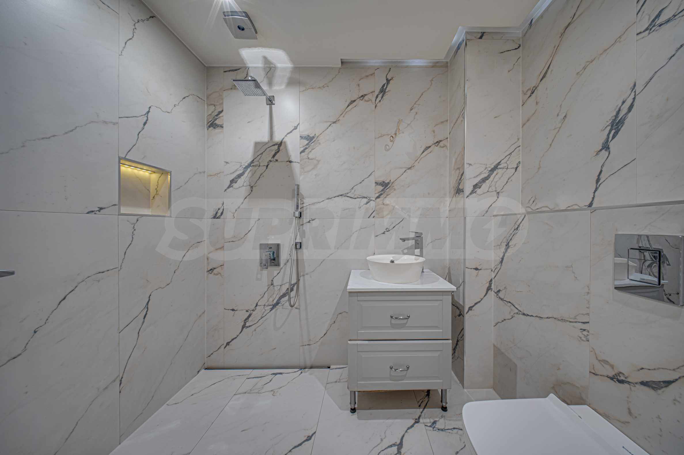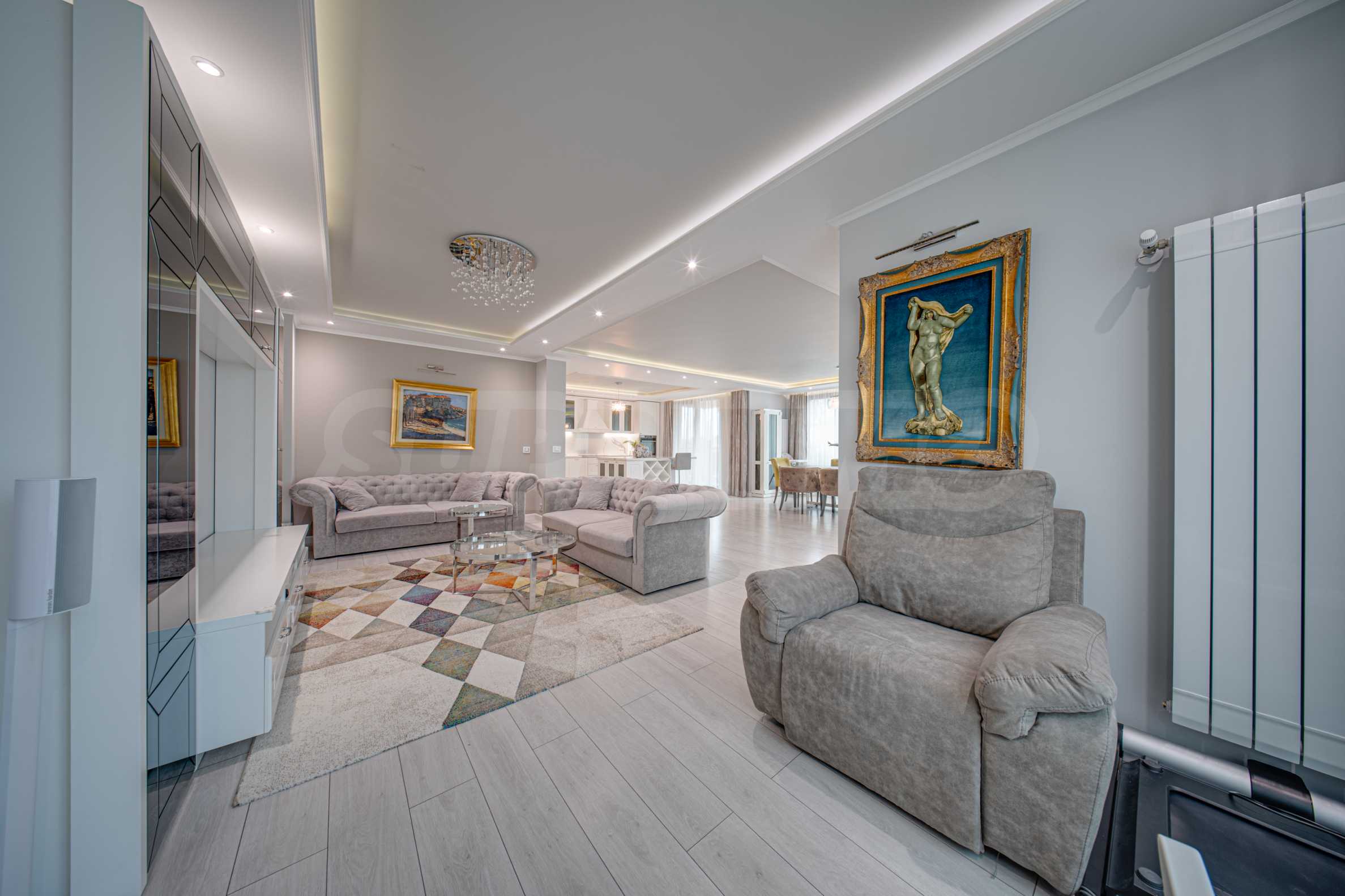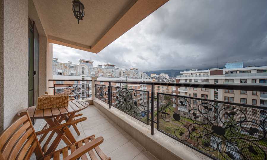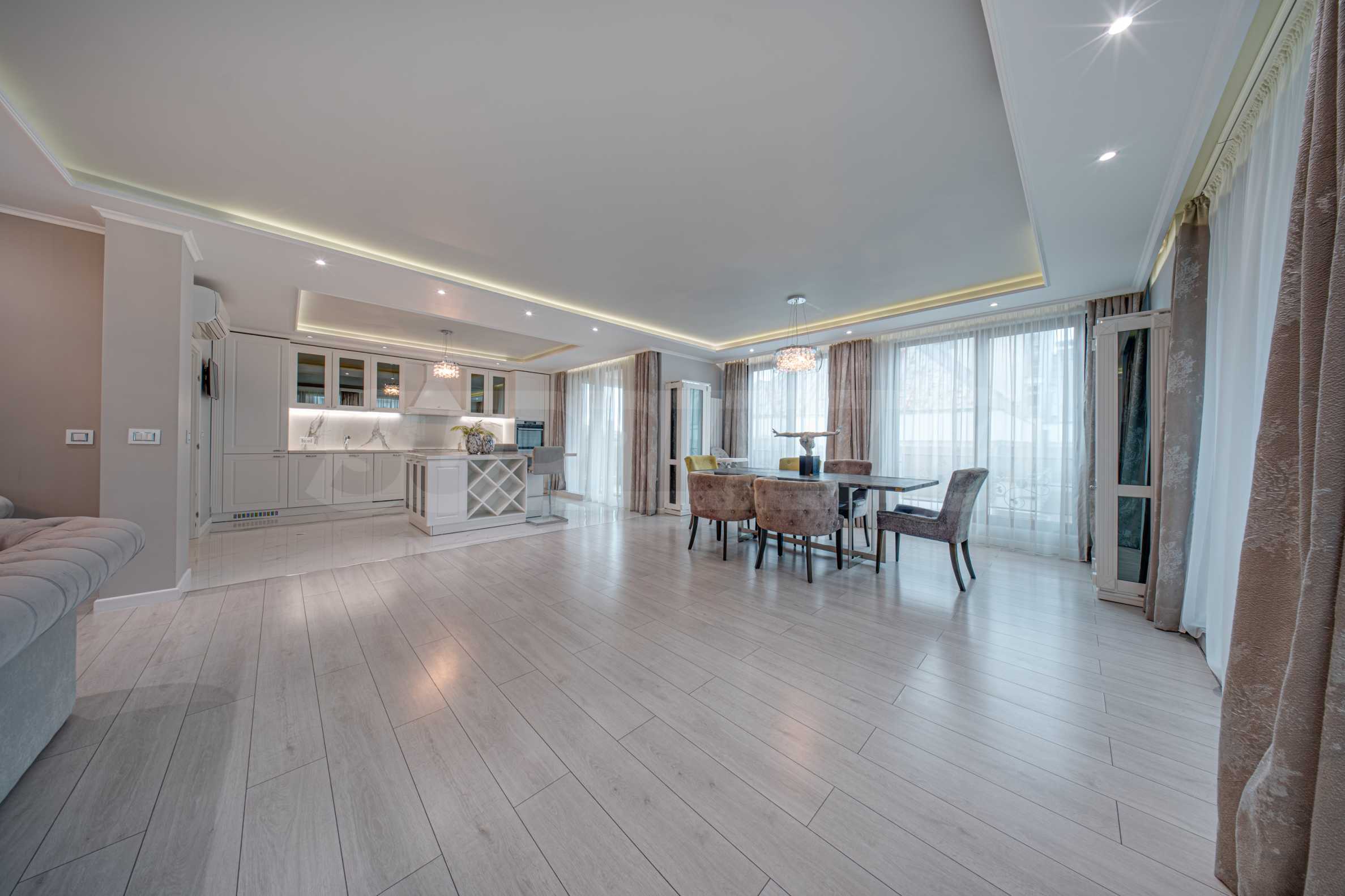 Апартаментът е обзаведен с висок клас материали и оборудван с всички необходими електроуреди. Интериорът е реализиран по дизайнерски проект, детската стая е обзаведена с мебели Cilek. Трапезната маса и столовете са от Kare, баните са изпълнени с решения на Keramo, а меката мебел в дневната е изработена по индивидуална поръчка.