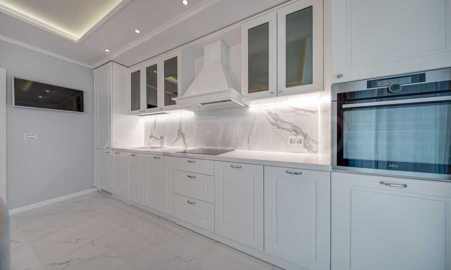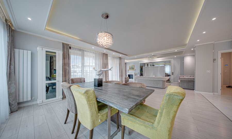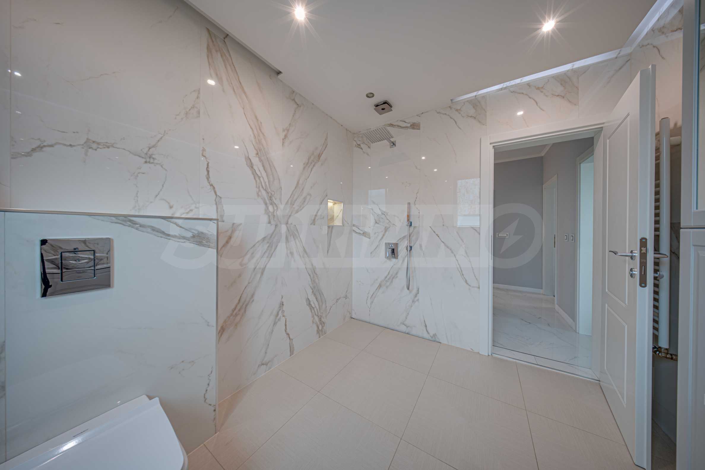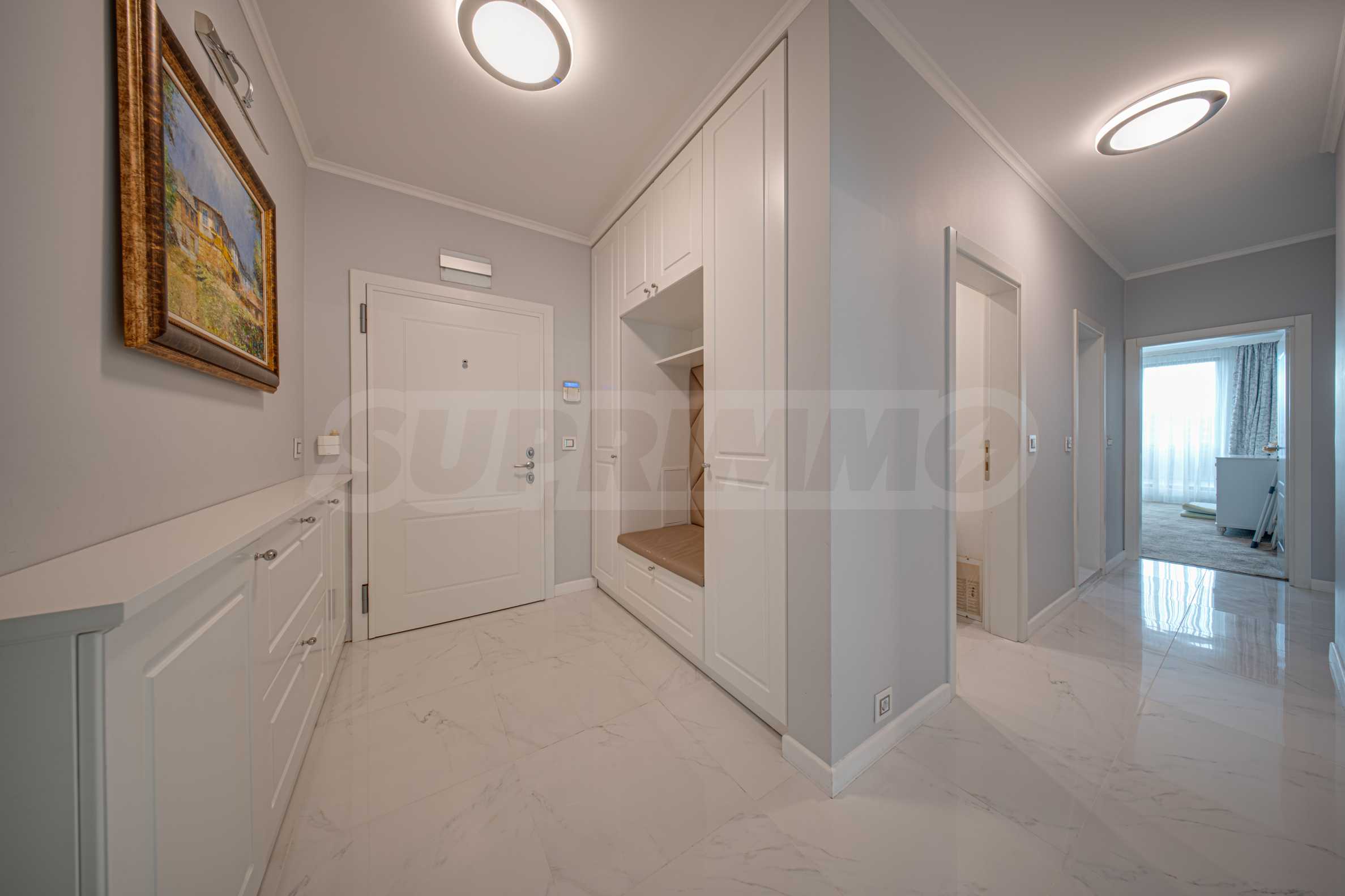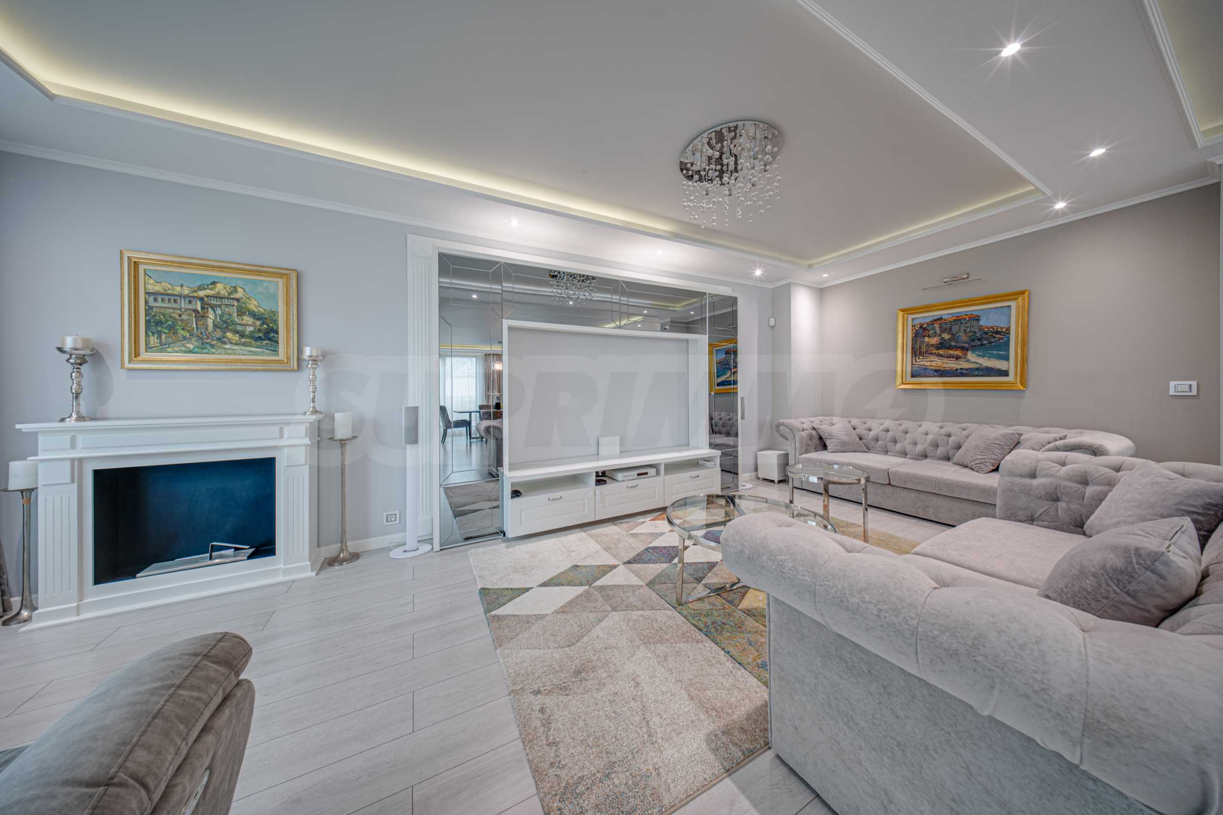 Апартаментът е обзаведен с висок клас материали и оборудван с всички необходими електроуреди. Интериорът е реализиран по дизайнерски проект, детската стая е обзаведена с мебели Cilek. Трапезната маса и столовете са от Kare, баните са изпълнени с решения на Keramo, а меката мебел в дневната е изработена по индивидуална поръчка.