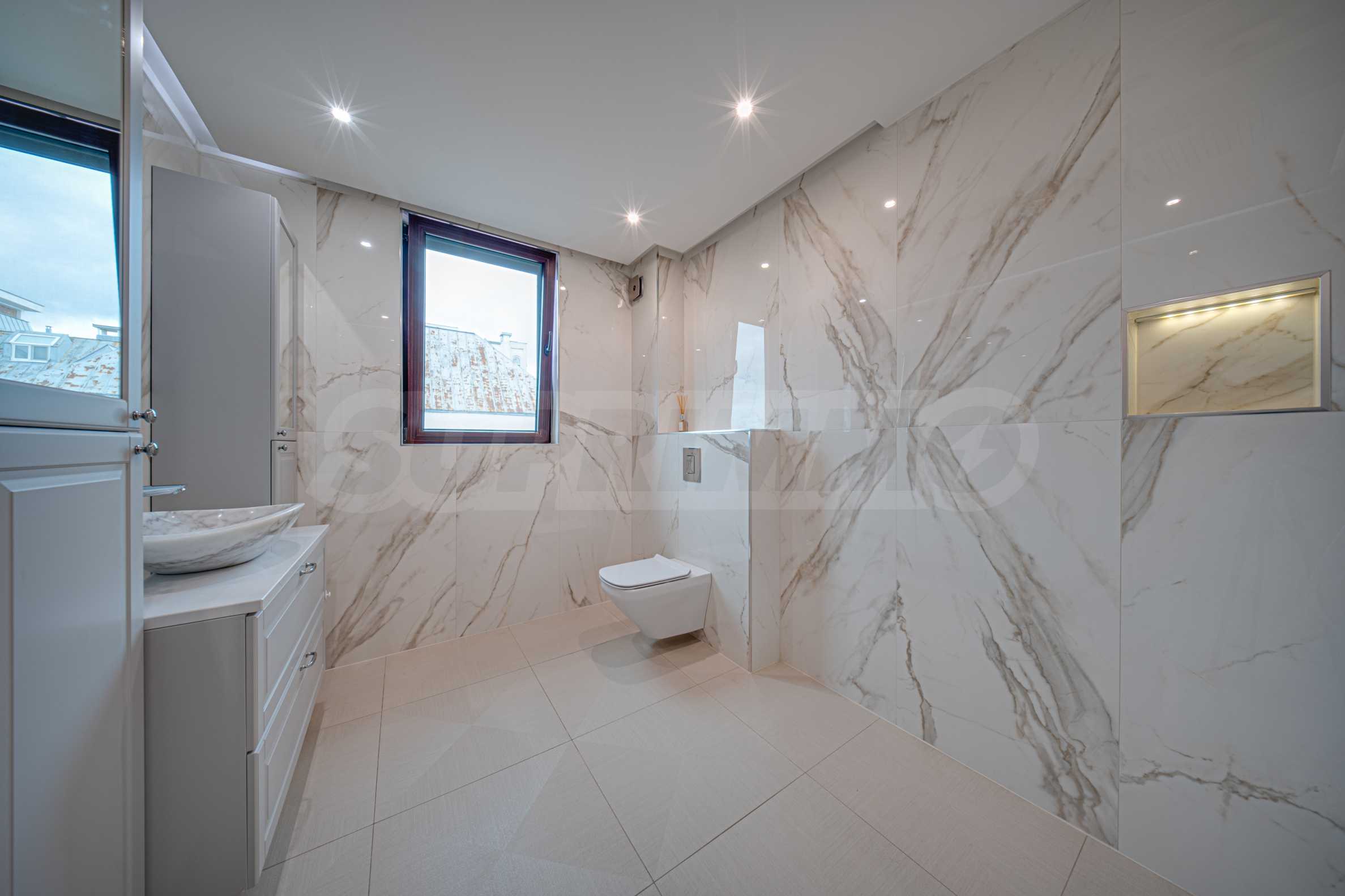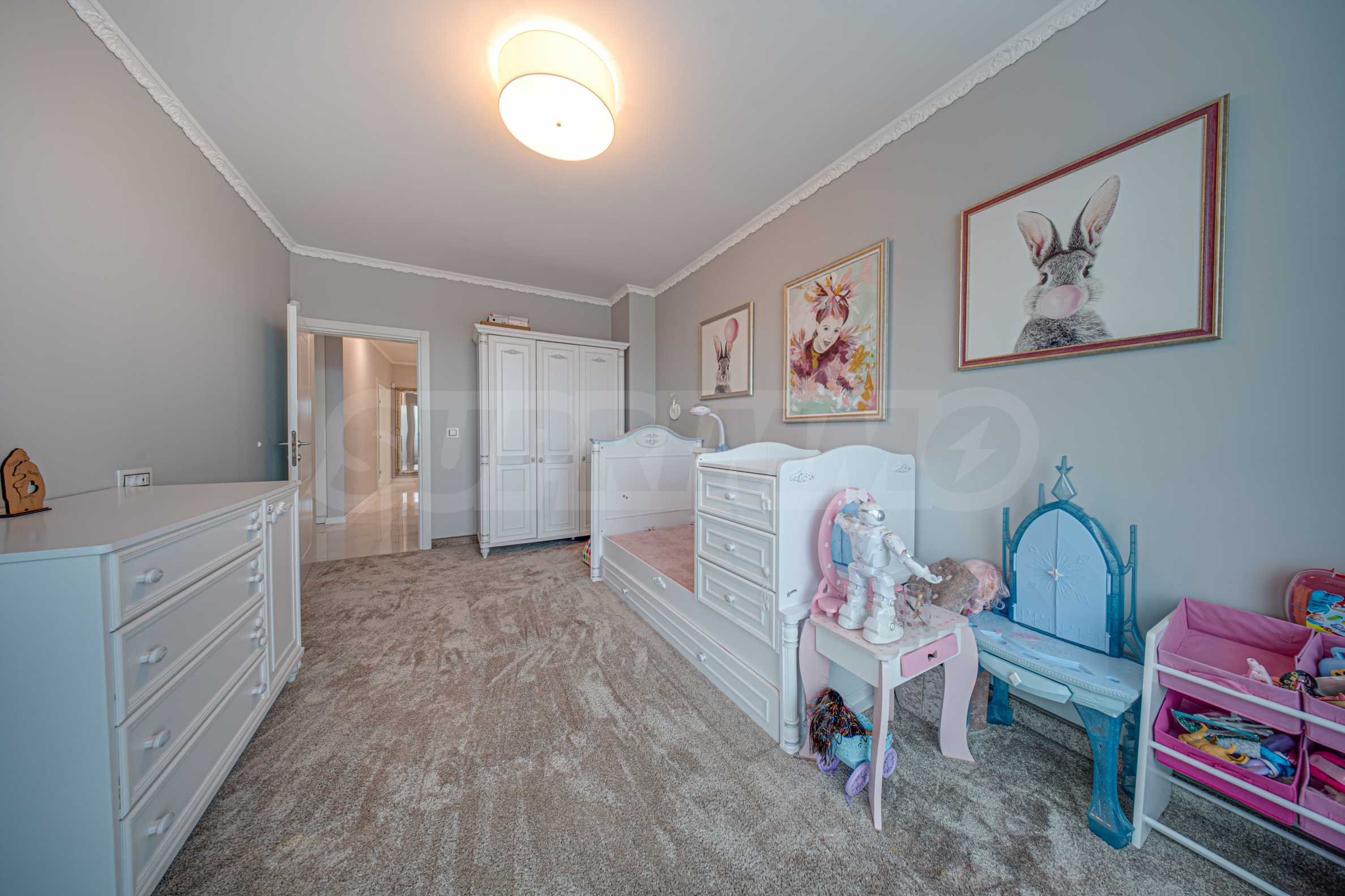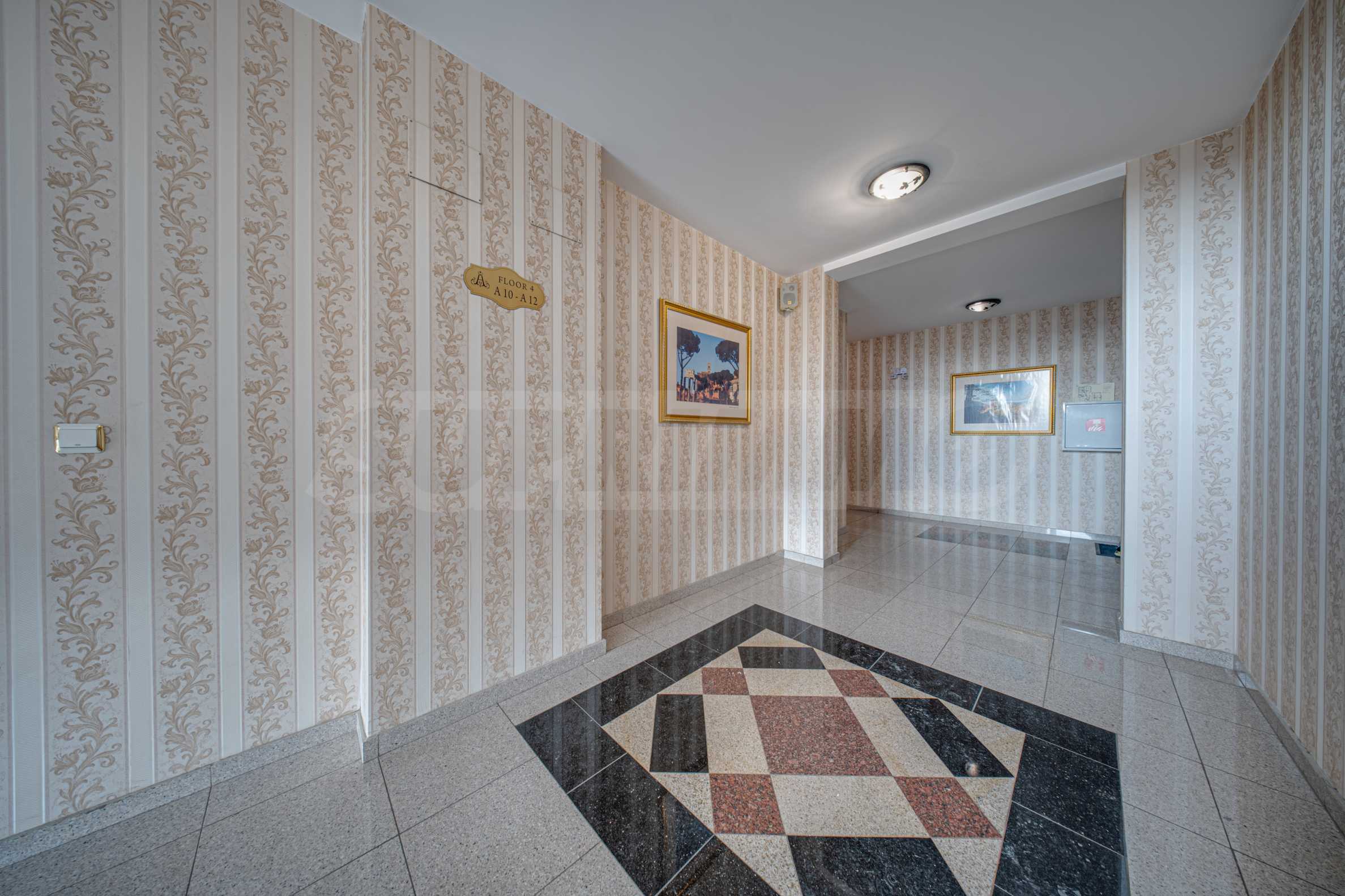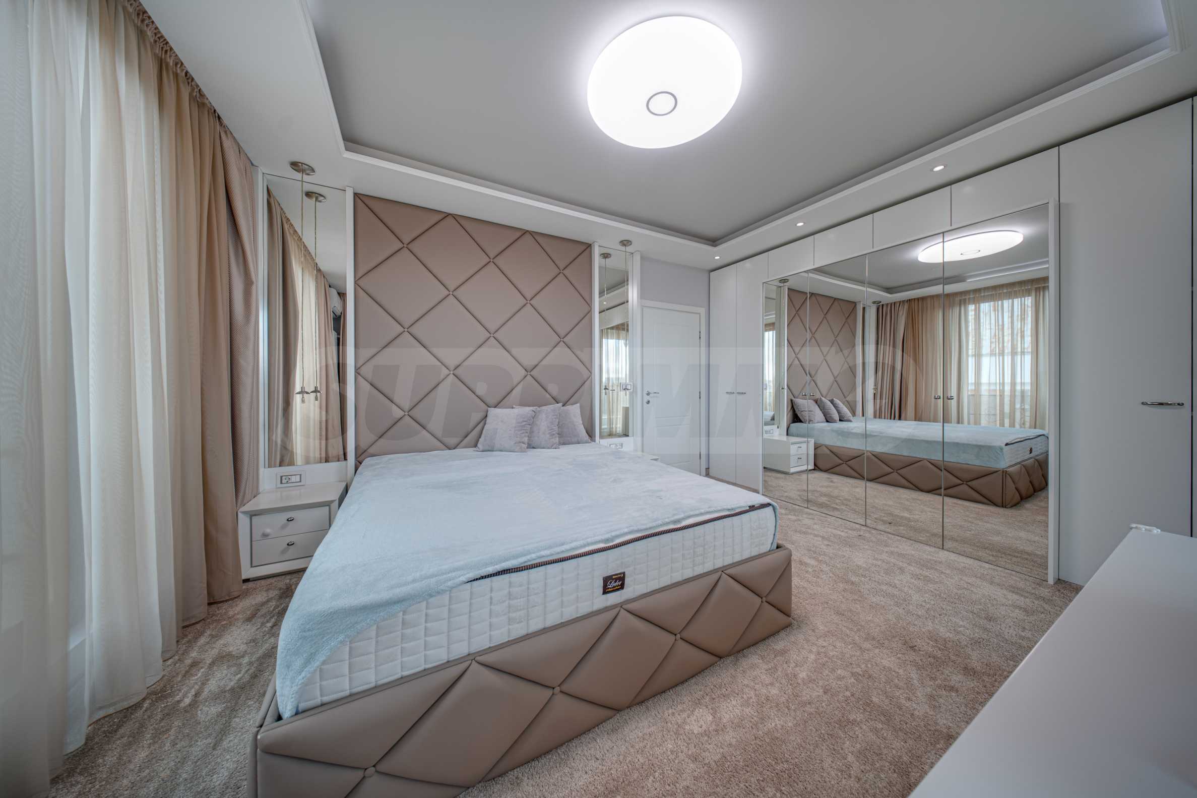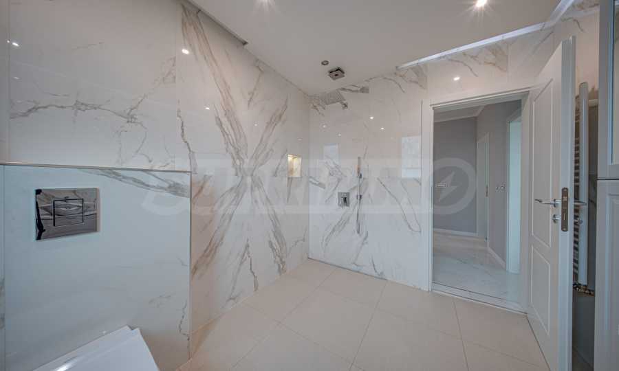 Апартаментът е обзаведен с висок клас материали и оборудван с всички необходими електроуреди. Интериорът е реализиран по дизайнерски проект, детската стая е обзаведена с мебели Cilek. Трапезната маса и столовете са от Kare, баните са изпълнени с решения на Keramo, а меката мебел в дневната е изработена по индивидуална поръчка.