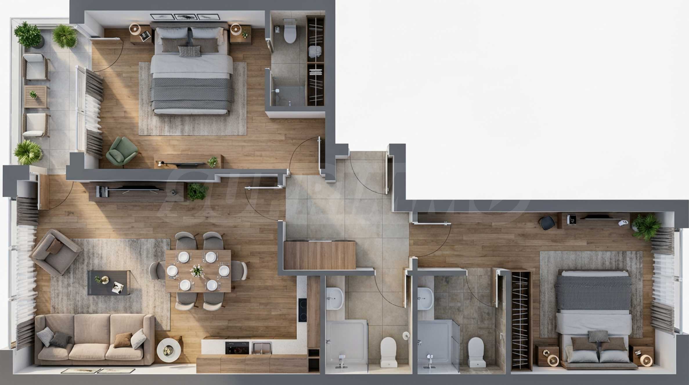Комплексът ще бъде луксозно изпълнен, близо до голям парк, което гарантира вашия релакс и спокойствие. Апартаментите са просторни и с една, две или три спални, предоставяйки комфортно и модерно жилище за вас и вашето семейство.