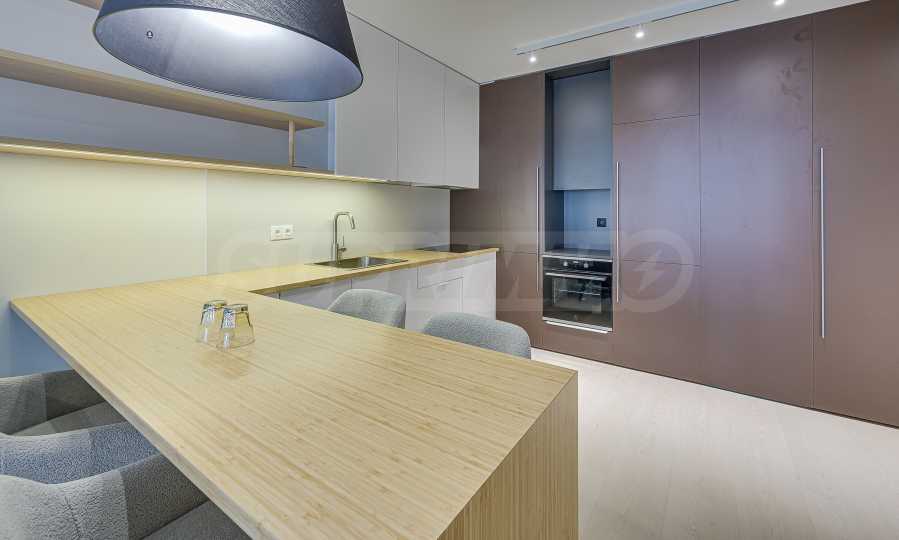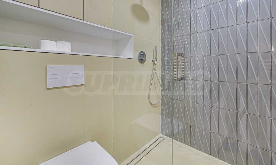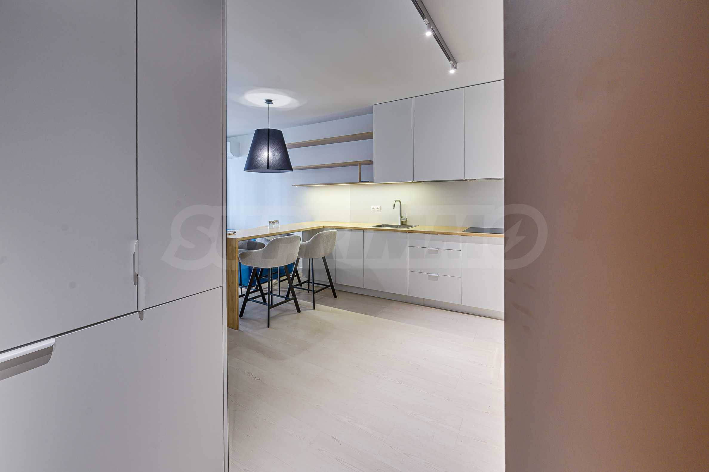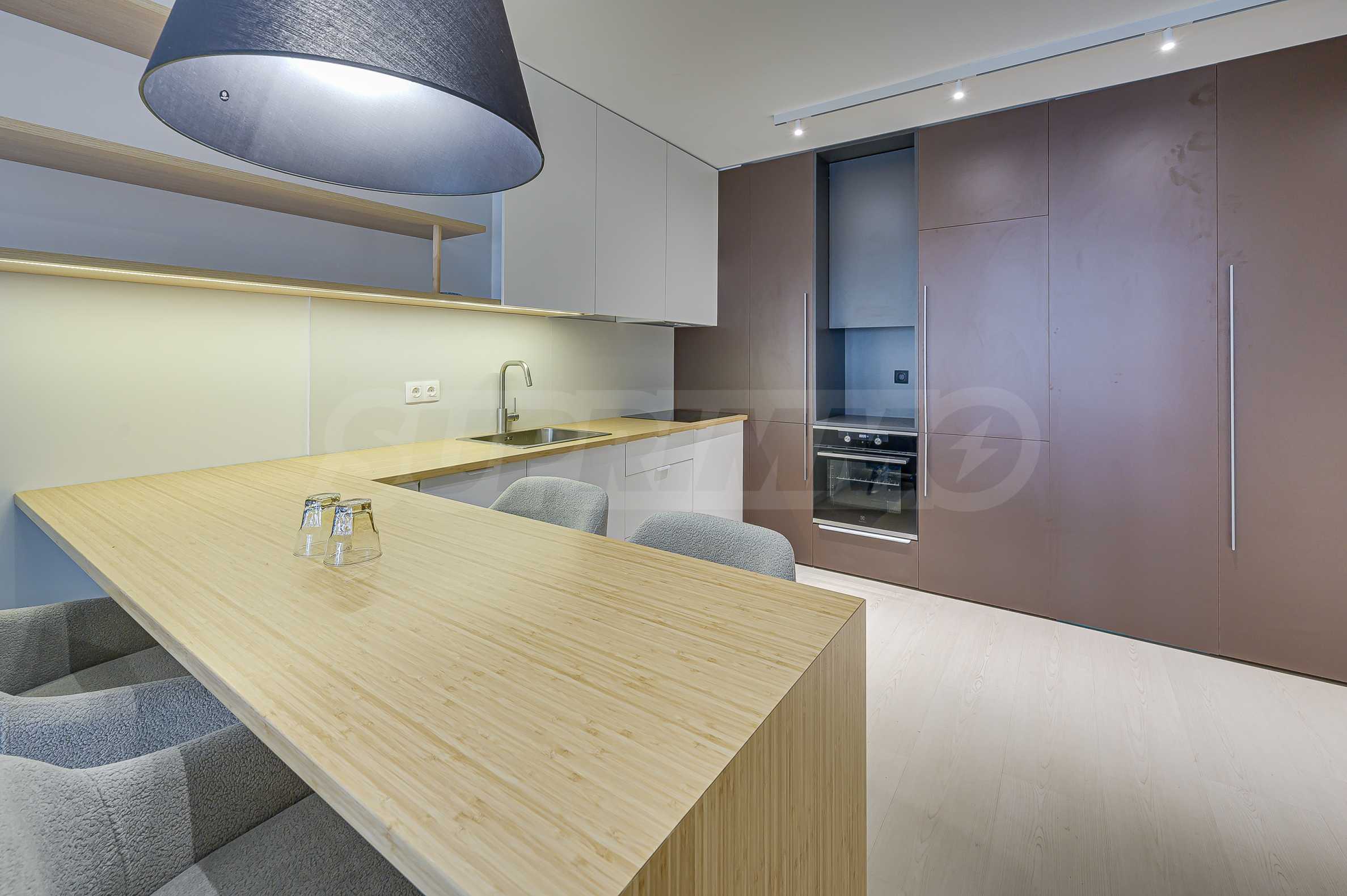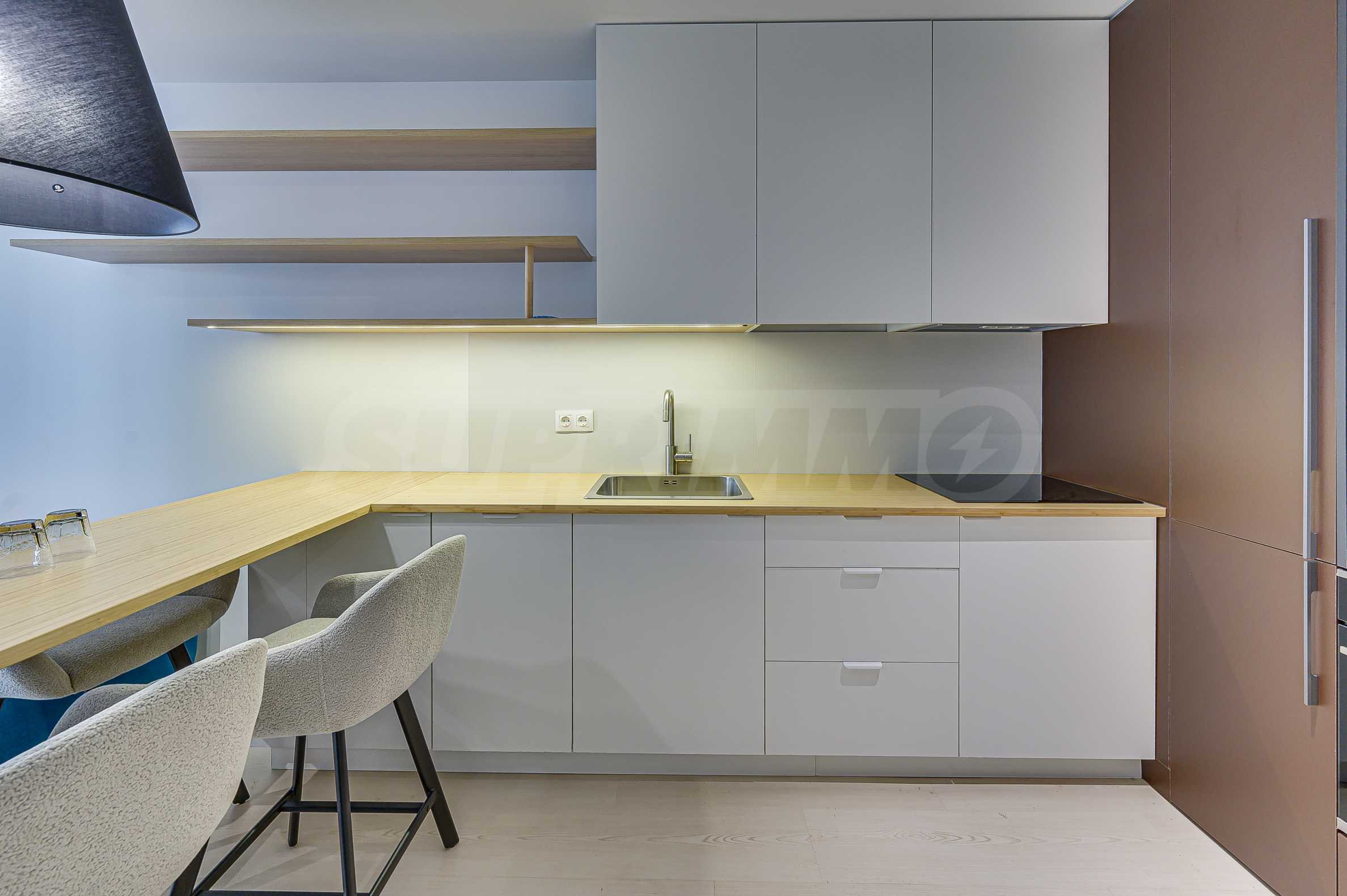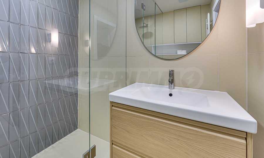 Апартаментът е реализиран по индивидуален проект – всичко е ново, подбрано с внимание към детайла и усещане за елегантен минимализъм. Пространствата са балансирани и функционални.